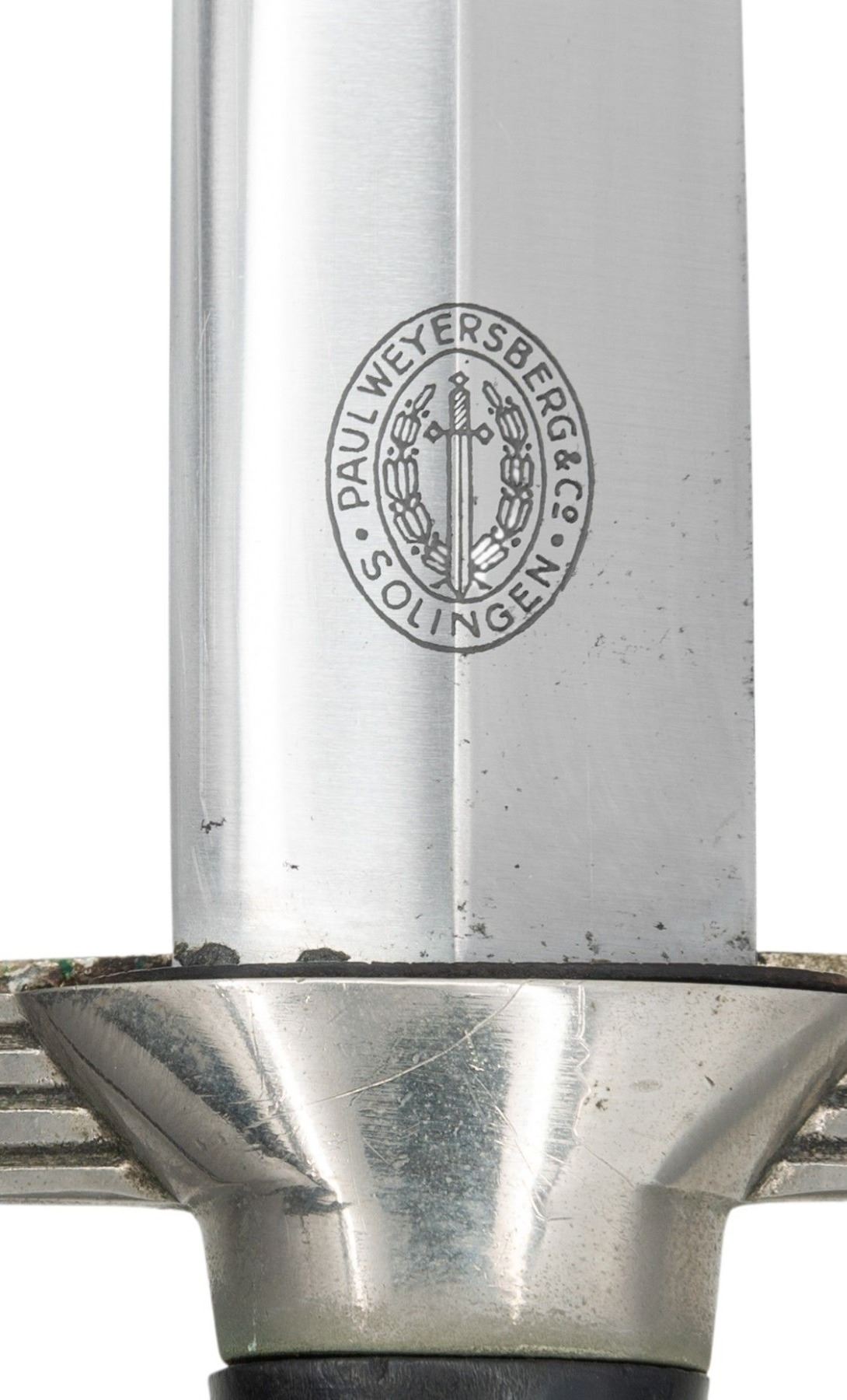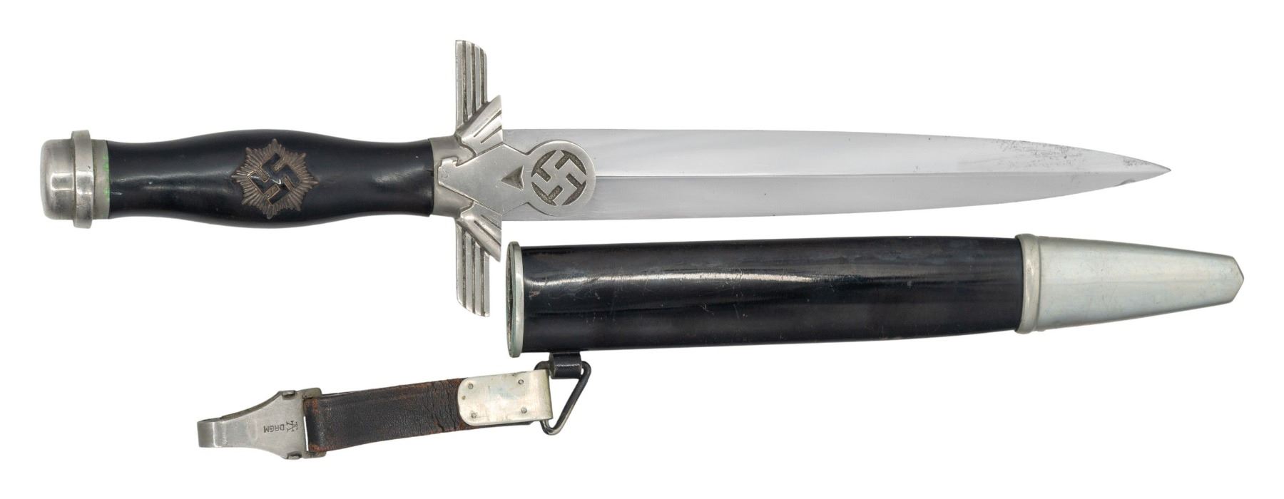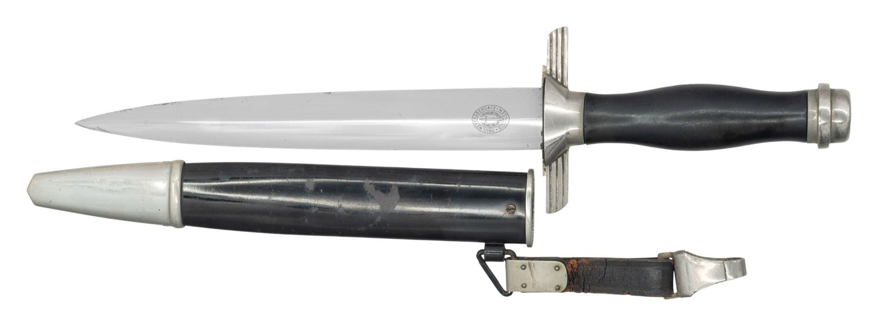 WEYERSBERG.A fine WWII German 2nd model RLB subordinate dagger with an overall length of 14 1/2". Plain blade marked " PAUL WEYERSBERG & Co SOLINGEN (logo)". Nickel silver eagle crossguard with raised ring pommel. Dark wood grip with central black enameled Luftschutz star. Black enameled scabbard with plated mounts. Complete with original hanger. CONDITION: blade has original factory polish with very minor scabbard wear. Hilt shows light wear and the black enameled star is a little scuffed. Scabbard shows light wear and the hanger leather is a bit flaked. (02-24954/BF). NON-GUN. $800-1,200.