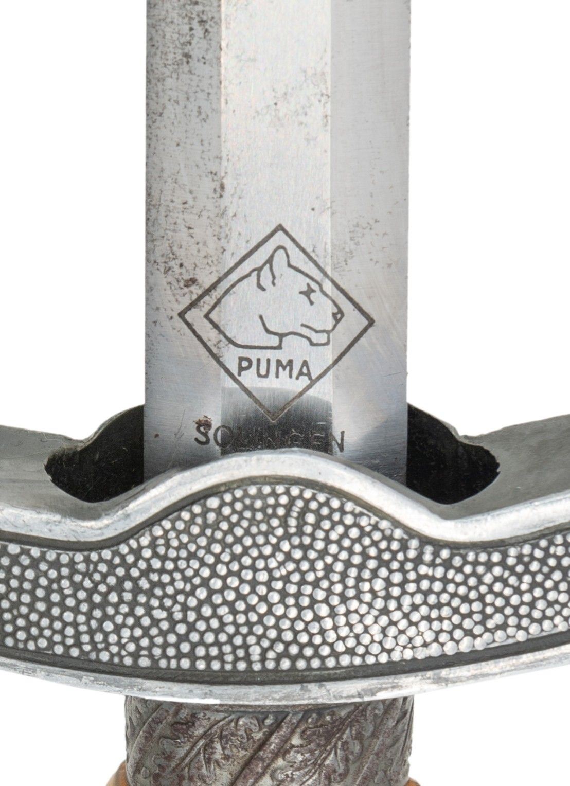 Pumawerke Lauterjung & Sohn (PUMA) was founded by Johann Wilhelm Lauterjung and registered as a trademark in Solingen. During WWII the company produced daggers for the NSDAP and Wehrmacht. They survived the war and continue to produce modern knives today. This example has airplane gray plated aluminum guard and pommel embellished with an oak leaf and acorn motif and Luftwaffe eagle guard. The with light orange grips wrapped in aluminum wire. The blade carries the trademark of Puma with a diamond encasing a puma head / PUMA. SOLINGEN is marked under the diamond. Steel scabbard with oak leaf and acorn motif, stippled panels, zinc carry bands, steel rings, and double screw throat. CONDITION: overall good+. The blade is good with light scattered pinprick oxidation and some light scabbard rub. Guard and pommel are very good with traces of the airplane gray finish in the sheltered areas. Grips are very good + with some light scuffing on the high edges and minor handling marks. Scabbard is fair with traces of airplane gray plating in the protected areas, light handling marks and a few dings with bend in the bottom 2" of the scabbard. (02-24938/ZAL). NON-GUN. $300-500.