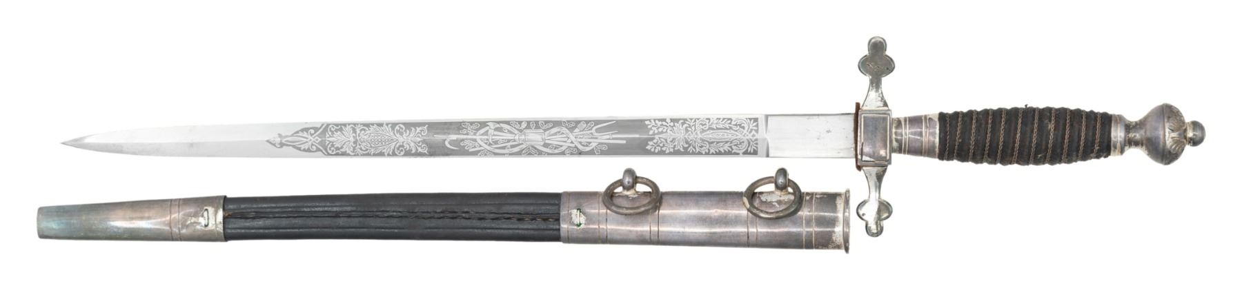 A very nice and rare example of a WWII German Fire Officials dagger measuring 19 1/8" overall with a beautifully etched unmarked blade. Etching includes various fire fighting equipment and foliate motifs. Silvered crossguard with central axe and helmet design. Silvered pommel decorated with oak leaves on the top half. Wire wrapped black leather grip. Black leather scabbard with silvered mounts. CONDITION: blade shows substantial original factory polish. Hilt shows light wear with tarnished areas where plating has worn off. Grip is undamaged but does show light wear. Scabbard is very solid with wear to the plated finish. (02-24934/BF). NON-GUN. $700-1,100.