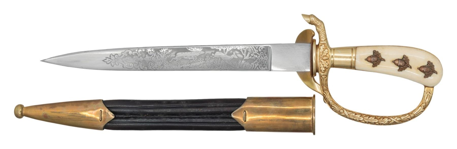 A nice etched Forestry Leader's dagger by Horster measuring 15 3/4" overall with a nicely etched 9 3/4" blade. Etching includes hunting scenes and game animals. The ricasso is marked " E. u. F. HORSTER (logo) SOLINGEN." and the pad is in place. Gilded hilt with an elk on the clam shell guard and a hoof quillon. Oak leaf decorated knuckle bow with a Party eagle on the ferrule. 2-piece off white grip with 3 acorns on each side. Gilded brass mounted leather scabbard with acorn frog stud. CONDITION: blade shows original factory polish. Hilt retains nearly all of its original gilding. Grip shows light wear. Scabbard shows light wear. (02-24918/BF). NON-GUN. $400-700.