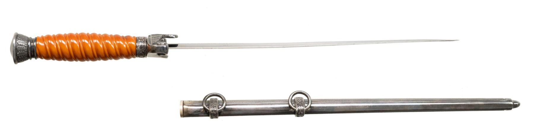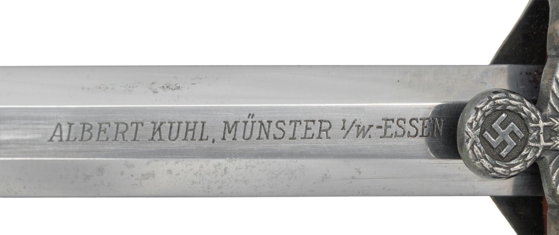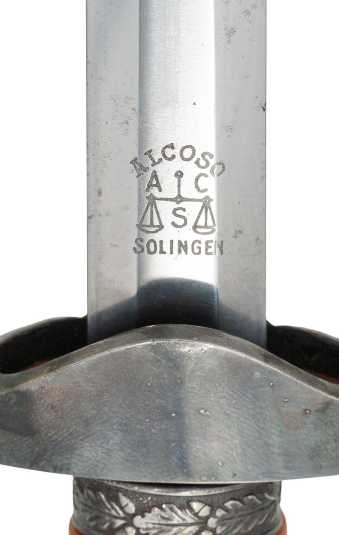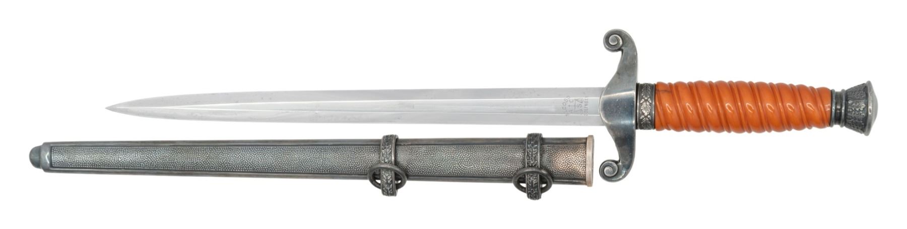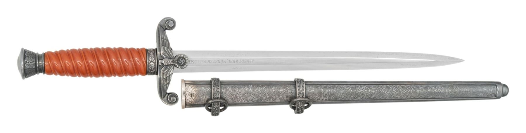 ALBER KUHL DISTRIBUTOR ENGRAVED BLADE. Alexander Coppel Co. (Alcoso) produced large numbers of army pattern daggers during WWII. This example was distributed by ALBERT KUHL, MUSTER I/W ESSEN and is etched as such on the front blade flat. The blade carries the ALCOSO / ACS (surrounding scales) / SOLINGEN trademark. The Alcoso crossguard pattern utilized from 1937-40, ferrules, and 14 leaf narrow neck pommel are silver plated. Pumkin orange solid celluloid grips. The dagger is mated with a silver plated Eickhorn style scabbard with oak leaf motif bands, stippled panels, and single screw thick throat. CONDITION: overall good. Blade is good/fair with polished shallow pits, scabbard scuffing, and very good crisp markings. The blade has a bend when examined from its side profile. Fittings are very good + with some light handling marks and mild bubbling. Grips are good with a small tight 3/8" crack at the guard. The scabbard is very good with the plating showing a nice tarnished silvering. (02-24966/ZAL). NON-GUN. $400-600.