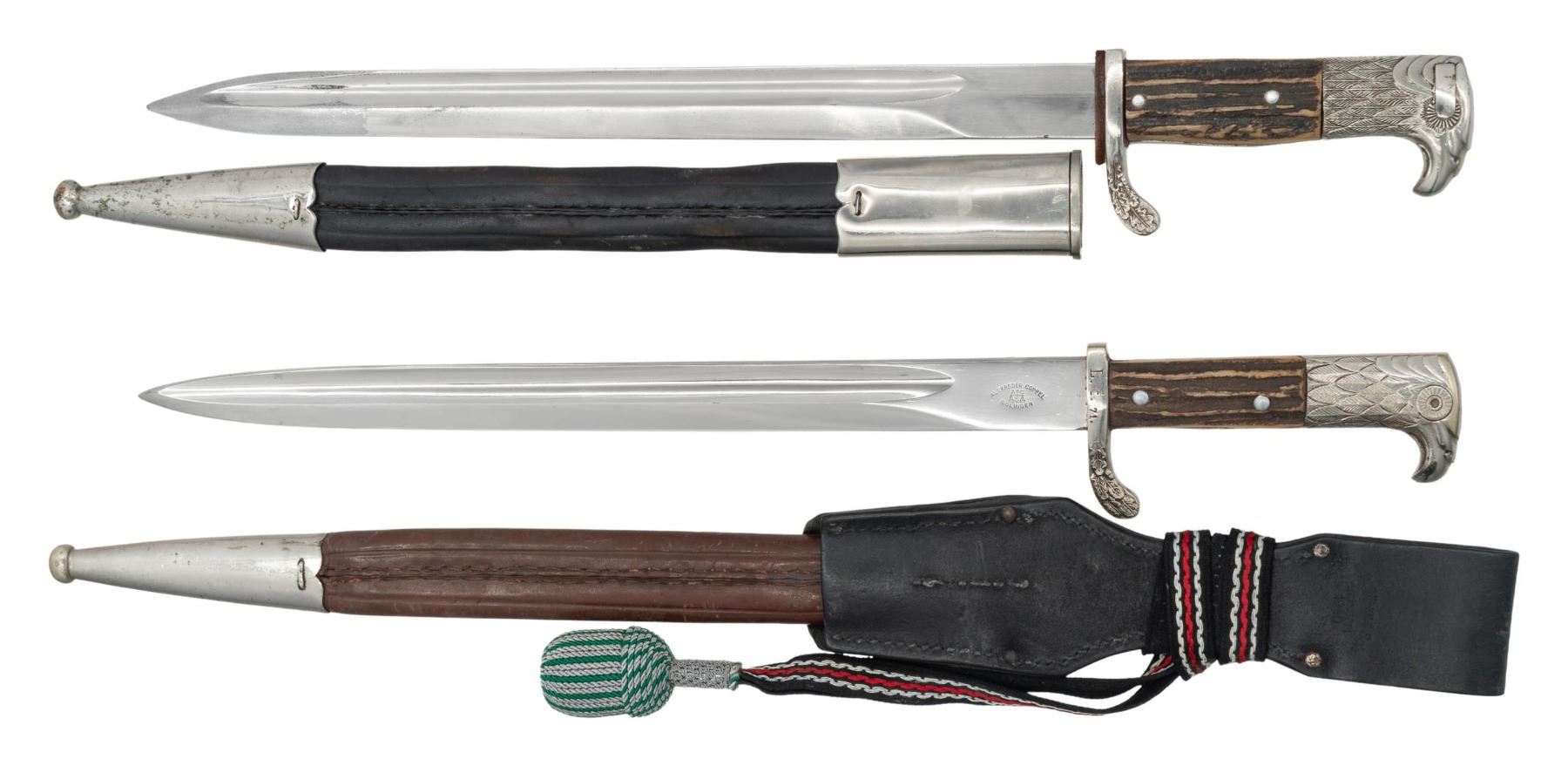 1) This dress bayonet measures 19 1/4" overall with a blade marked " ALEXANDER COPPEL (logo) SOLINGEN " on one side, with " A C (scale) S " on the other. The oak leaf decorated crossguard is stamped "L.E. 71" indicating use by the Rural Constabulary "L" (Landjaegerei), Erfurt district "E". Grips are stag with 2 rivets and a Police eagle and wreath on the front grip. The scabbard throat is marked G. Tr. 6450 indicating earlier use by the Gendarmerie (rural police) Trier district. It is constructed with a brown leather body and nickel plated fittings. It has a black leather frog with 1940's dated makers mark and a black, red and white knot with green and silver tassel. CONDITION: bayonet shows very light overall wear as does the frog and knot. 2) This dress bayonet measures 18 3/4" overall with an unmarked blade. The oak leaf decorated crossguard is unmarked. Stag grips with 2 rivets securing each side. The spine of the blade and the backstrap of the hilt are both stamped "A 660". CONDITION: blade shows very light wear with scabbard marks. Scabbard leather is a bit worn but solid. Hilt shows light wear. (02-24955/BF). NON-GUN. $600-900.