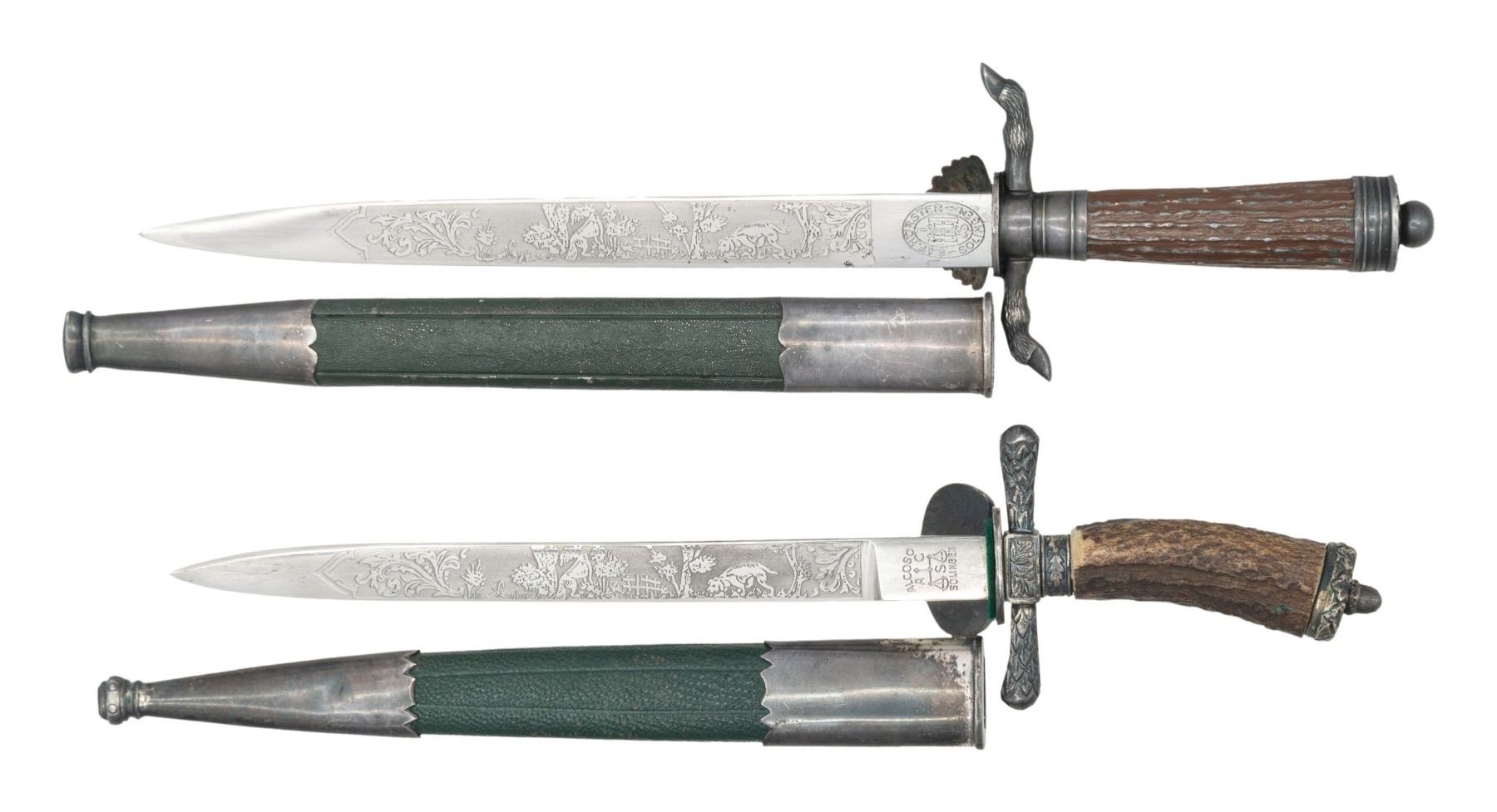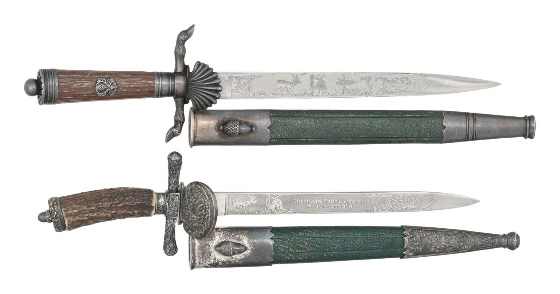 DAGGERS.1) A fine example of a miniature WWII German Hunting Association dagger measuring 9 1/4" overall with a beautifully etched blade marked " E. F. HORSTER (logo) SOLINGEN ". Etching includes various hunting scenes with game animals. Silvered deer leg crossguard with hoof finials and down turned scallop shell guard. Silvered pommel and ferrule. Simulated horn grip with Hunting Association insignia on front grip. Scabbard body appears to be dark green painted brass with silver plated mounts and an acorn frog stud. CONDITION: the dagger and scabbard show very light wear. 2) A fine example of a miniature WWII German Hunting Association dagger measuring 8 3/8" overall with a beautifully etched blade marked " ALCOSO (logo) SOLINGEN ". Etching includes various hunting scenes with game animals and a panel that reads " Chemische Fabrik Vorhalle Hagen-Vorhalle ". Silvered embellished crossguard and down turned shell guard. Embellished silvered pommel and ferrule. Horn grip. Scabbard body appears to be dark green leather over iron with silver plated mounts and an acorn frog stud. CONDITION: the dagger and scabbard show very light wear. (02-24988-1/BF). $400-700.