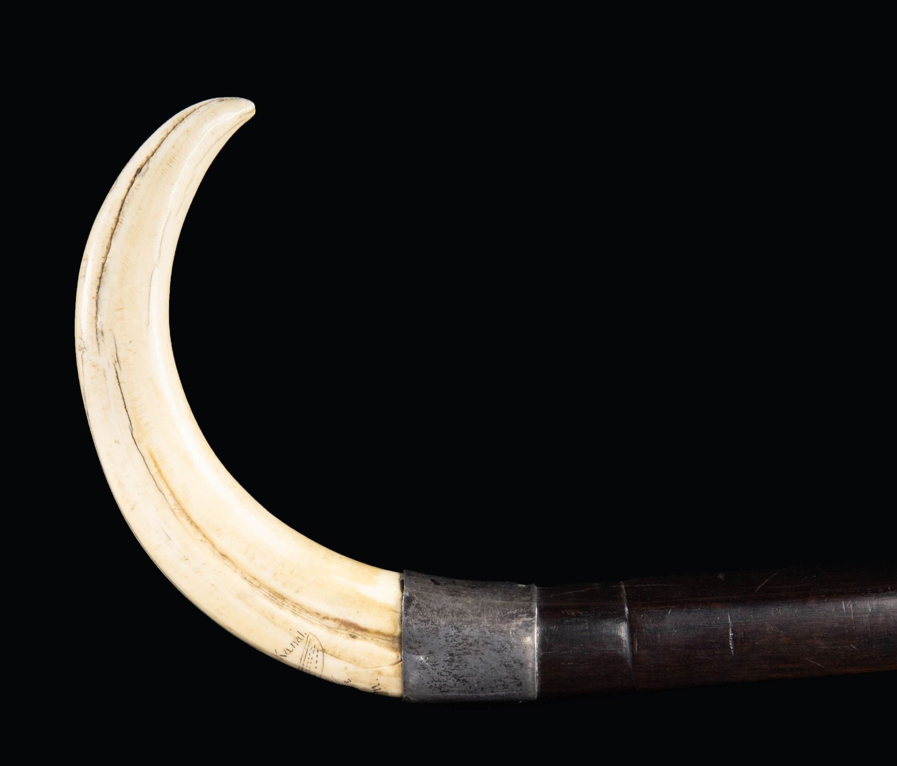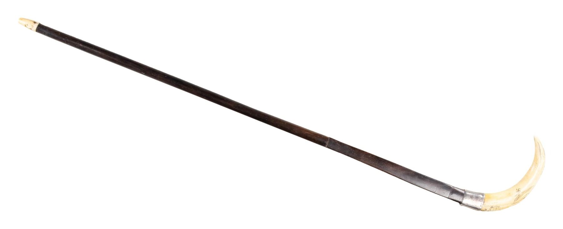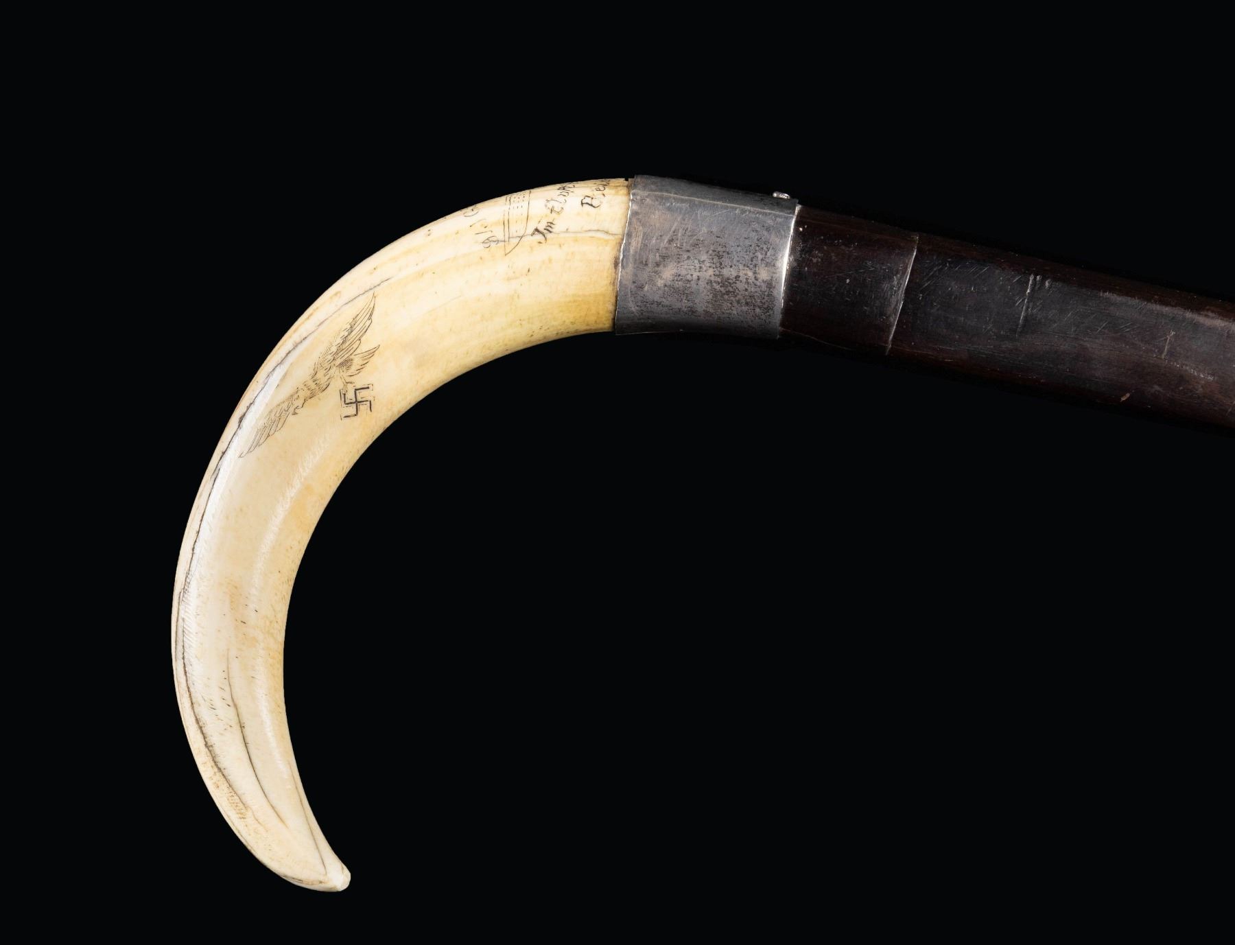 TUSK HANDLE.This 37" cane has a wooden shaft of dark dense wood that is possibly ebony. The tip of the cane is carved bone and the handle of the cane is made from a scrimshawed boar's tusk. There is a 1 1/2" silver ferrule connecting the cane body to the tusk. The tusk is scrimshawed with a WWII German Luftwaffe eagle and the name "Lt. Gustau 'Gus' Wolff". The tusk is further engraved "1940", "9/J G54 am Kanal Im Floftcage De_ Reichsbahn." with a German Reichbahn winged locomotive wheel. CONDITION: shaft of cane shows light wear. The tip is cracked and the tusk shows a few tight shrinkage cracks, but has no losses. (02-25767/BF). NON-GUN. $800-1,200.