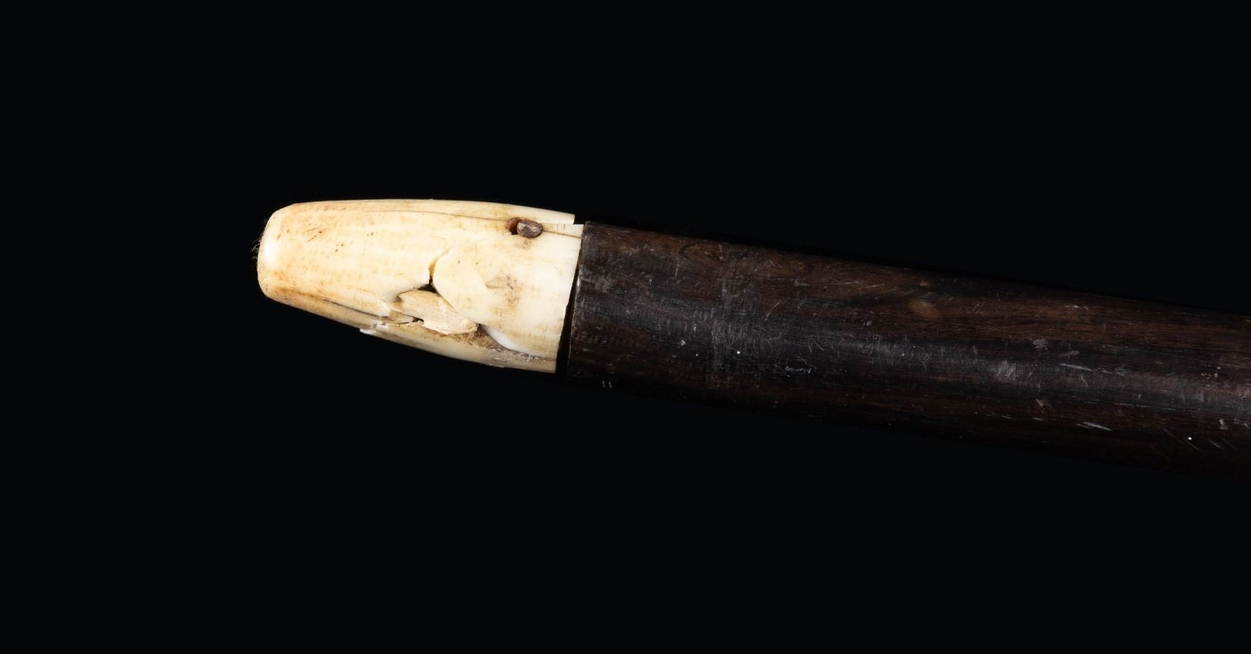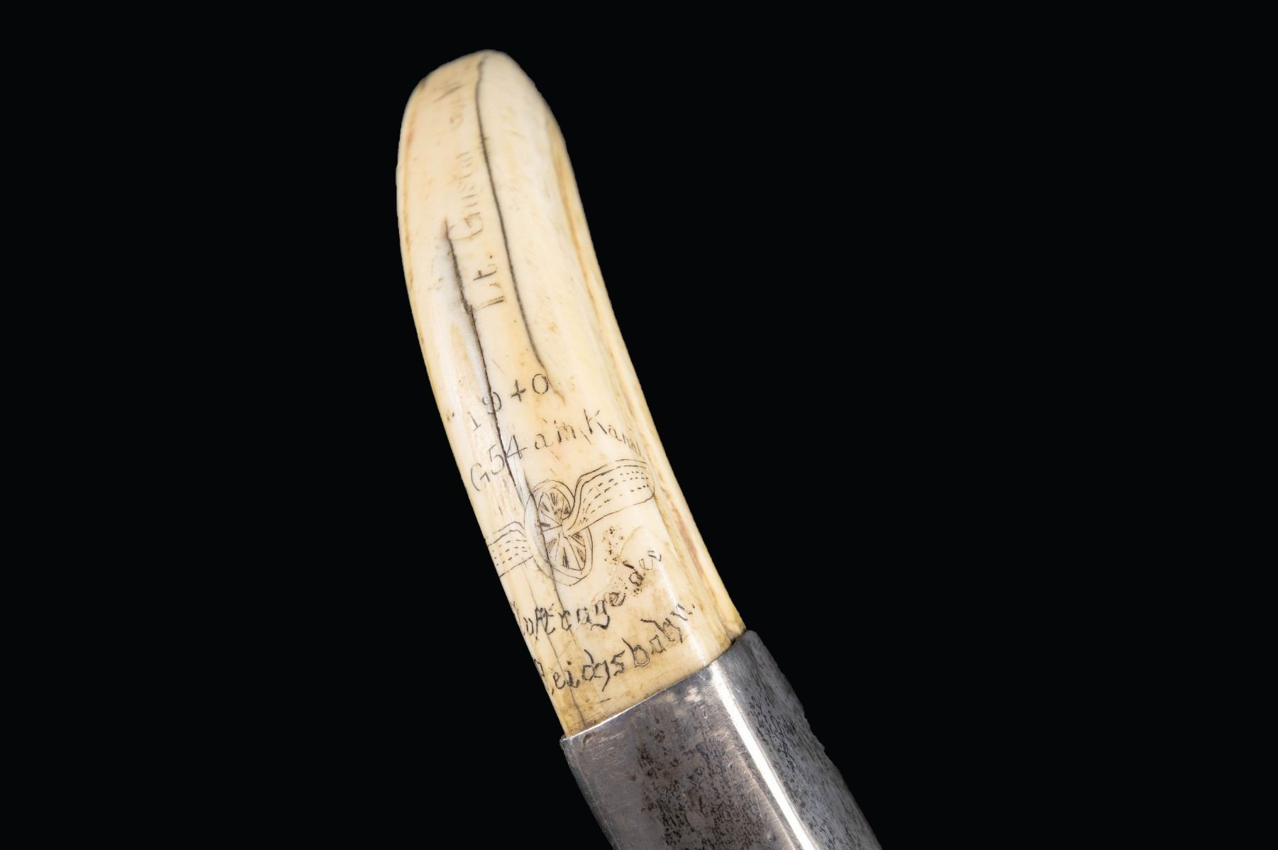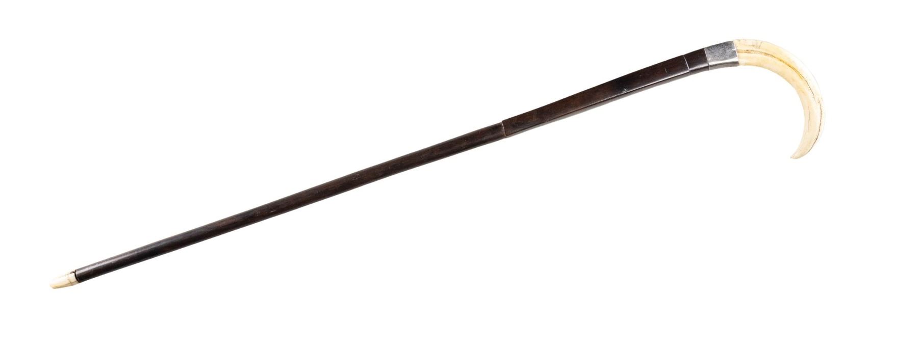 TUSK HANDLE.This 37" cane has a wooden shaft of dark dense wood that is possibly ebony. The tip of the cane is carved bone and the handle of the cane is made from a scrimshawed boar's tusk. There is a 1 1/2" silver ferrule connecting the cane body to the tusk. The tusk is scrimshawed with a WWII German Luftwaffe eagle and the name "Lt. Gustau 'Gus' Wolff". The tusk is further engraved "1940", "9/J G54 am Kanal Im Floftcage De_ Reichsbahn." with a German Reichbahn winged locomotive wheel. CONDITION: shaft of cane shows light wear. The tip is cracked and the tusk shows a few tight shrinkage cracks, but has no losses. (02-25767/BF). NON-GUN. $800-1,200.