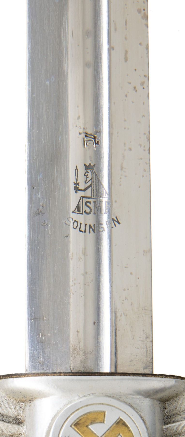 A beautiful example of a WWII German Luftwaffe officer's sword by SMF measuring 34 3/4" overall with a plain single fullered blade marked " (logo) SMF SOLINGEN " with a waffenamt. Aluminum hilt with a feathered crossguard and central gilded mobile Party symbol. The disk shaped pommel also has a central gilded Party symbol. Aluminum wire wrapped blue leather grip. The blue leather covered metal scabbard has aluminum mounts and is complete with its hanger and belt loop/clip. The sword is accompanied by what could be its original dark blue felt sword bag with a zippered top. CONDITION: the sword shows very light wear overall and appears unissued. The felt case is a bit stiff and has a few moth nips. (02-25017/BF). NON-GUN. $800-1,200.