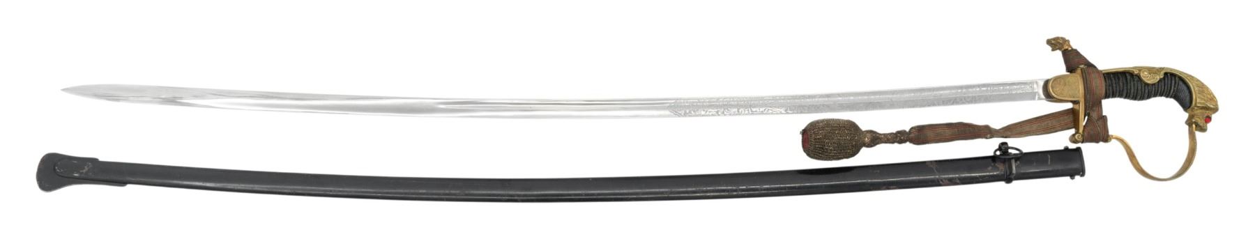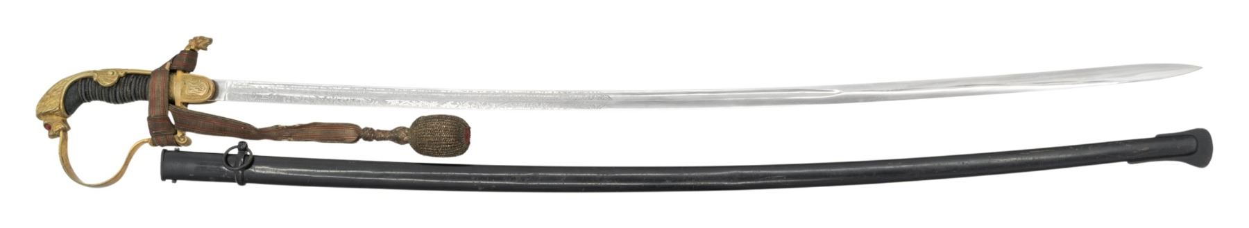 A very fine German Weimar Republic Police sword measuring 39 1/2" overall with an etched 33 3/4" blade. The etching includes sprays of arms and foliate motifs. The spine is etched " PAUL WEYERSBERG & Co SOLINGEN ". Gilded hilt with a lion head quillon and shield langets. Plain knuckle bow with a well articulated "ruby" eyed lion pommel. Wire wrapped shark skin grip with a red and gold bullion knot attached. Black enameled scabbard. CONDITION: blade shows substantial original factory polish and the hilt shows light wear. Grip is solid and the knot has light wear. Scabbard retains 96% of its original finish. (02-25009/BF). NON-GUN. $400-600.