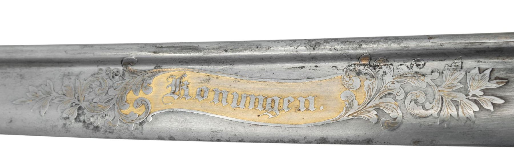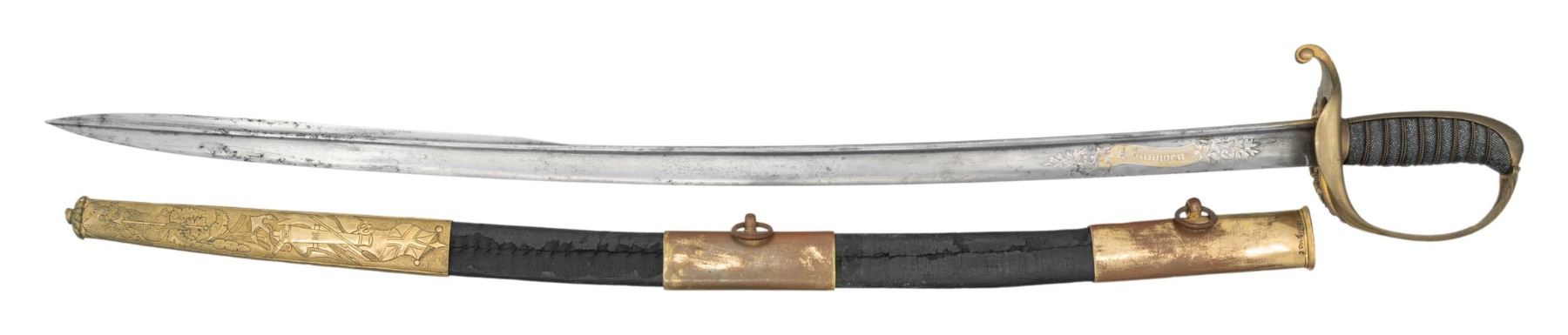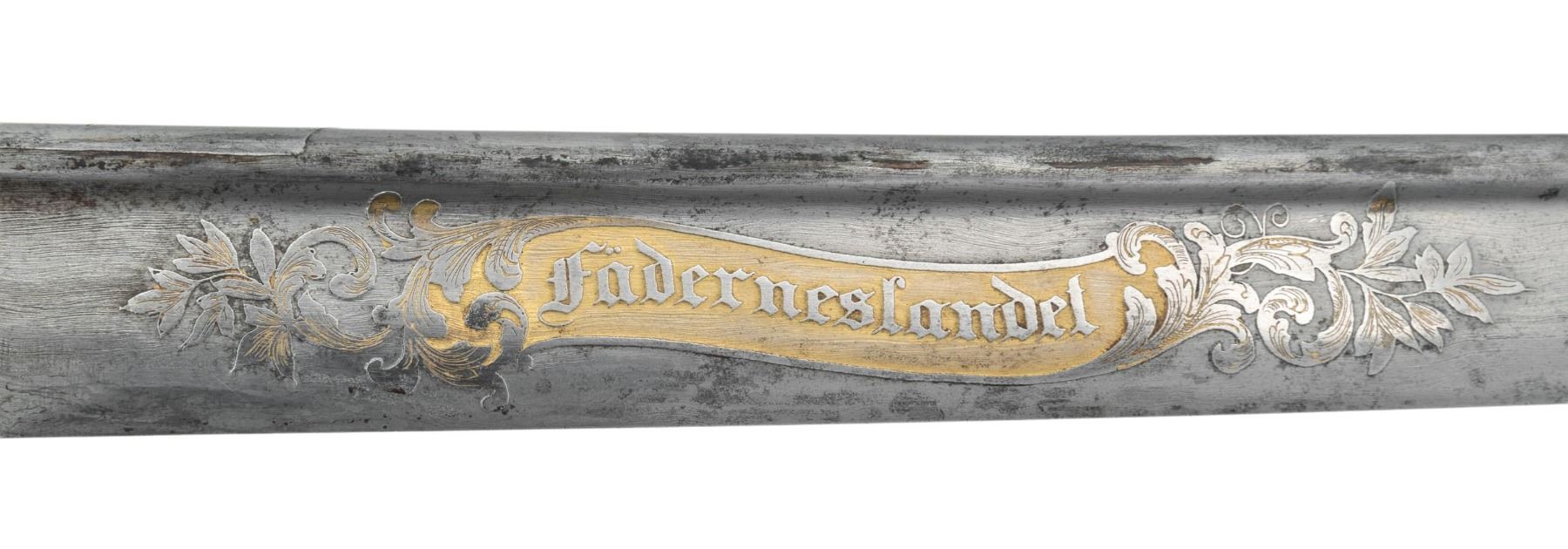 NAVAL SCABBARD.A seldom seen Swedish M1859 officer's saber measuring 37" overall with a 31 1/2" etched pipe back blade. Etching includes a gilded ribbon with foliate ends that reads "Faderneslandet", which translates to Fatherland, and another gilded ribbon that reads "Konungen", which translates to King. Also included in the etching is a multi-rayed star over the Swedish Royal Arms. Gilded brass hilt with a semi basket guard featuring elaborate pierced foliate motifs and a drop swirled quillon. Lightly embellished knuckle bow and backstrap with bird's head like pommel. Wire wrapped shark skin grip. The scabbard has three large gilded brass mounts over a leather body. The top mount has foliate motifs above a crossed anchor and pike. The middle mount has a lantern over a ribbon and fountain. And the elaborate lower mount features a British Union Jack, cannon, a trident, pike, cannon sponge, anchor, and coiled serpent. CONDITION: blade shows a medium gray patina with most of the original gilding remaining around the engraving. Hilt generally shows light wear with no notable faults. The scabbard has some flaking to the leather and the mounts retain 70% of their original gilded finish. PROVENANCE: Estate Collection of Nicholas Apergis. (02-24669/BF). NON-GUN. $1,000-1,500.