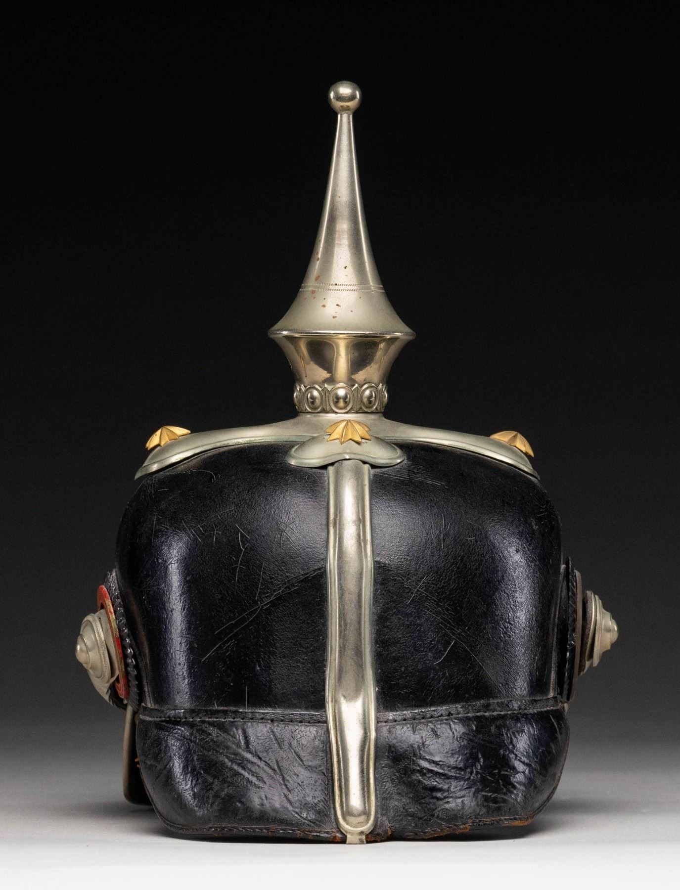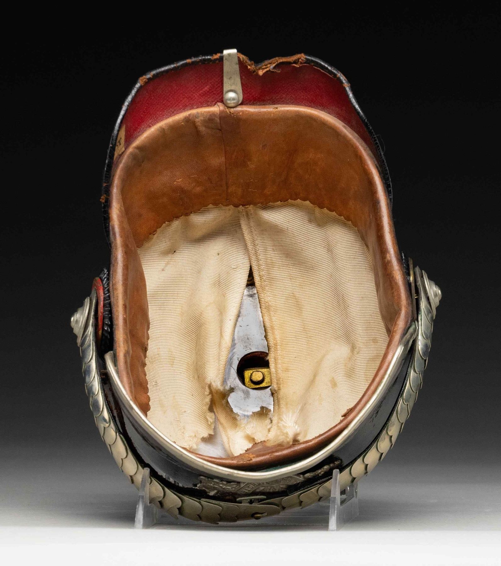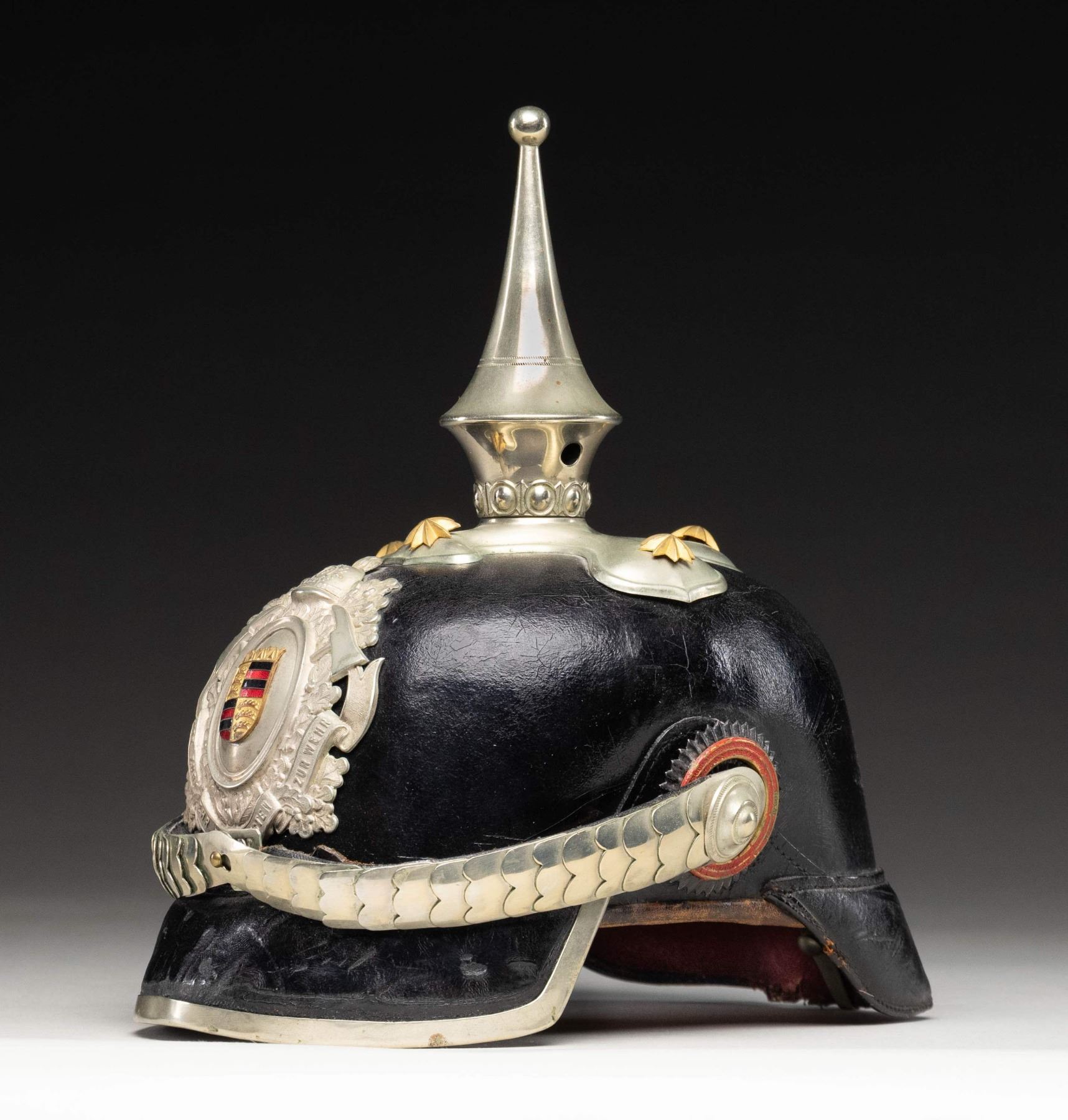 Imperial German Württemberg fire chief pickelhaube helmet. Wappen features a Württemberg coat of arms with antlers, a fire helmet, two axes & the words "GOTT ZUR EHR DEM NACHSTEN ZUR WEHR". Leather body with silver plated spike & other parts. Dome has four 8-pointed star decorations. No liner present. CONDITION: interior shows notable staining, a couple large missing chunks, scattered staining, some tears & age wear. Leather exterior shows some denting, crazing, scuffing & age related wear. Silver plated parts show scattered light oxidation & tarnishing. (02-25843/MJC). NON-GUN. $700-1,100.