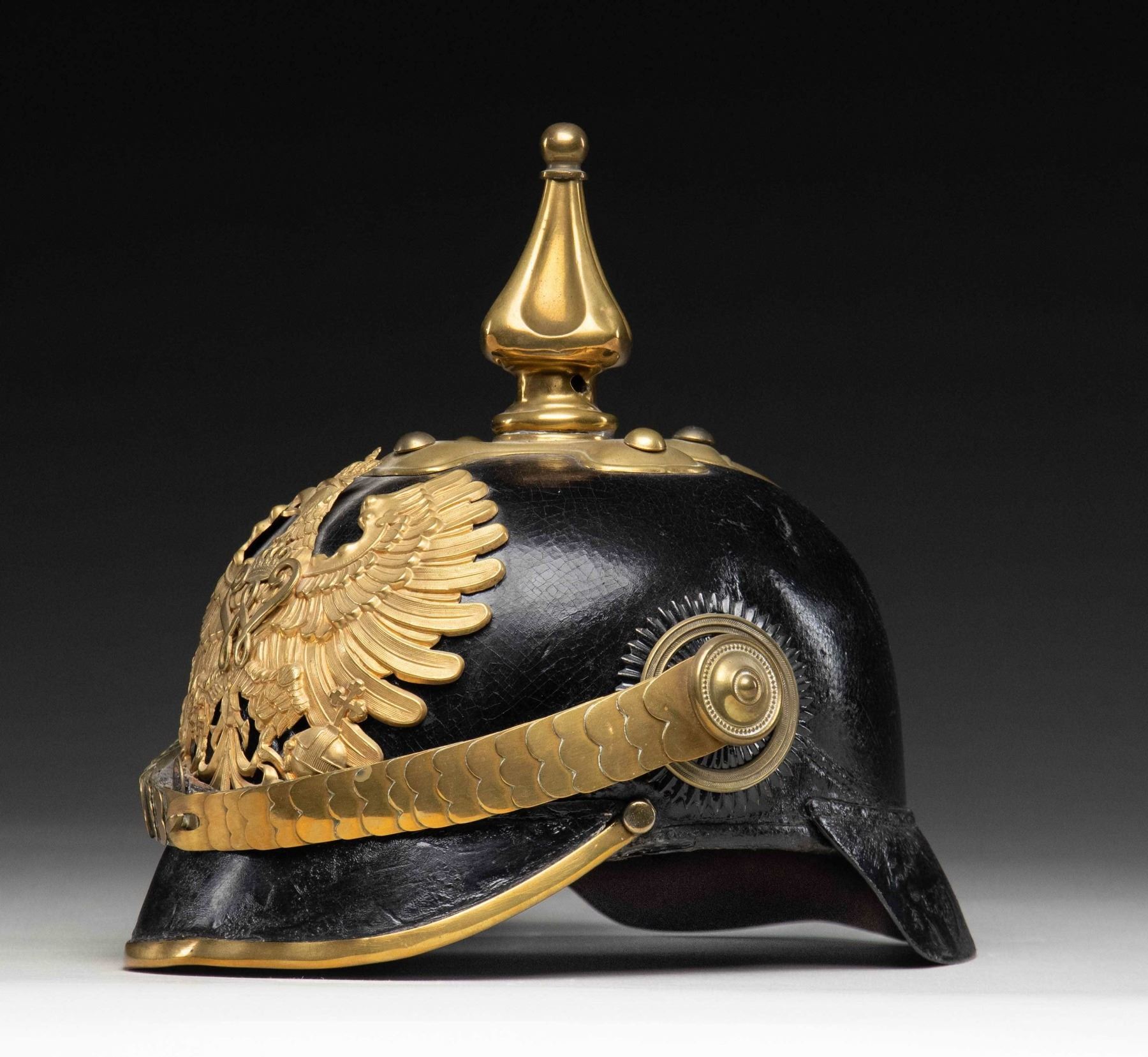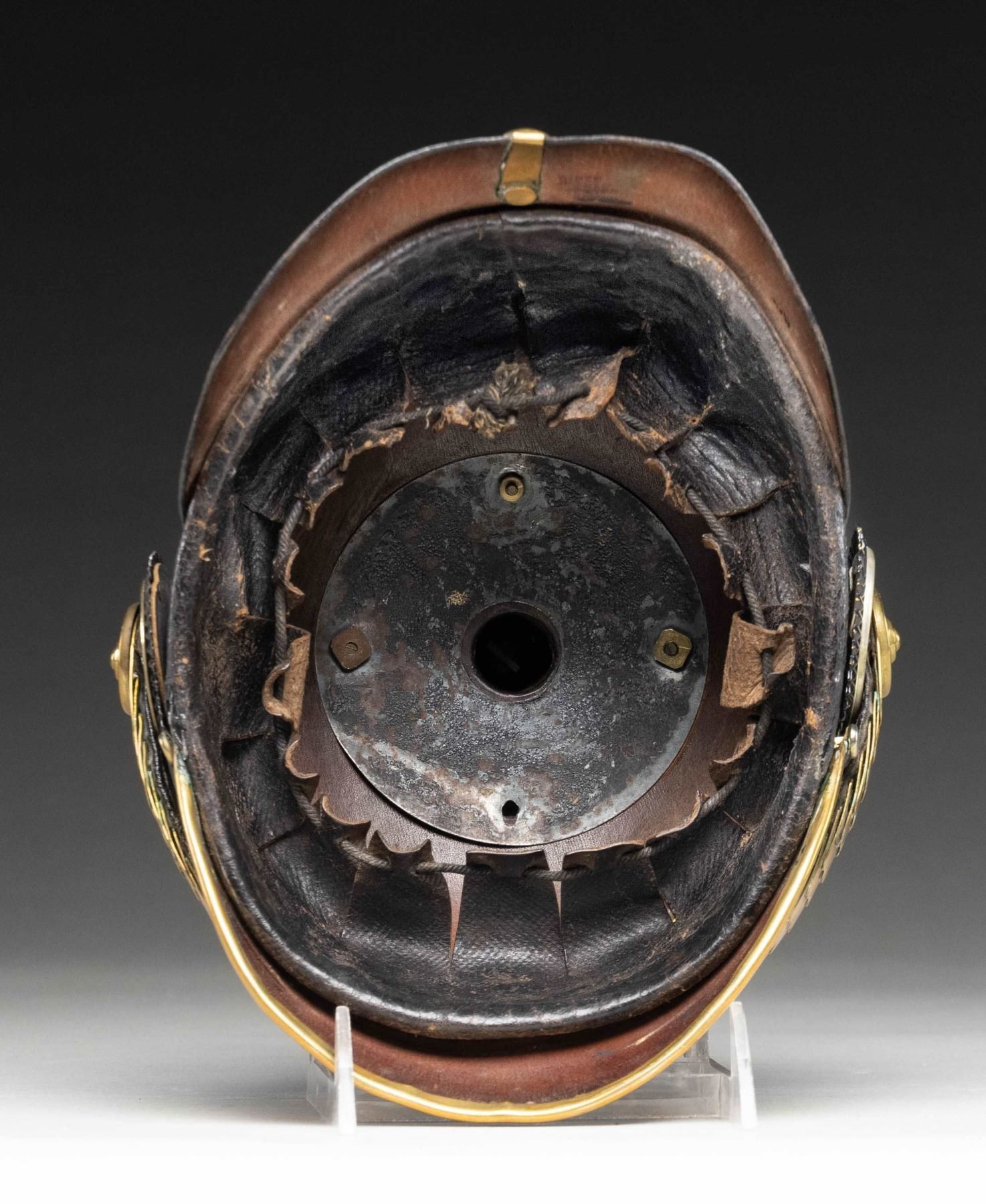 Prussian Customs officer pickelhaube helmet. Wappen features a Prussian eagle with crown & "W" for Kaiser Wilhelm II. Helmet is of black leather construction with brass spike & hardware. Prussian & Imperial German kokades. Liner present. Ink markings inside are faint & illegible. CONDITION: leather shows scattered denting, crazing, cracking & age related wear. Brass parts show a couple moderate dents, some tarnishing & areas turning dull yellow patina. Liner shows overall crazing, age wear & fraying. Interior of helmet shows crazing & staining. (02-25845/MJC). NON-GUN. $600-1,000.