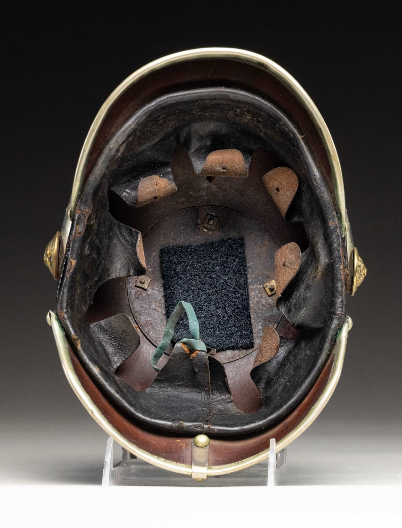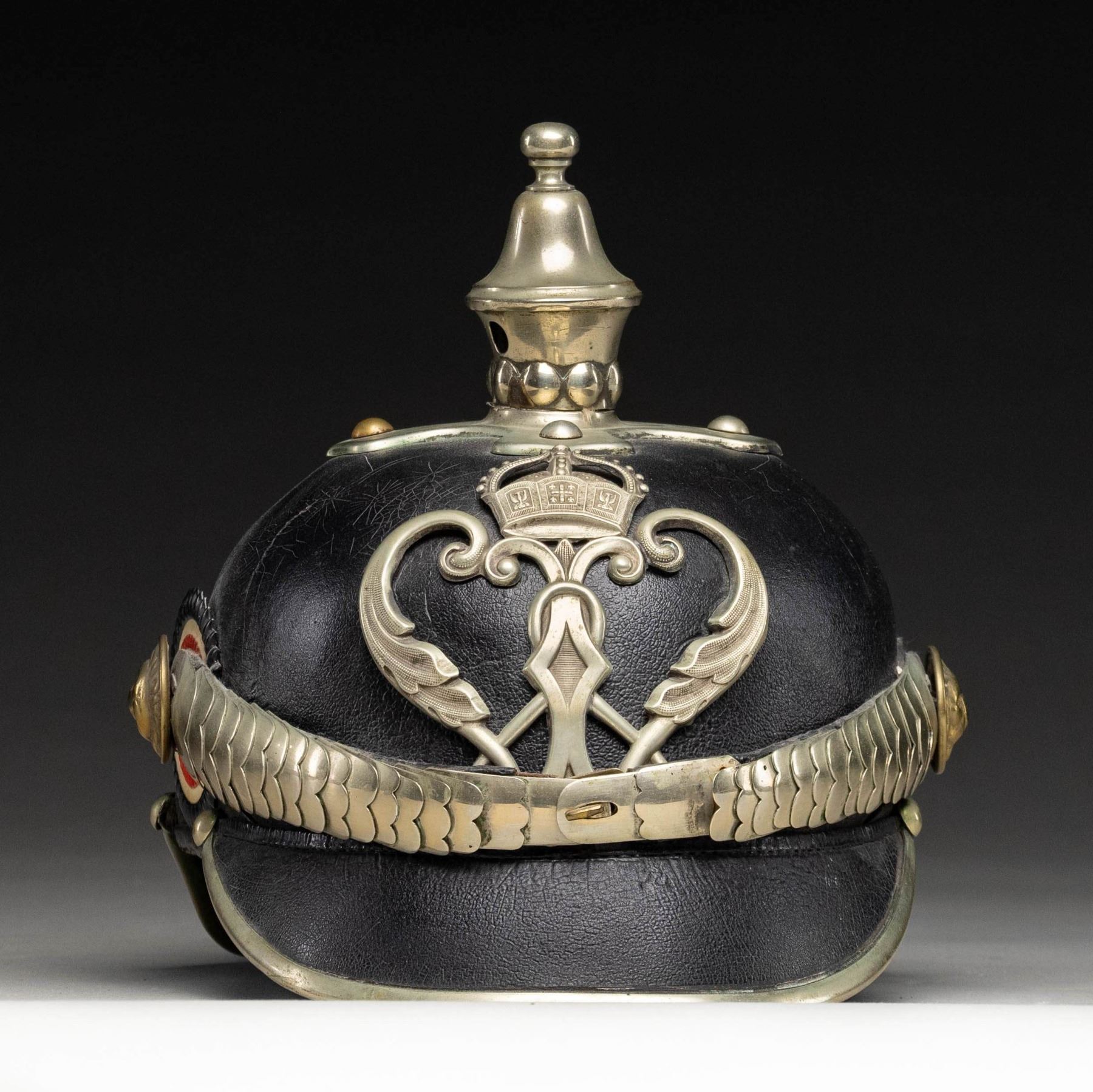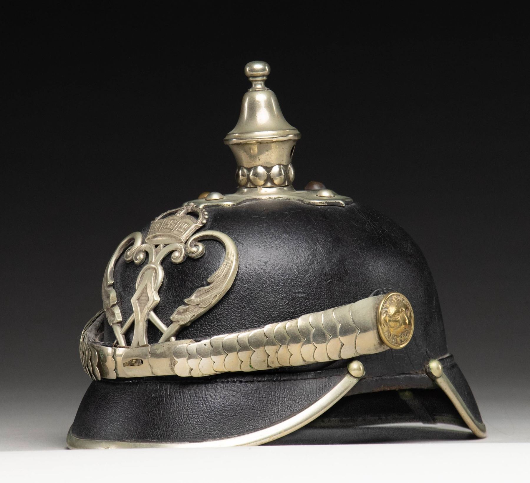 Prussian police helmet. Wappen has has large German crown over W for Kaiser Wilhelm II. Black leather construction. Prussian kokade present but no Imperial German kokade present. Lion side posts. Silver plated exterior parts. Liner present. CONDITION: silver parts show light oxidation, some flaking & areas turning gray. Leather dome shows crazing, light flaking, staining & age related wear. Liner shows overall flaking, crazing & some light tears. (02-25847/MJC). NON-GUN. $300-500.