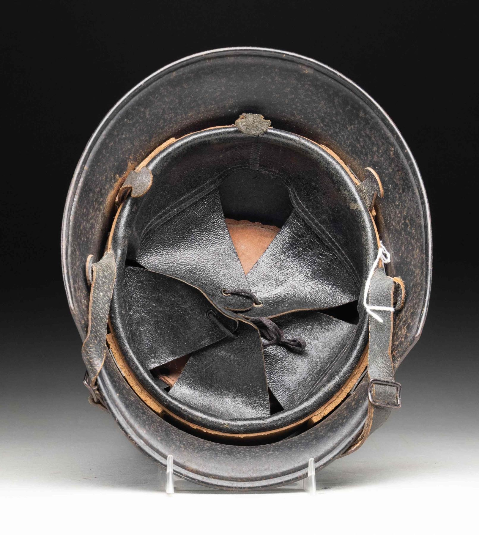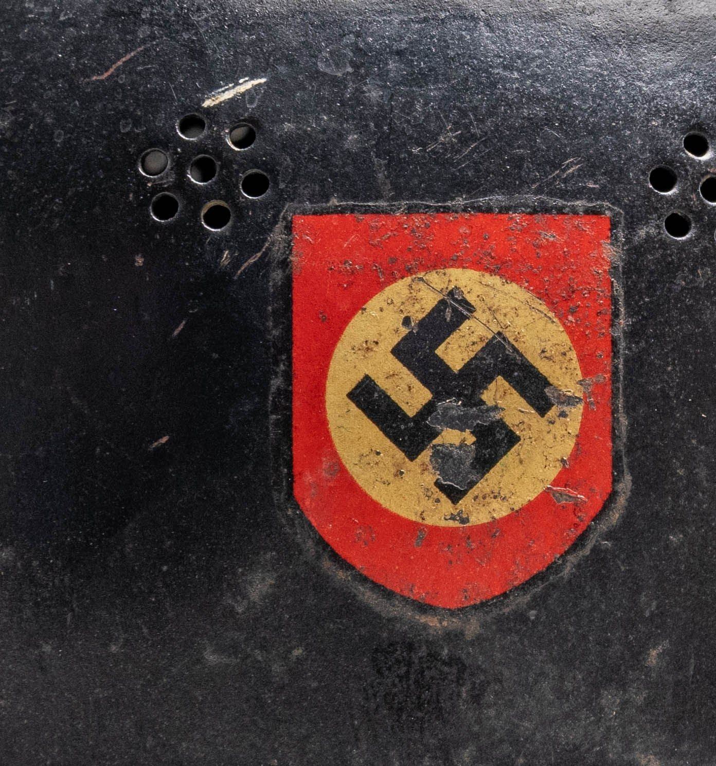 A very fine example of a WWII German civic style Police helmet with a black painted finish featuring a Police decal on the left side and a Party decal on the right side. The inside rear is stamped " THALE " and the left side has no stamping visible. Black leather 5 tongue liner with a black leather chinstrap. CONDITION: helmet has 97% finish remaining and both decals are 95%+. (02-24877/BF). NON-GUN. $500-750.