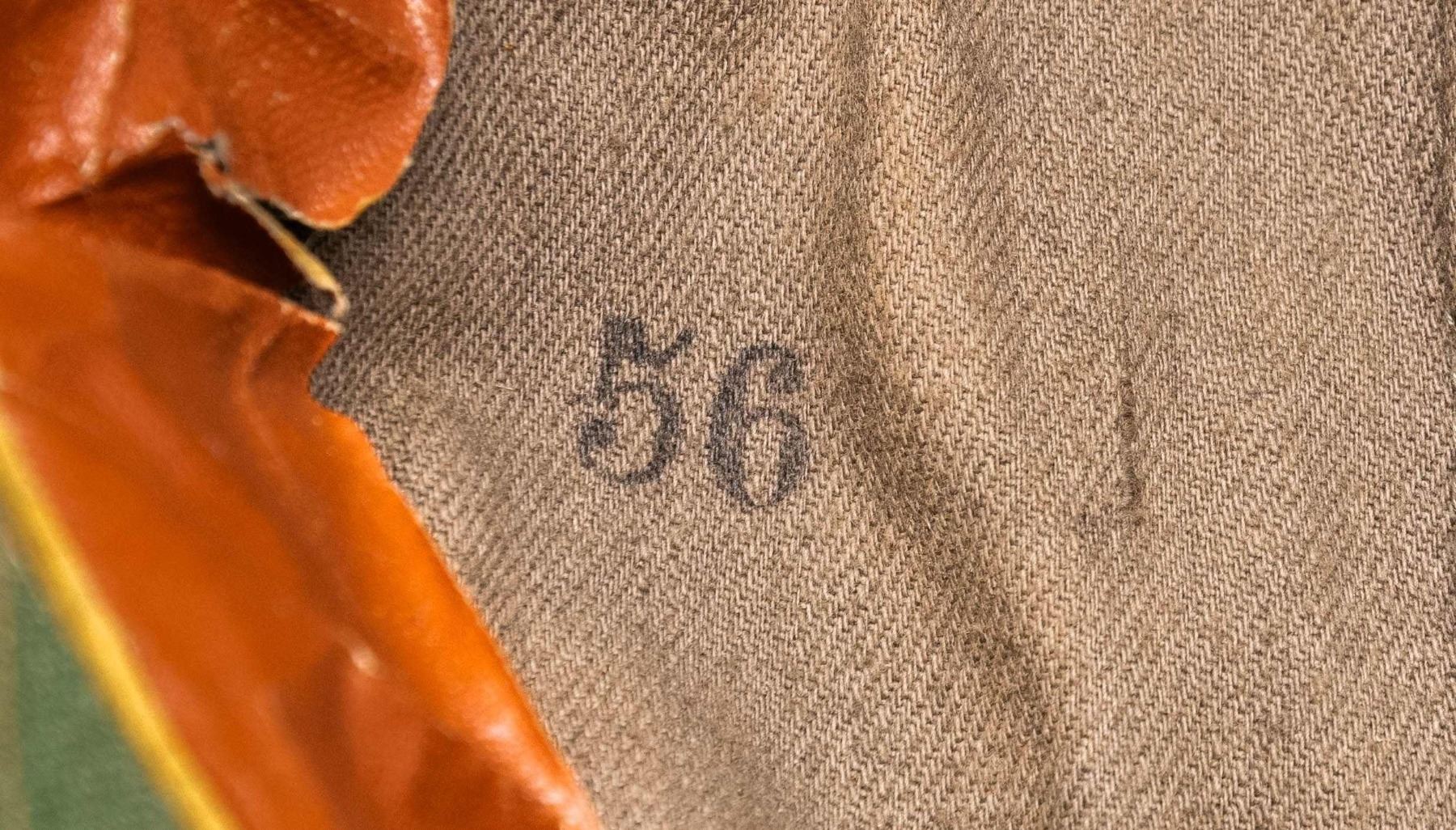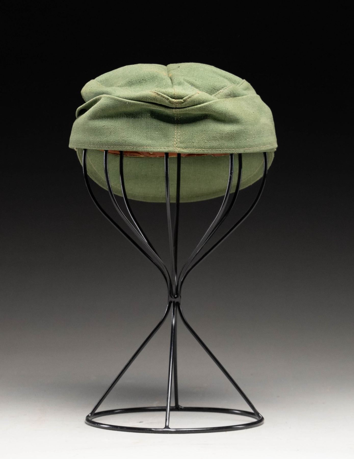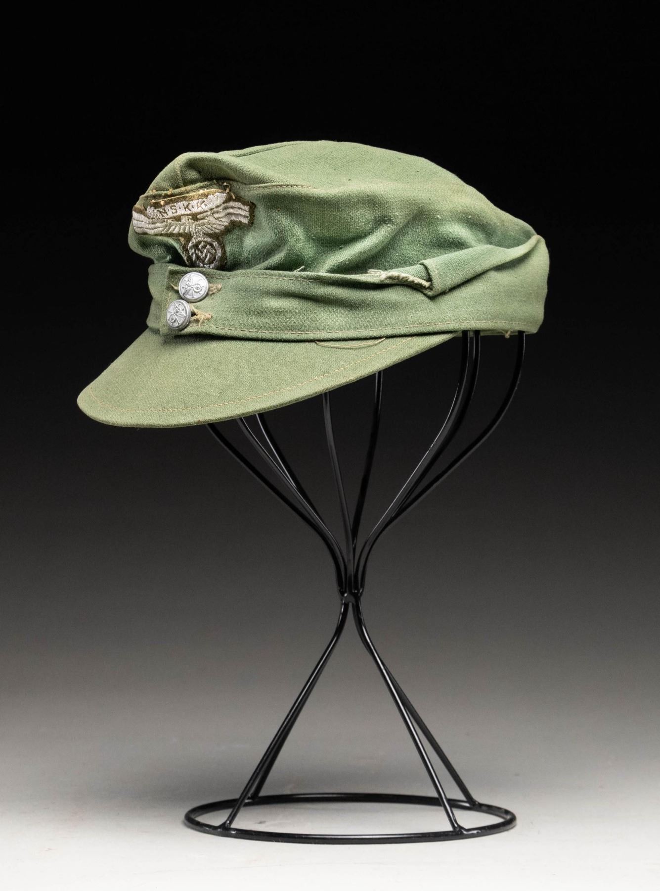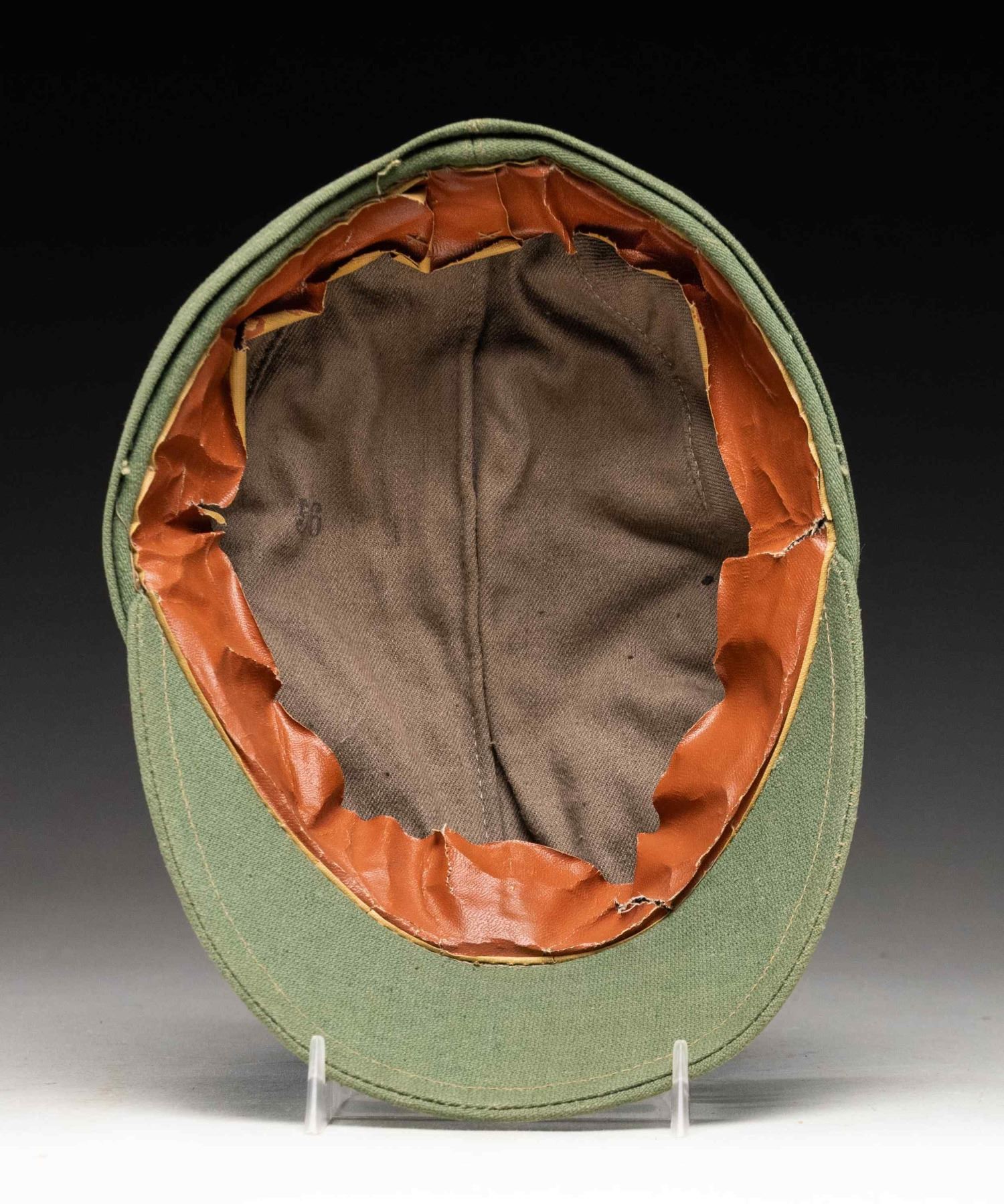 A nice example of a WWII German M1943 style cap for the NSKK in dull sage green with a brownish green flat bullion NSKK eagle and banner on the front. There are 2 small NSKK buttons on the front that hold the ear flaps together. The interior is lined with putty colored cotton stamped "56". The sweatband is faux brown leather. CONDITION: the cap shows general wear and the eagle is slightly detached. The sweat band is dry and brittle but substantially intact. (02-24876/BF). NON-GUN. $500-700.