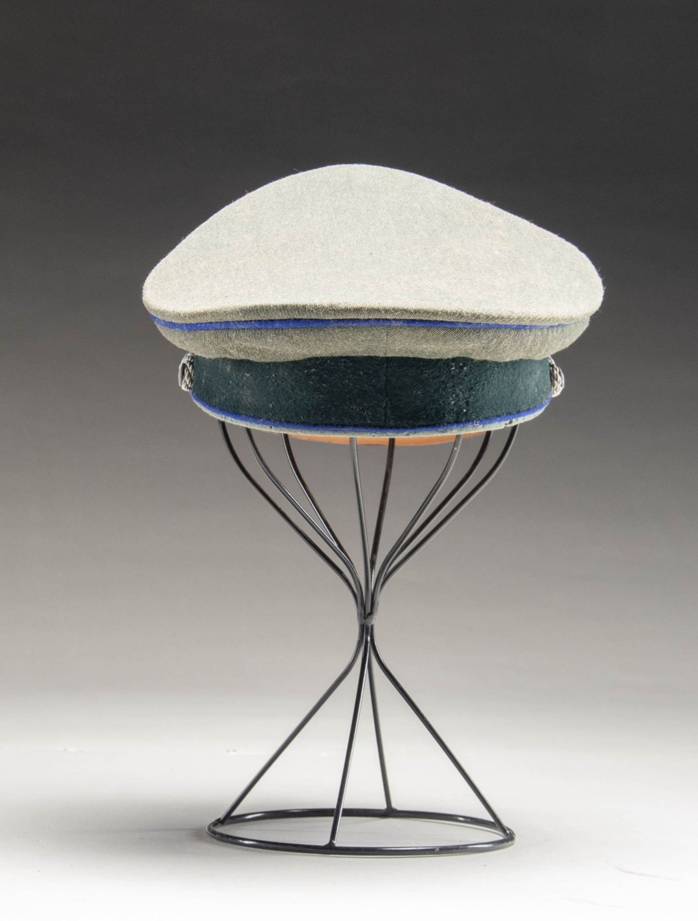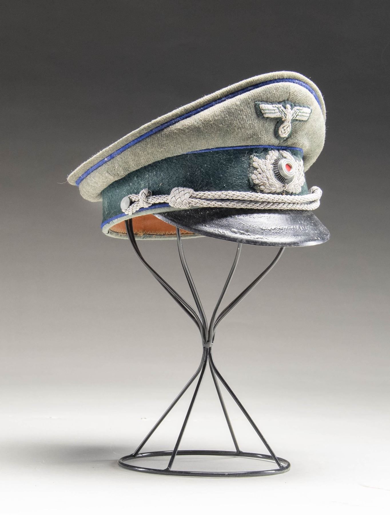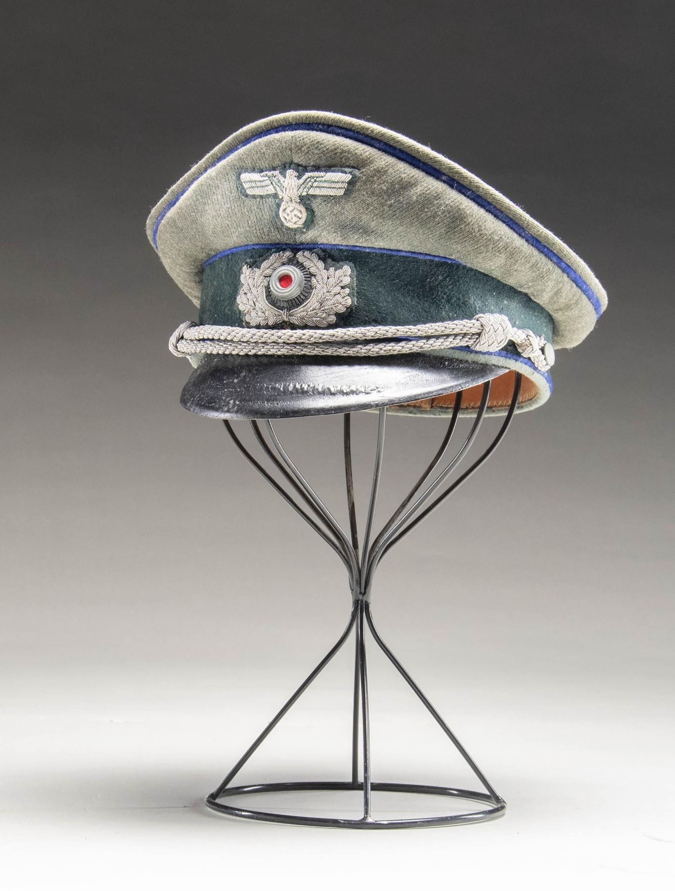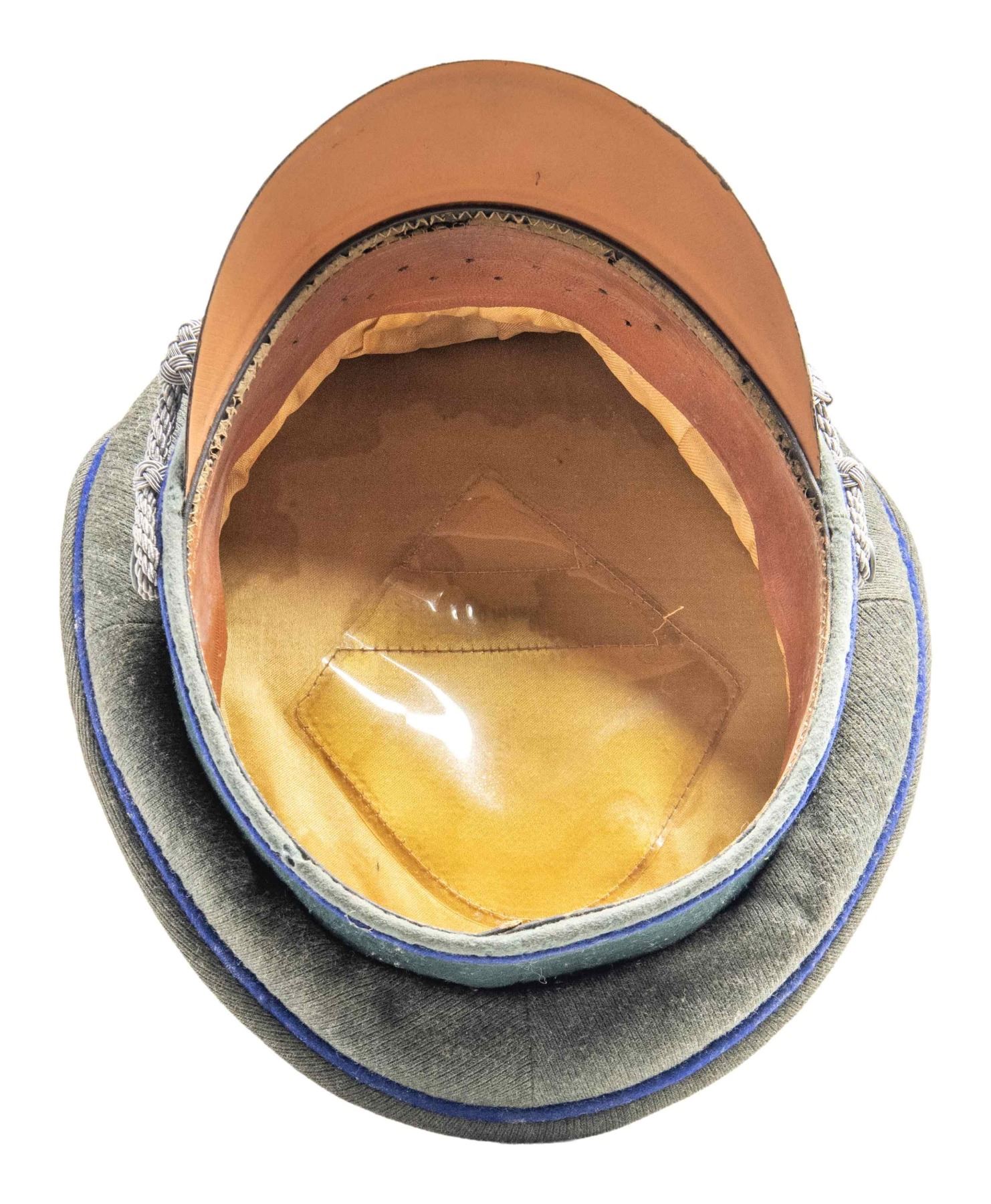 A good example of a WWII German Medical Officer's visor cap with a sage green crown and dark green band, all piped in bright blue. The front of the crown has a silver bullion army eagle and the front of the band has a fine bullion wreath with metal cockade. Bullion chin strap terminated by small pebbled finish buttons. Black visor with tan underside, brown sweatband, and golden yellow rayon lined with rounded diamond sweatshield. CONDITION: cap has no notable moth damage and is solid overall. The black finish on the visor is bubbled just a bit. The liner shows expected sweat stains. (02-24896-1/BF). NON-GUN. $500-800.