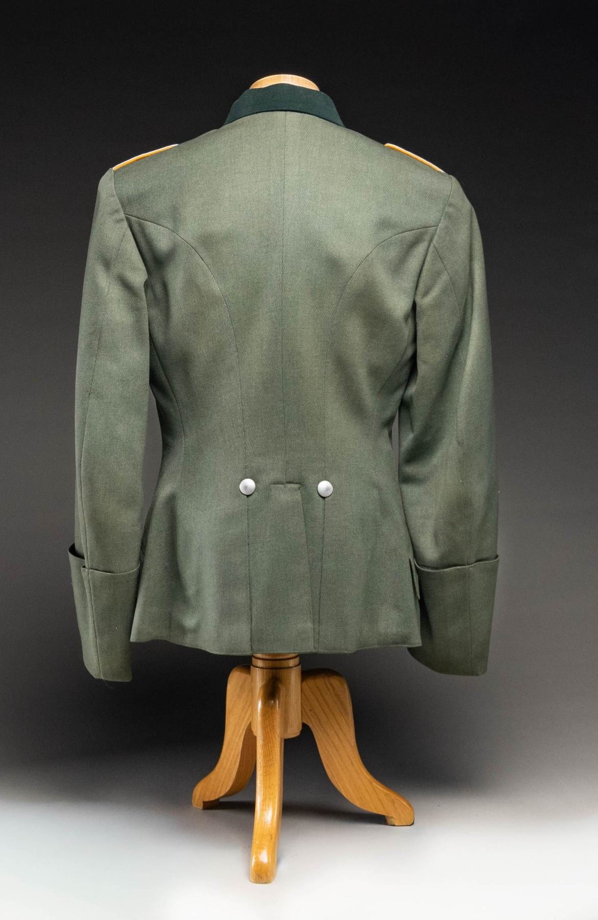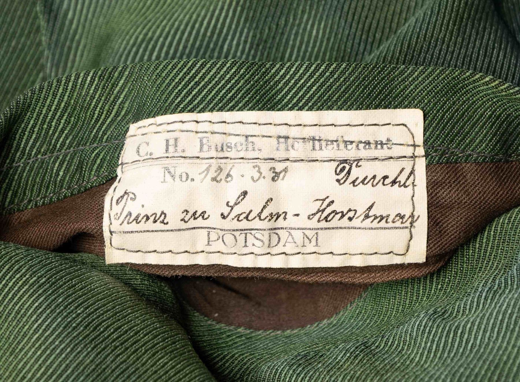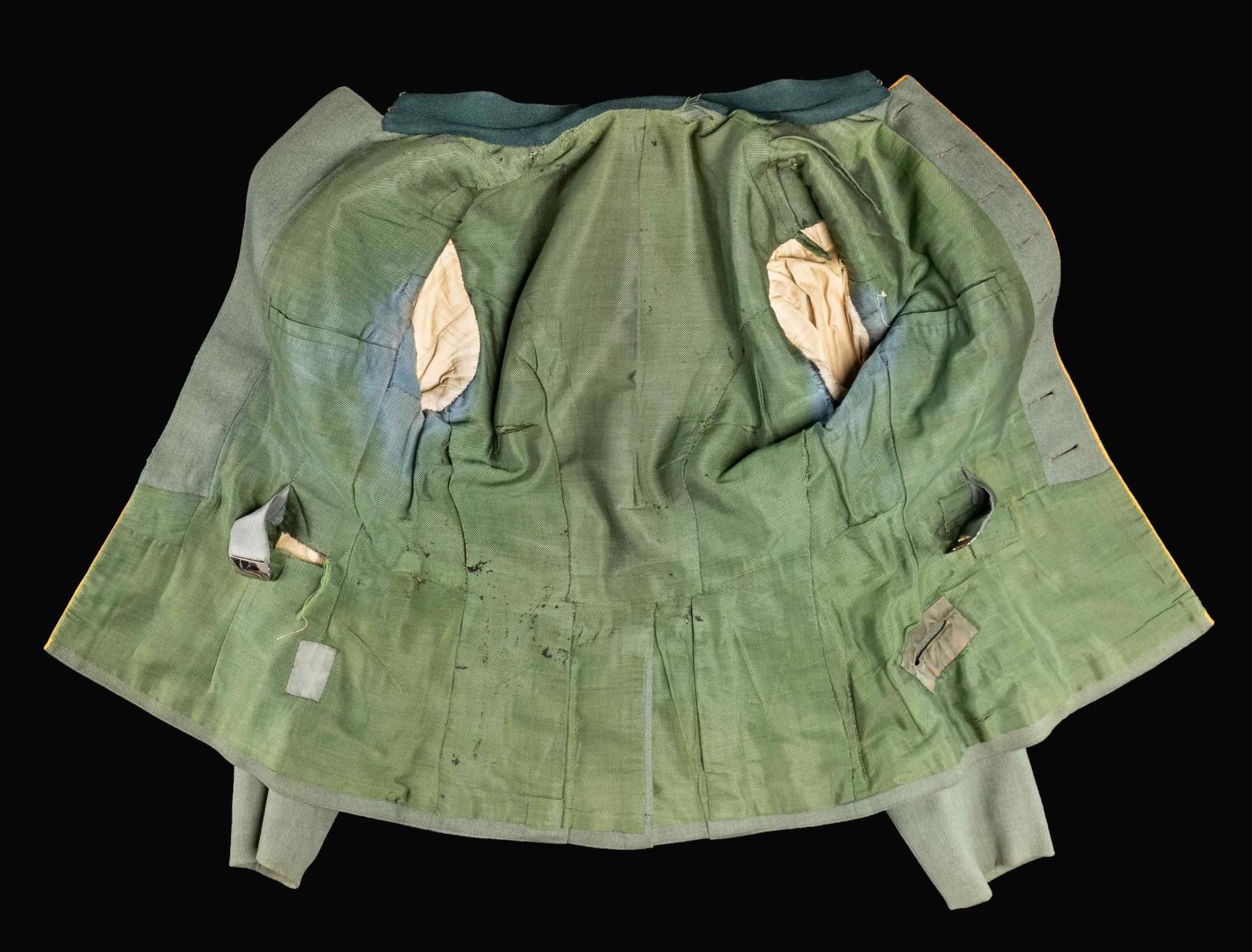 A deep sage green tunic with a dark green collar for a Captain of the 5th Cavalry. Collar tabs are heavy silver bullion on a yellow field and the correct shoulder boards are silver bullion with 2 gold pips and a gold "5" all on a yellow field. Fine silver bullion breast eagle and aluminum pebbled finish buttons with yellow piping down the front. The interior appears to be lined in patterned green rayon and the sleeves are line in striped off white cotton. The inside of the interior pocket has a tag that reads " C. H. Busch, Hoflieferant No. 126.3.37 Durcht Prinz zu Salm-Horstman POTSDAM ". CONDITION: tunic shows light wear with no notable moth damage. There are a few small stains and a small tear in the lining. (02-24906/BF). NON-GUN. $700-1,000.