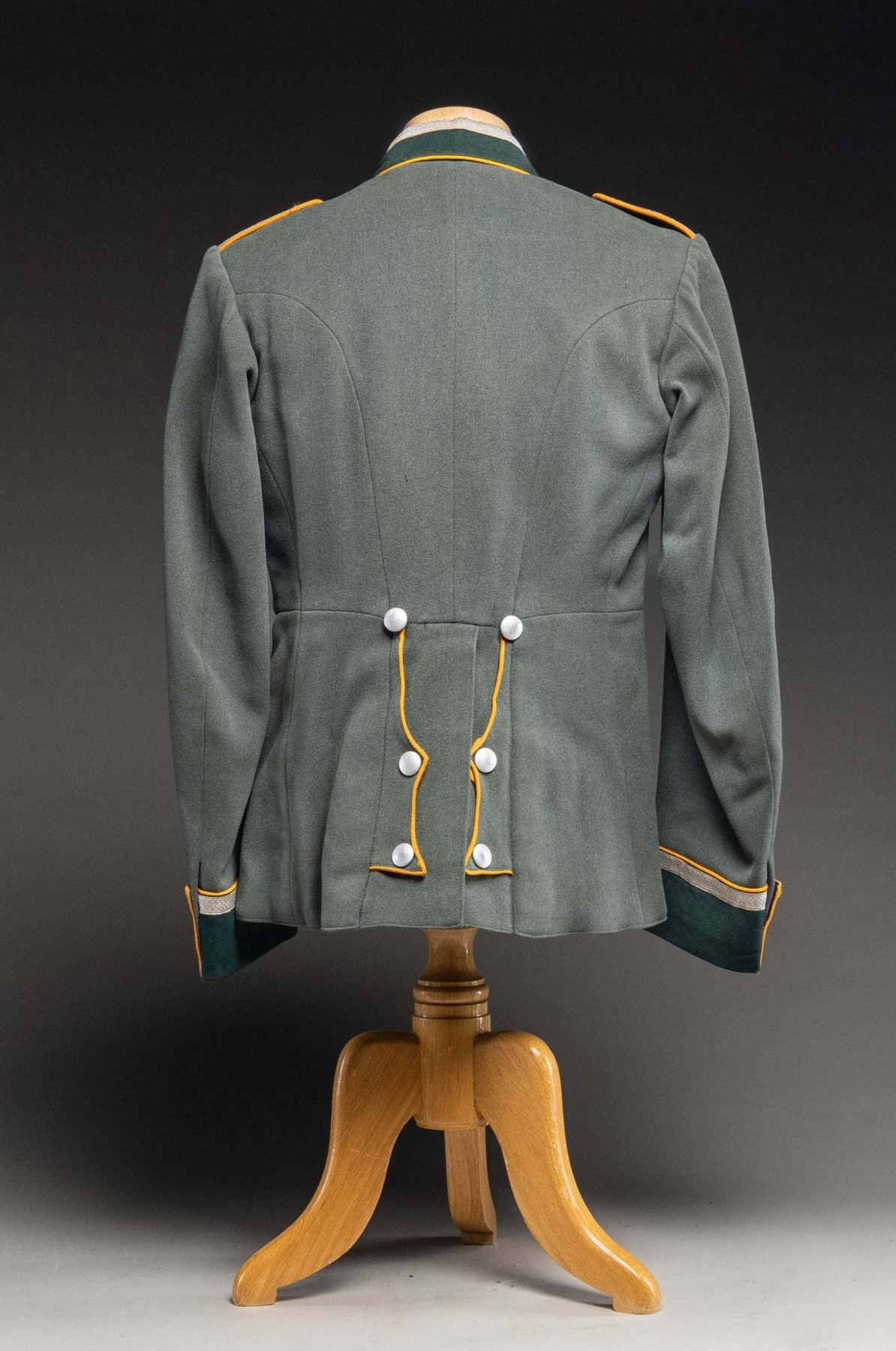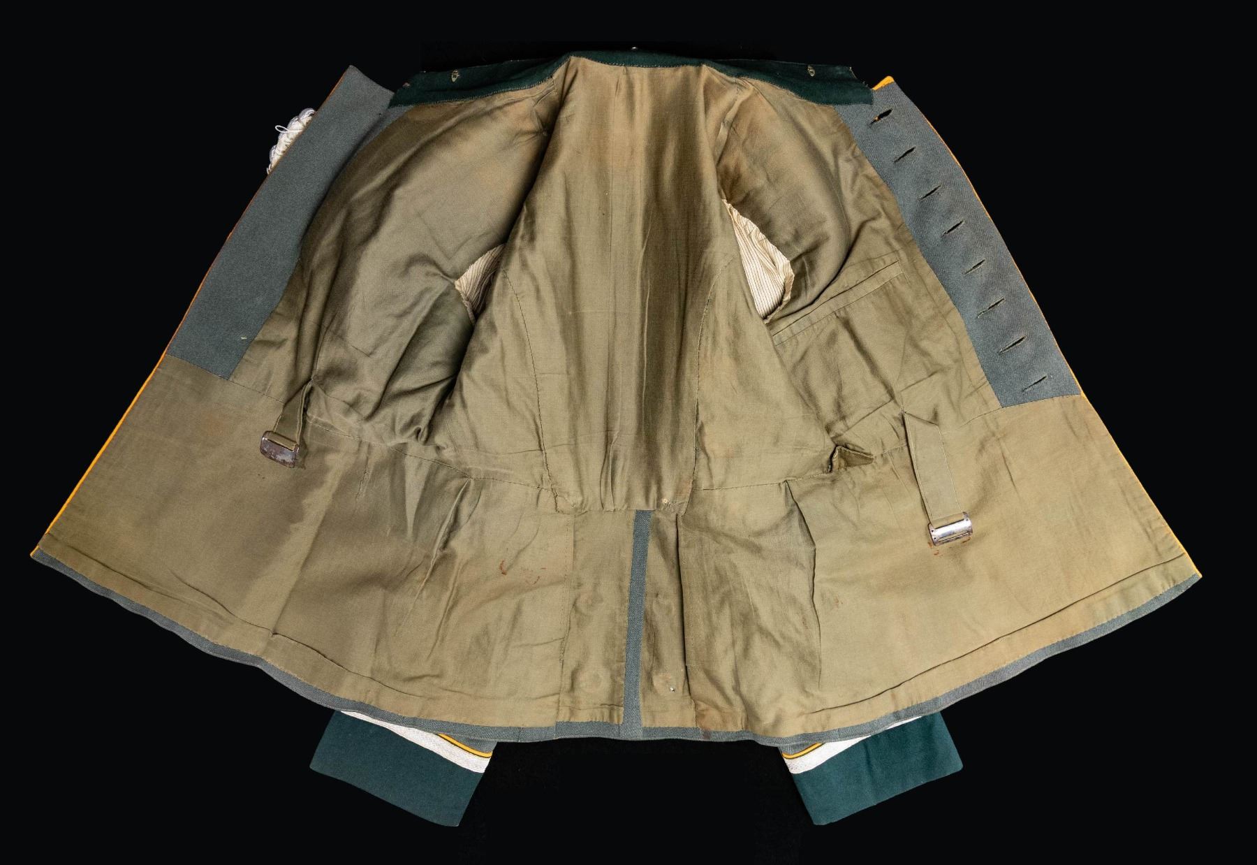 A deep sage green tunic with a dark green collar piped in yellow with silver tape on yellow collar tabs. The shoulder straps are enlisted bordered in yellow with an embroidered yellow "3" and silver bullion edge tape for a lance-sergeant. The pebbled finish buttons on the collar tabs display the number "5". The front of the tunic, cuffs, and tails are also piped in yellow. The cuff flashes are also yellow with bullion silver tape. There are 8 pebbled finish buttons down the front with the same buttons on the cuffs and tails. The right breast has a flat bullion eagle and the is a shooting lanyard hanging from the right shoulder. There are 2 sets of loops at the left breast for badges. The lining is olive drab green cotton, and the sleeve lining is a striped light cotton. No labels or markings. CONDITION: tunic shows light wear overall. The interior also shows light wear with minor staining to the upper sleeve lining. (02-24904/BF). NON-GUN. $700-1,000.