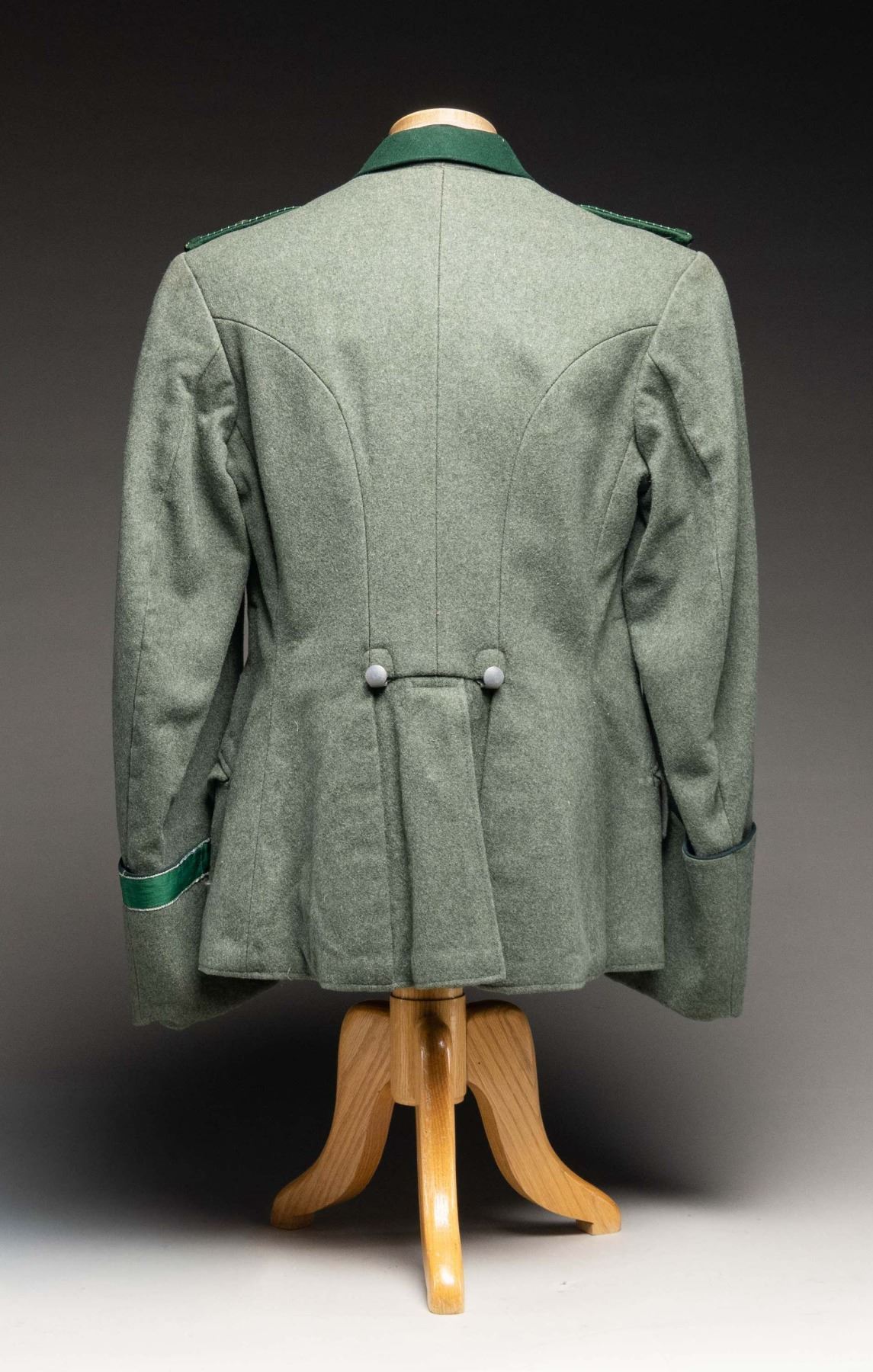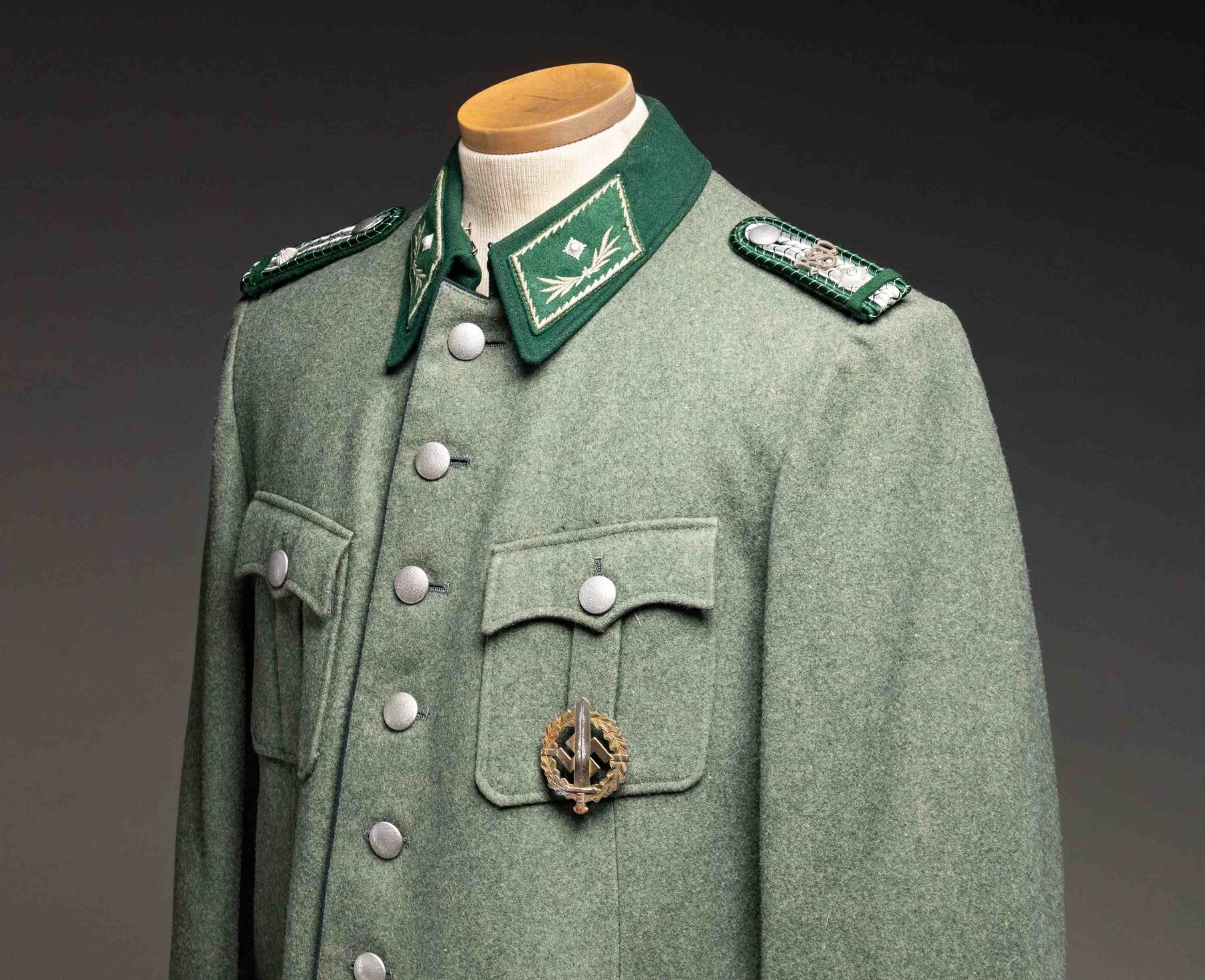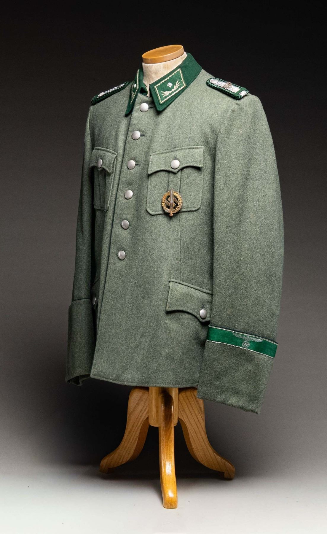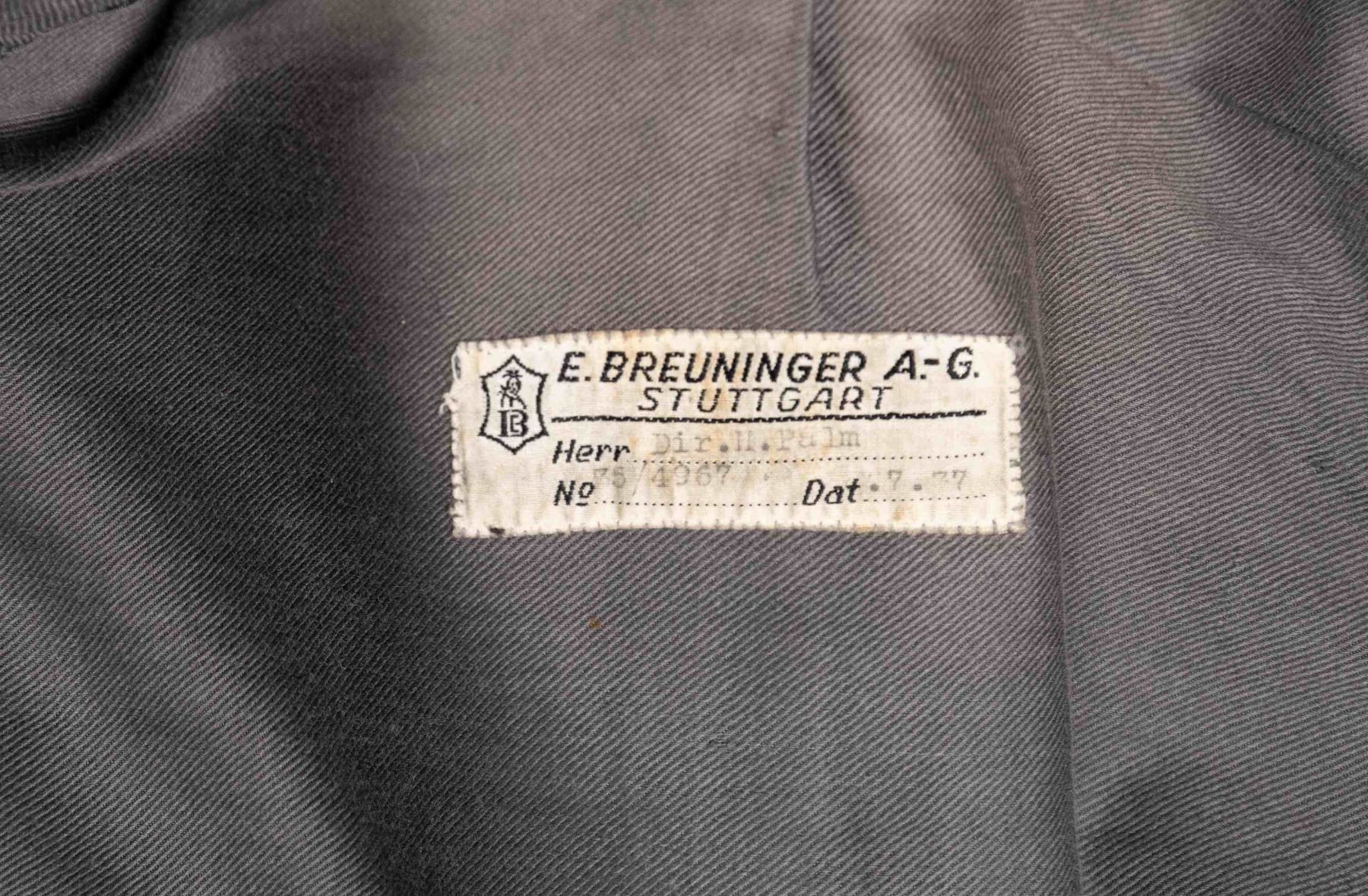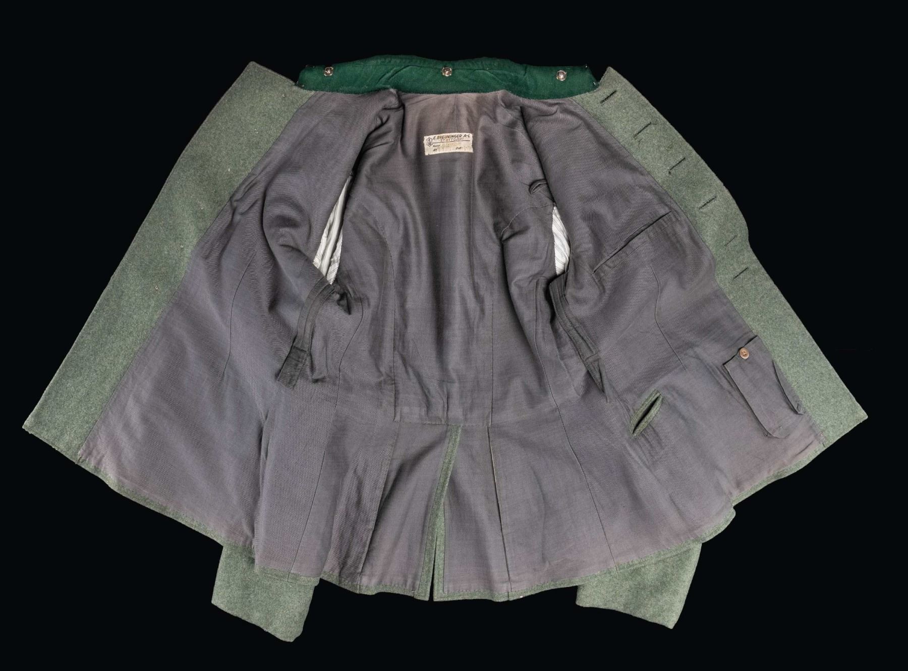 A deep sage green tunic with a bright green collar for a Customs official with the rank of Zollschiffer. Collar tabs are green with embroidered edges and swag with a single pip. Shoulder boards are dark green with silver bullion and a single pip. The left breast pocket 2 loops with an SA sports badge attached. The front of the tunic is piped in green as are the tops of the cuffs. The top of the left cuff also has a green and bullion Customs cuff title. The interior is lined with gray cotton and the sleeves are lined with striped white cotton. A tag in the back near the collar reads "E. BREUNINGER A.-G. STUTTGART Herr Dir. H. Palm No 39 / 4967 Dat .7 .37 ". There is a tiny tag inside the inner pocket with the initials " A. N. ". CONDITION: tunic shows light wear overall. The interior also shows light wear. (02-24891/BF). NON-GUN. $600-900.