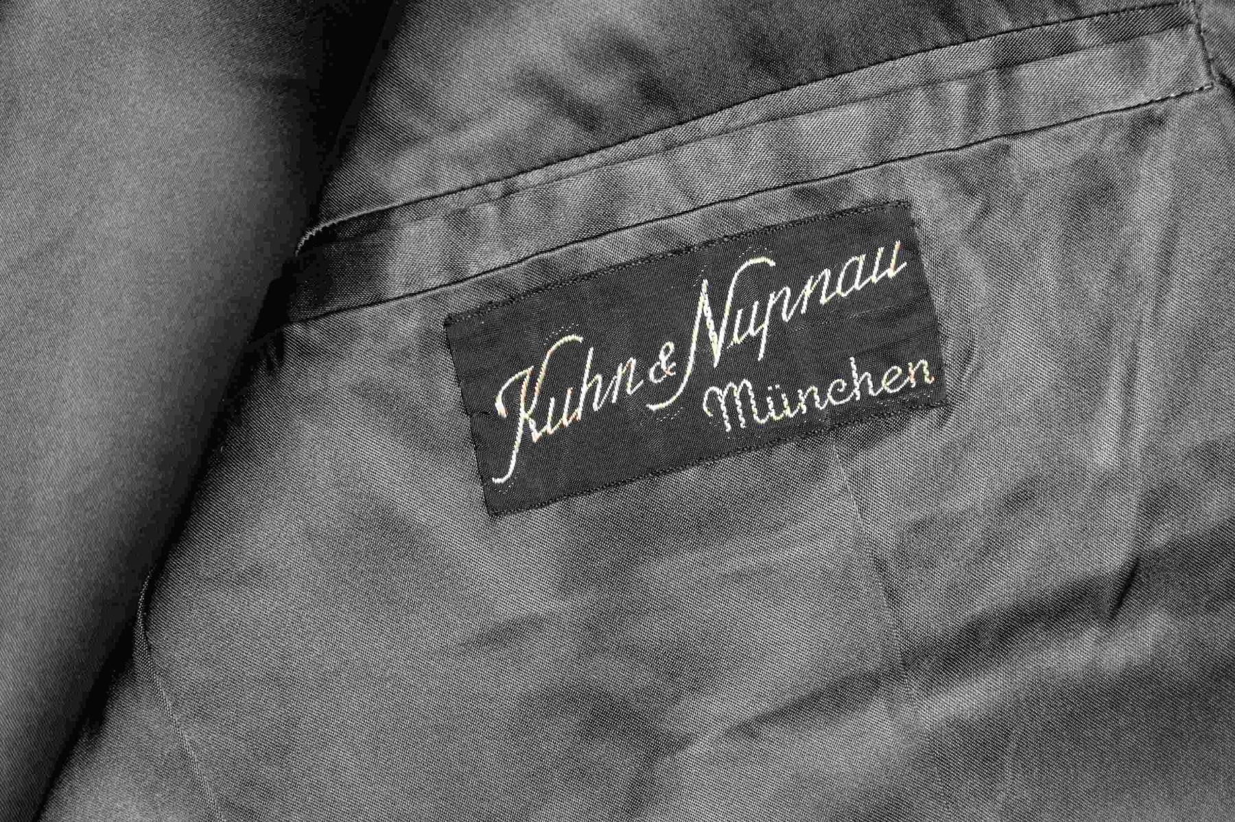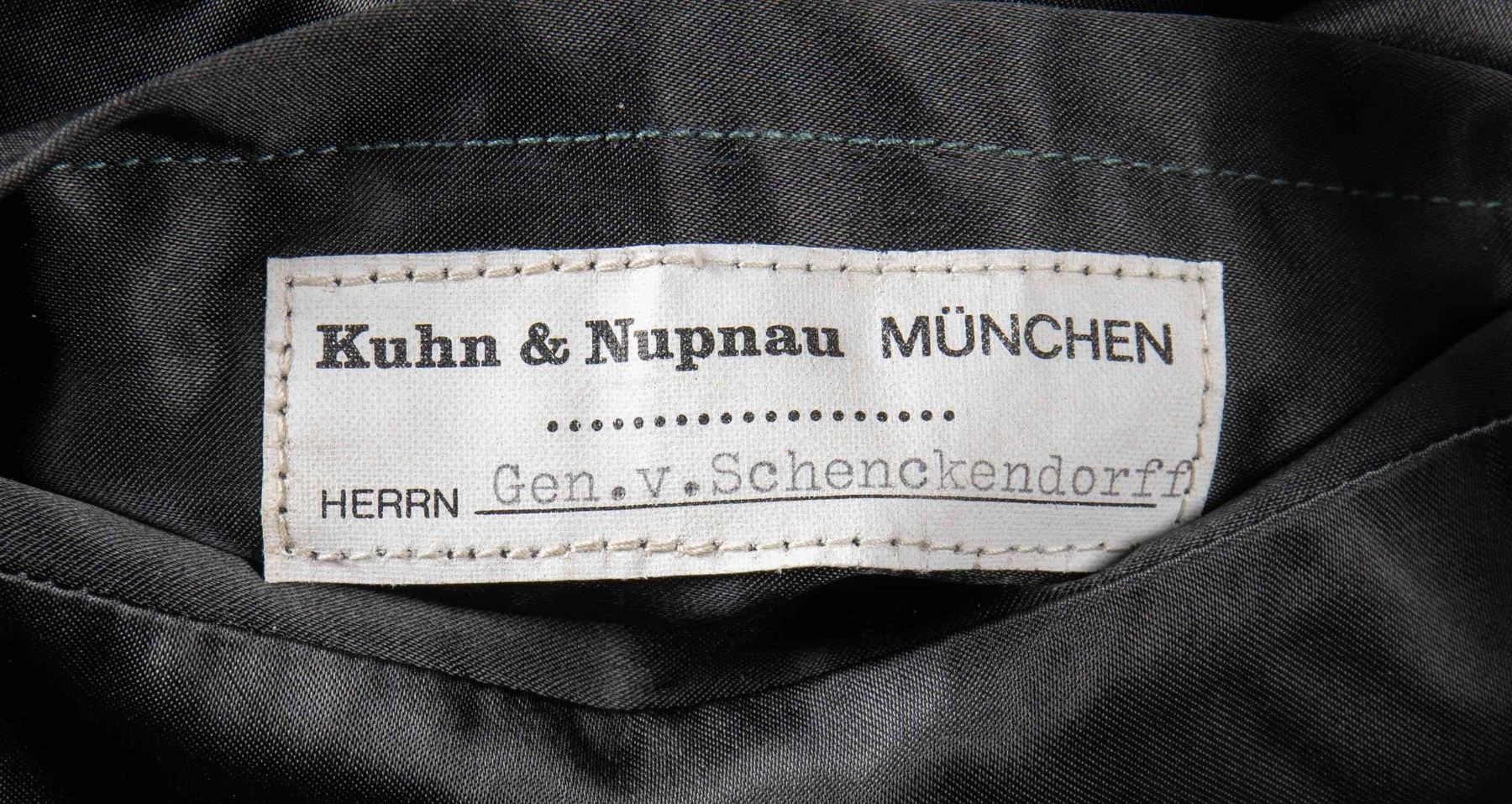 TO GENERAL MAX VON SCHENCKENDORFF.This WWII German Wehrmacht General's tunic allegedly belonged to General Max von Schenkendorff. he was the Commander of Army Group Rear Area behind Army Group Center from March of 1941 until his death in July of 1943. He was a key figure in Operation Barbarosa, the invasion of Russia. The tunic is a deep sage green with a dark green collar featuring red and gold General's collar tabs. The classic gold and silver on red General's shoulder boards have 2 pips which is correct for his rank as of 1940. There is a gold on green General's eagle over the right breast pocket and the pocket itself has an original cloth German Cross in Gold sewn to it. Above the left pocket are six loops for a long medal bar. There are 2 pair of loops on the left breast pocket and one pair below. There are five gold pebble finished buttons down the front and one on each of the four flap pockets. The interior is rayon lined with a tag on the inside pocket that reads " Kuhn & Napnau Munchen ". There is a white tag inside the same pocket that reads " Kuhn & Napnau MUNCHEN HERRN Gen. v. Schenkendorff". After careful and repeated examination, our experts have concluded that this is an exceptionally well made reproduction tunic with an original award attached. We certainly encourage interested parties to examine this tunic in person and form your own opinion. CONDITION: the uniform shows very light wear overall and the German cross shows light wear. (02-24889/BF). $1,000-2,000.
