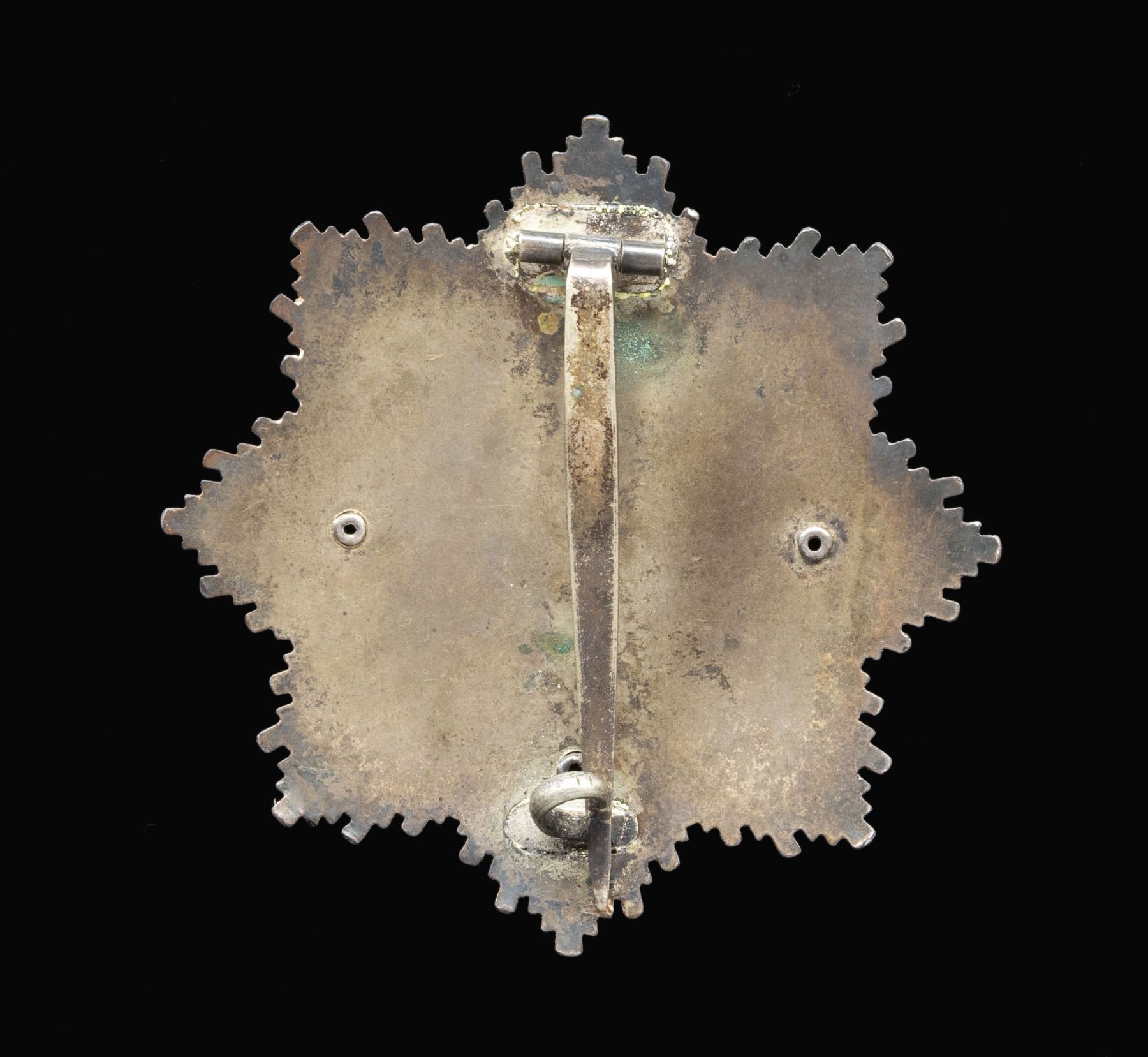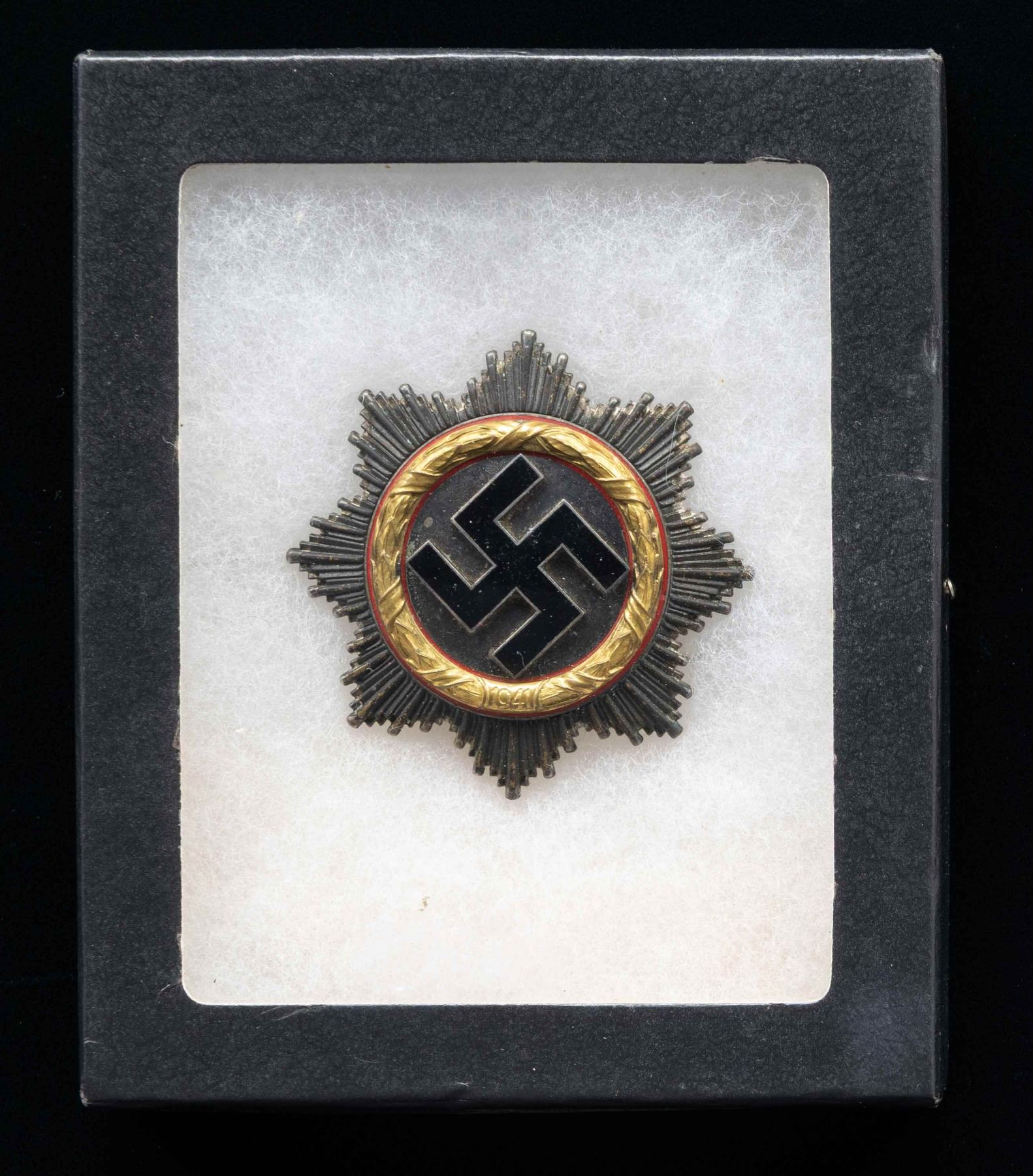 A very fine original WWII German Cross in gold by the noted firm of C. F. Zimmermann of Pforzheim. The badge features a starburst design with a red bordered gold wreath around a silvered center and black enamel Party symbol. The reverse has the expected 4 rivet construction with a wide pin stamped "20" on the back. CONDITION: badge shows light overall wear with the classic Zimmermann die flaw at the 11 o'clock position. The silvered background has a dark tarnished finish. The pin catch is slightly bent as often seen. (02-24878-6/BF). NON-GUN. $1,800-2,800.