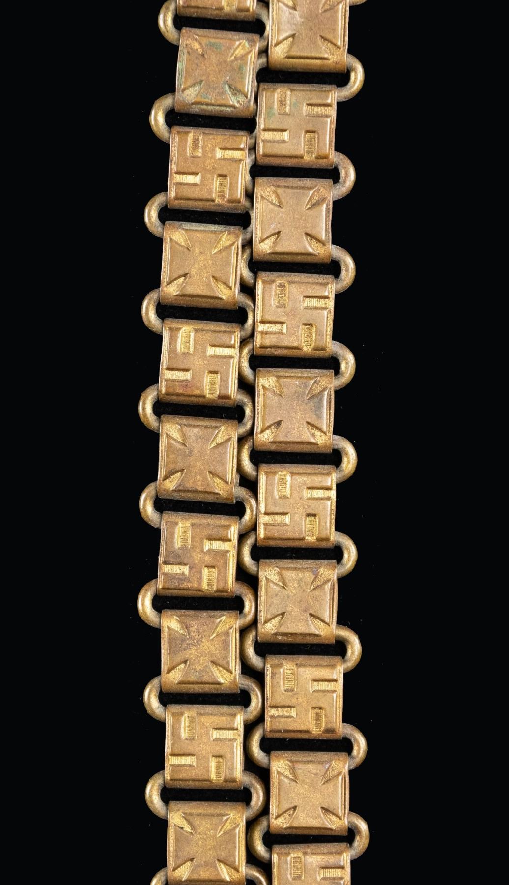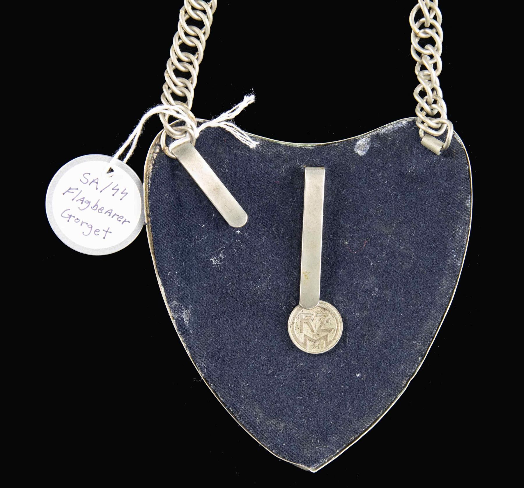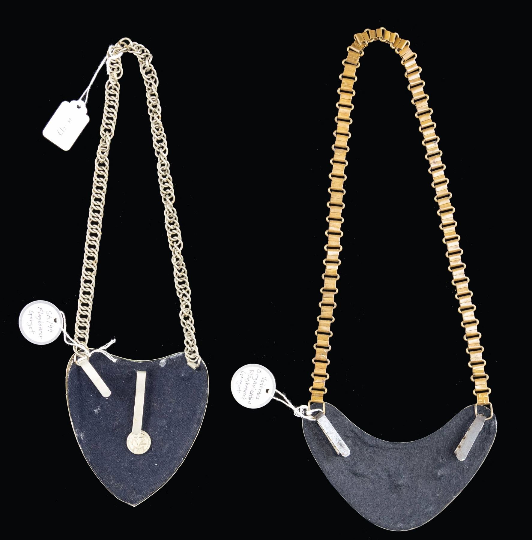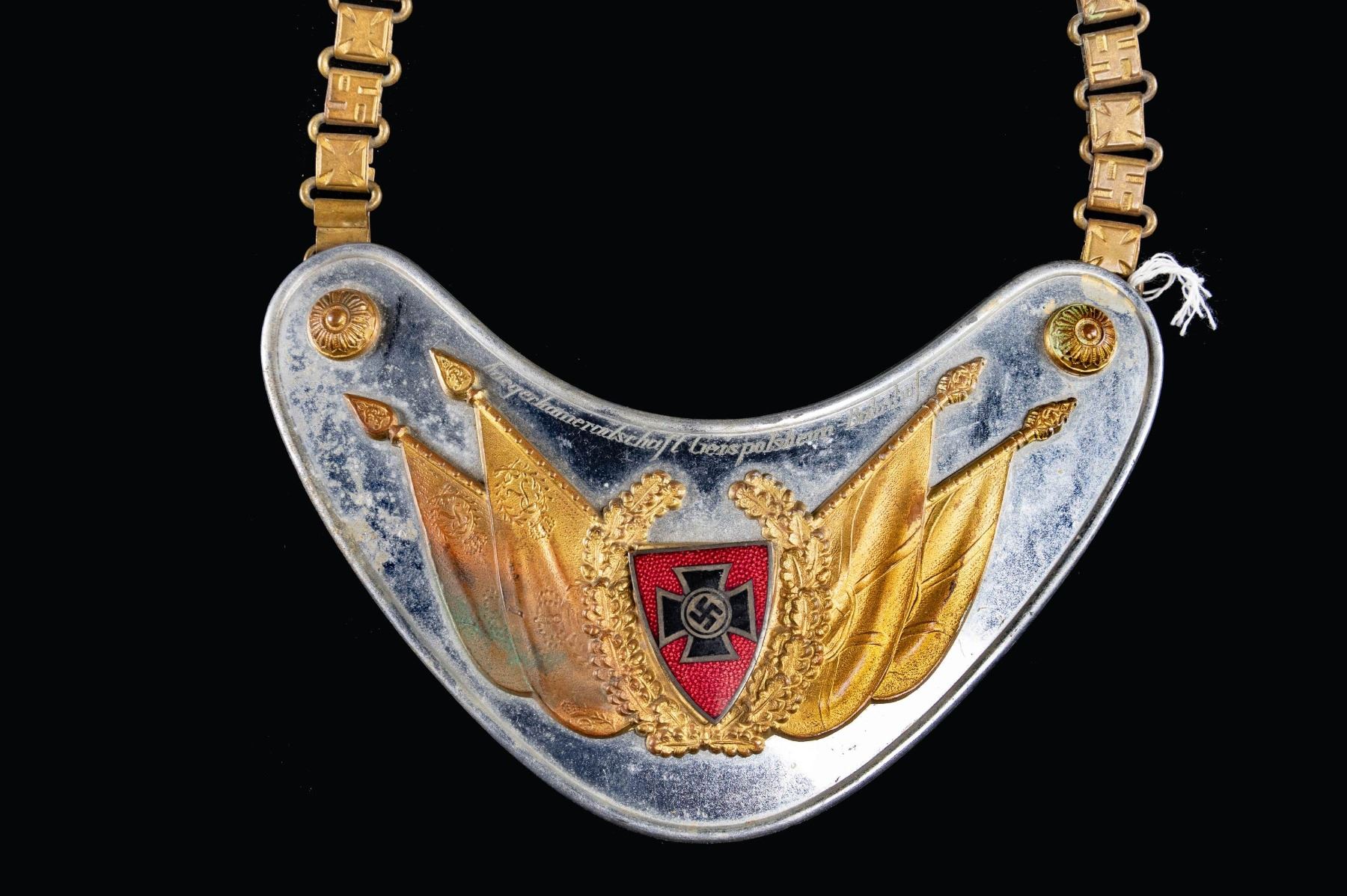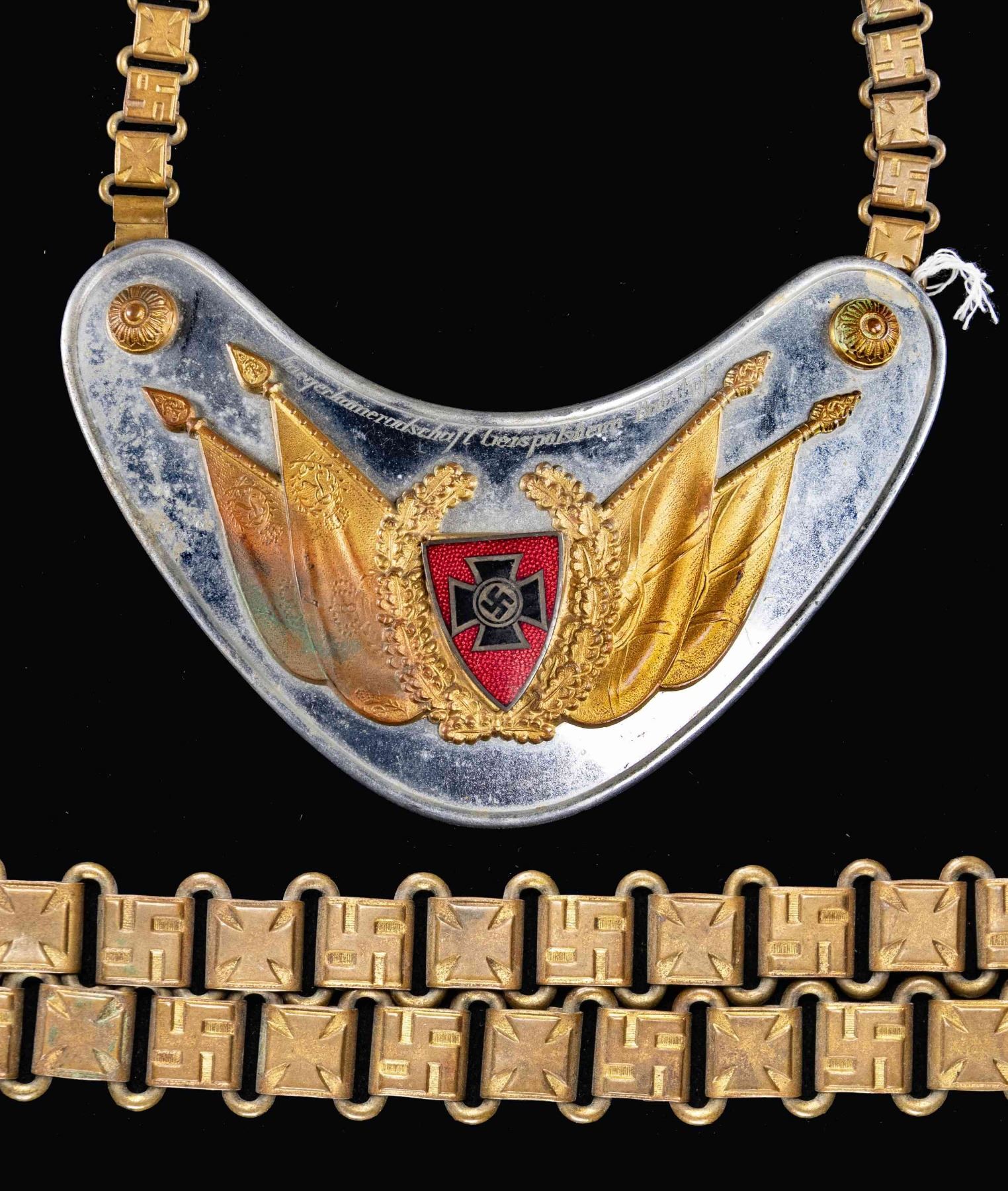 NSRKB STANDARD BEARERS GORGET.1) A scarce WWII German SA or early SS standard bearers gorget. This gorget has a plated body and central early Party eagle roundel with gilded suspension bosses and multi-rayed 8 pointed star. The reverse has black felt and a round metal "RZM" mark. Multi-linked neck chain is complete. CONDITION: light wear throughout. 2) Nice engraved NSRKB standard bearers gorget with gilded bosses and central flag & wreath motif on a plated gorget body. Gilded suspension chain with alternating Party symbol and Maltese cross motifs. The top of the gorget is engraved " Kriegerkameradschaft Geispolsheim-Bahnhof". The reverse has black felt. CONDITION: light wear overall. (02-24883/BF). NON-GUN. $600-900.