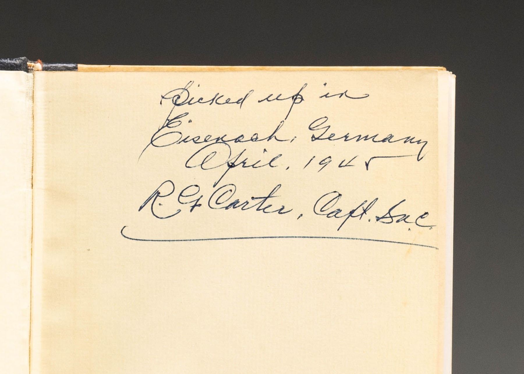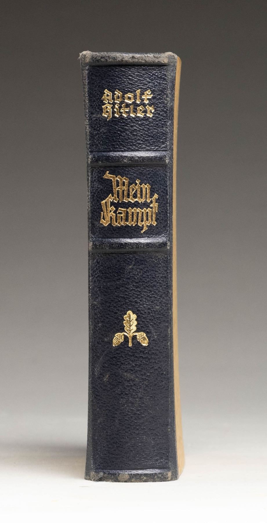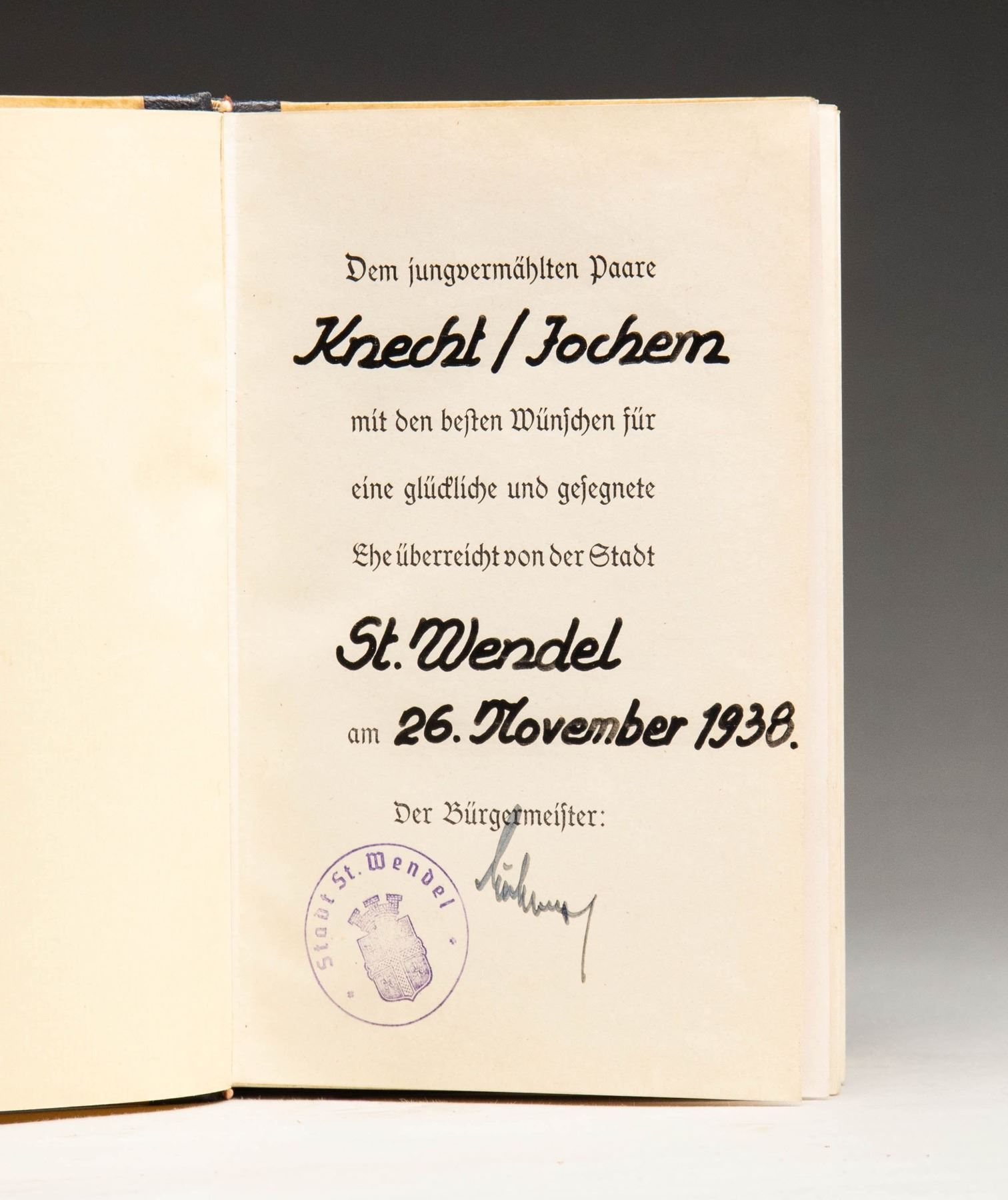 BY THE MAYOR OF ST. WENDEL.A nice 1938 copy of "Mein Kampf" by Adolf Hitler with a presentation page in the front of the book that reads " Dem jungvermahlten Paare Knecht / Jochem mit dem besten Wunschen fur eine gluckliche und gesegente Ehe uberreicht von Stadt St. Wendel am 26. November 1938. Der Burgermeister: (signiture)". The book was a wedding gift from the mayor of St. Wendel, a small town in northeastern Saarland. CONDITION: the book shows light wear throughout and remains quite solid and free of damage. (02-24880/BF). NON-GUN. $300-500.