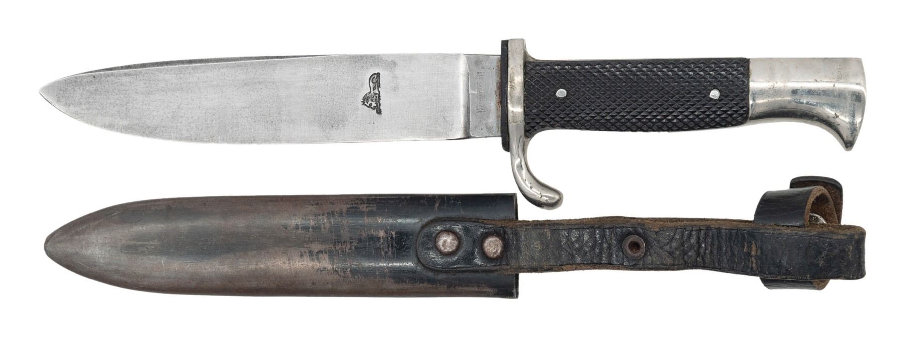 A rarely seen WWII Dutch Youth Storm knife patterned after the German Hitler Youth knife but with the Dutch Jeugdstorm insignia at the center of the front grip. The knife measures 10" over all with a 5 1/2" plain blade marked with a recumbent lion and " MONARCH ". Plated guard and pommel with 2-piece black composite grips. The front grip has an enameled blue and white insignia of the Dutch Fascist Youth organization. Black enameled scabbard with integral leather belt loop. CONDITION: knife shows light overall wear and the scabbard retains 25% of its original finish. Leather is flexed but solid. (02-24981/BF). NON-GUN. $400-600.