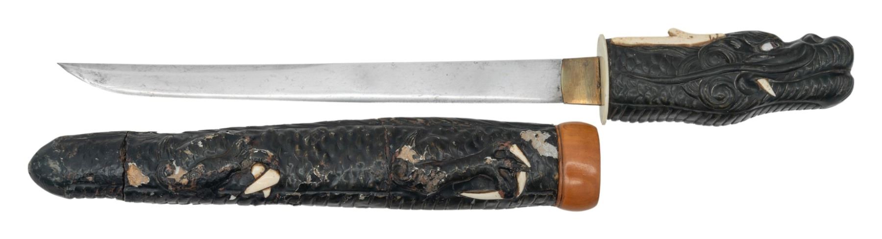 EFFIGY TSUKA AND SAYA. This artistically rendered tanto is likely from Japan or one of its neighboring islands. It measures 16" overall with a 10 1/2" blade and a gilded brass habaki. There is a small tsuba made of an organic white material and the carved wooden dragon head tsuka has organic white horns and fangs. The dragons eyes are painted glass and present a piercing stare. The saya is the wooden and lacquered paper mache body of the dragon with white organic highlights. There is a carved wooden koiguchi with a white organic insert. CONDITION: The blade retains a good polish and the tsuka shows light wear. The saya has drying cracks in a few places and some of the paper mache has flaked away. (02-25817/BF). $400-600.