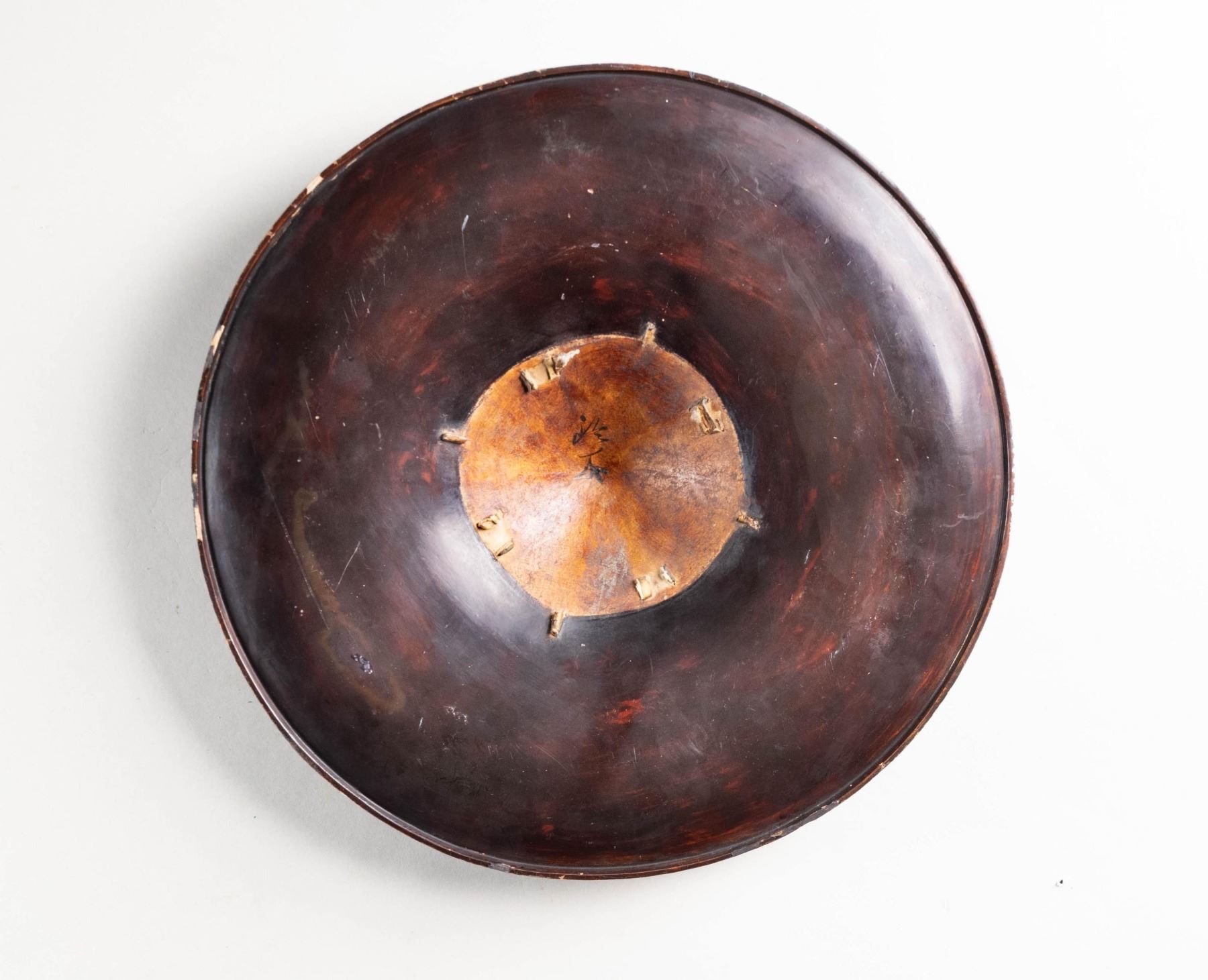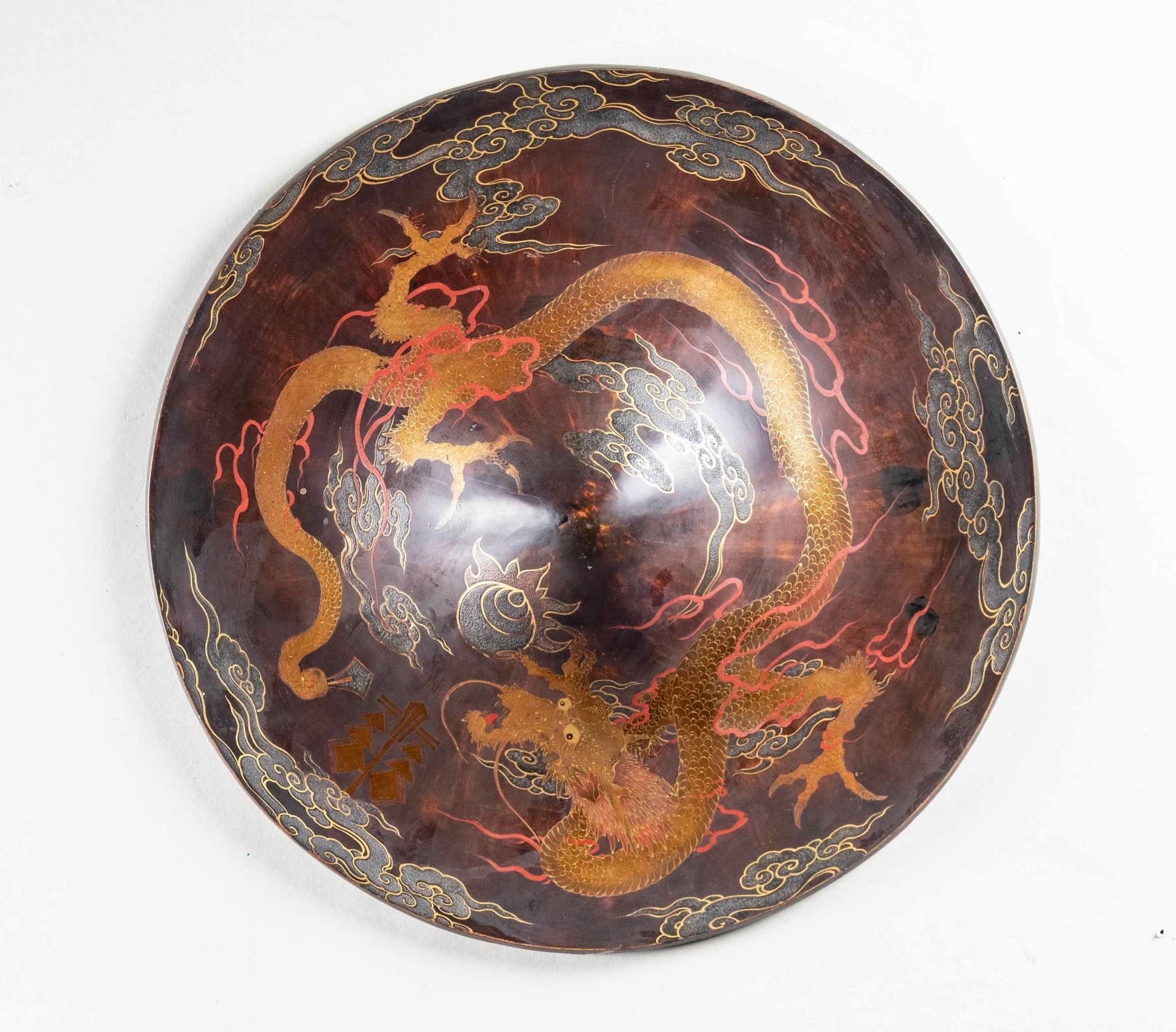 SAMURAI JINGASA. This exceptionally artistically decorated enameled wood jingasa measures about 16 1/2" in diameter with a domed center. The top is decorated with an incredibly detailed dragon encircling the entire jingasa with stylized clouds and red trails that may depict blood. The clouds and dragon are highlighted with gold throughout. The interior surface matches the exterior brown color of the enamel. The very center of the reverse is not enameled and has two Japanese characters written on it in ink. There are four flat and four tubular areas for attachment likely for some sort of liner. CONDITION: This jingasa shows very light wear with only a few minor chips to the edge. The gold highlighted dragon shows some light wear to the decoration. (02-25821/BF). $2000-3000.