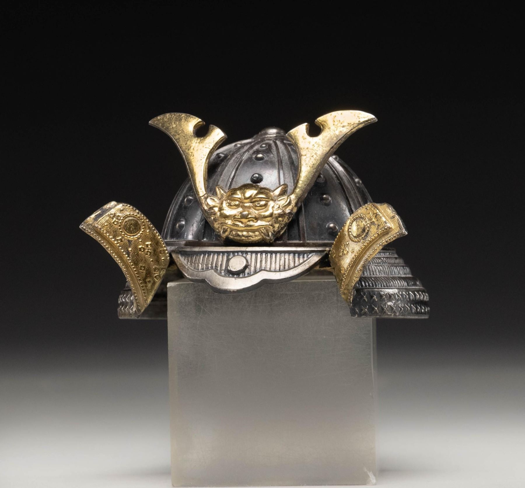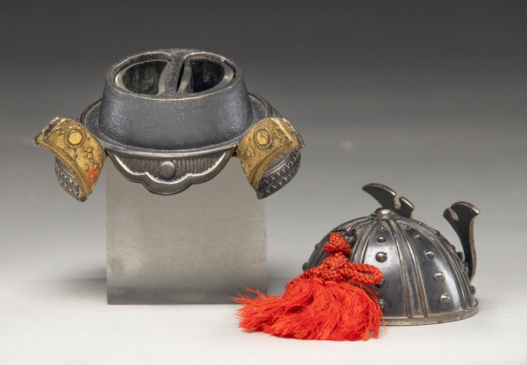 This impressive inkwell measures approximately 2 1/2" x3 1/2" and emulates an Edo period Japanese Samurai helmet. The body of the helmet has a plated finish with a crest on the front and flaps being gilded. A ring at the top of the helmet has a red silk adornment attached. There are two glass inserts in the base of the inkwell likely for two different colored inks. CONDITION: The inkwell is complete and shows light wear overall with a few tiny spots of oxidation. (02-25822/BF). $200-350.