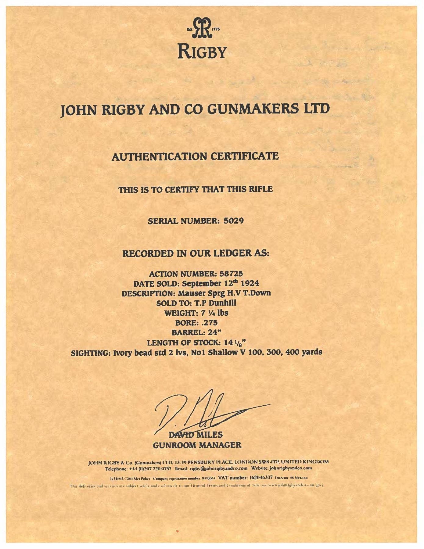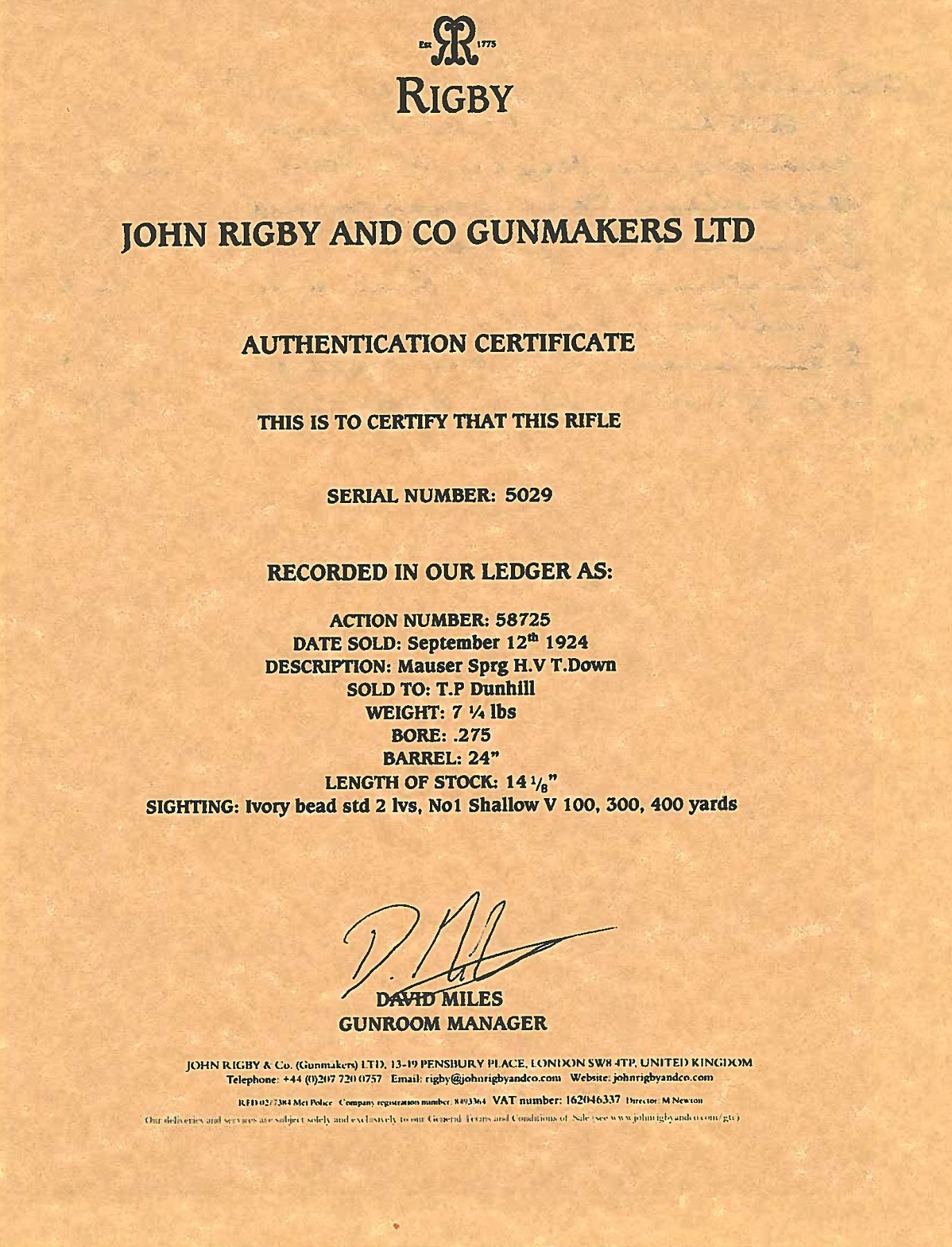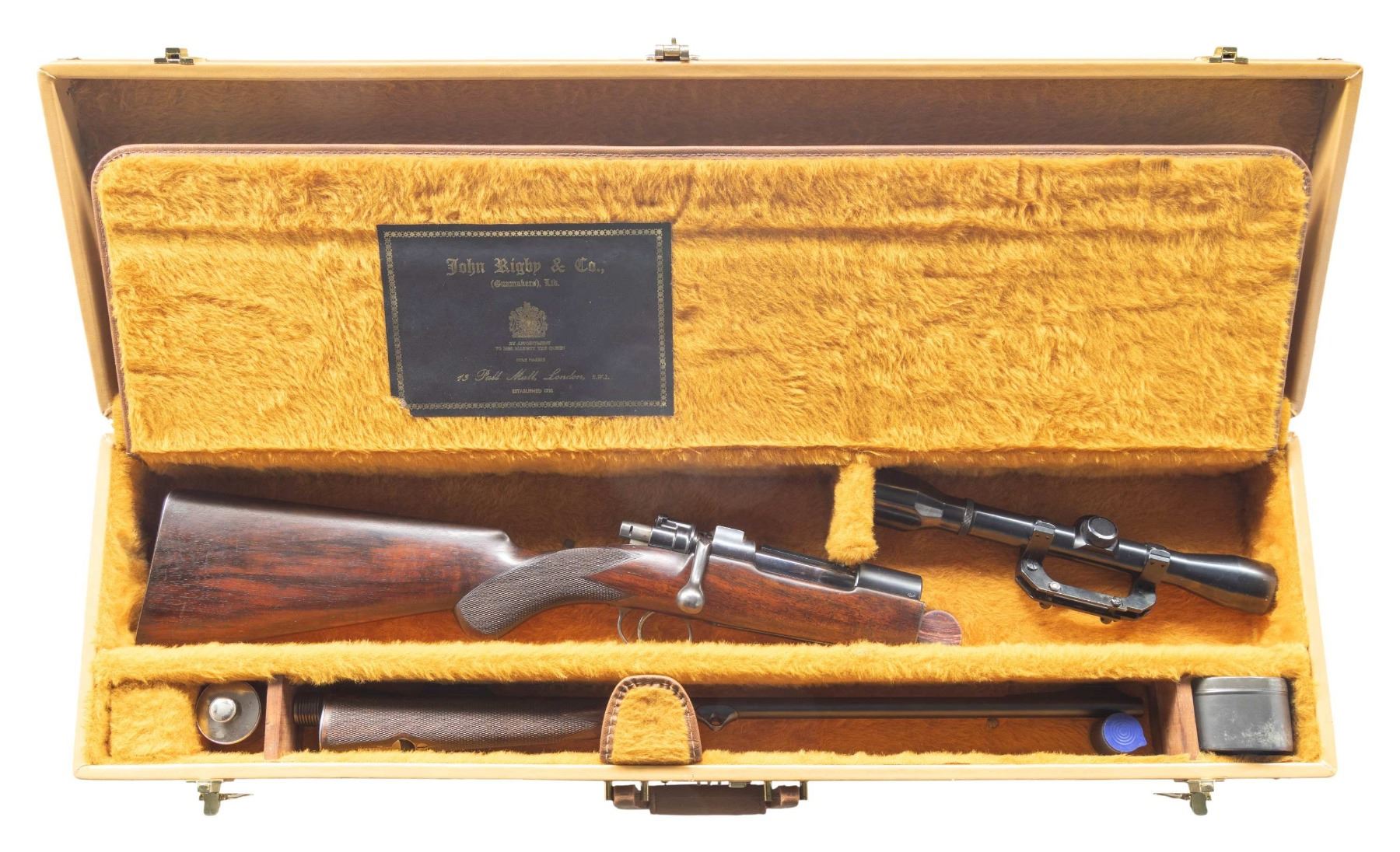 RIFLE WITH SCOPE, CASE AND PAPERWORK. Cal. 7x57 (.275). S# 5029. The 24" lightweight tapered round barrel with London proofs on rear, is fitted with soldered on island base for one standing two folding leaf express rear sight; soldered long ramp front base holding gold bead; and traditionally styled sling eye. Maker's name is not engraved on top. Barrel takes down with Deeley type latch in forend that retracts an indexing pin; barrel can then be unscrewed by hand. Intermediate length large ring commercial Mauser action with square bridge is stamped with original Mauser number "58725" and German proofs on receiver ring along with British "V" proof and Rigby number "5029" (Rigby letter indicates that on September 12th 1924 it was sold to T.P. Dunhill). Sidewall has been fitted with Akah scope base. Bolt is unaltered with proofs and matching Mauser number; flag safety is gold inlaid "SAFE". Original single pull trigger is retained. Bottom metal with standard floorplate has Rigby number on trigger guard bow. Well streaked European walnut round knob pistol grip buttstock measures 14-1/8" over steel buttplate. Point pattern checkering is at grip and forend and a sling eye is on toeline. Rifle is fitted with Weaver K4-W scope with crosshair and post reticle in Akah double lever side mount. UNATTACHED ACCESSORIES: rifle is housed in new light tan leather trunk case lined in gold fur with internal dust cover. Inside of flap has Rigby label. Case contains: the scope, round plated oil bottle, tin of cleaning patches and a small plastic jar of grease; other items are: Rigby authentication certificate, test targets and other paperwork. CONDITION: fine as partially refurbished. Replacement barrel retains nearly all of its original blue. Action retains most of its original blue with most temper blue remaining on extractor, bolt stop and floorplate. Traces of original blue are on buttplate. Stocks retain most of their original oil finish with light marks and a few scratches; checkering lightly worn. Bore is bright and shiny. Mechanically fine. Scope is very fine, as is later mount. Case is relatively new. PROVENANCE: From the Buckstix Collection. (25-6350/MGM). CURIO. $6,000-9,000.