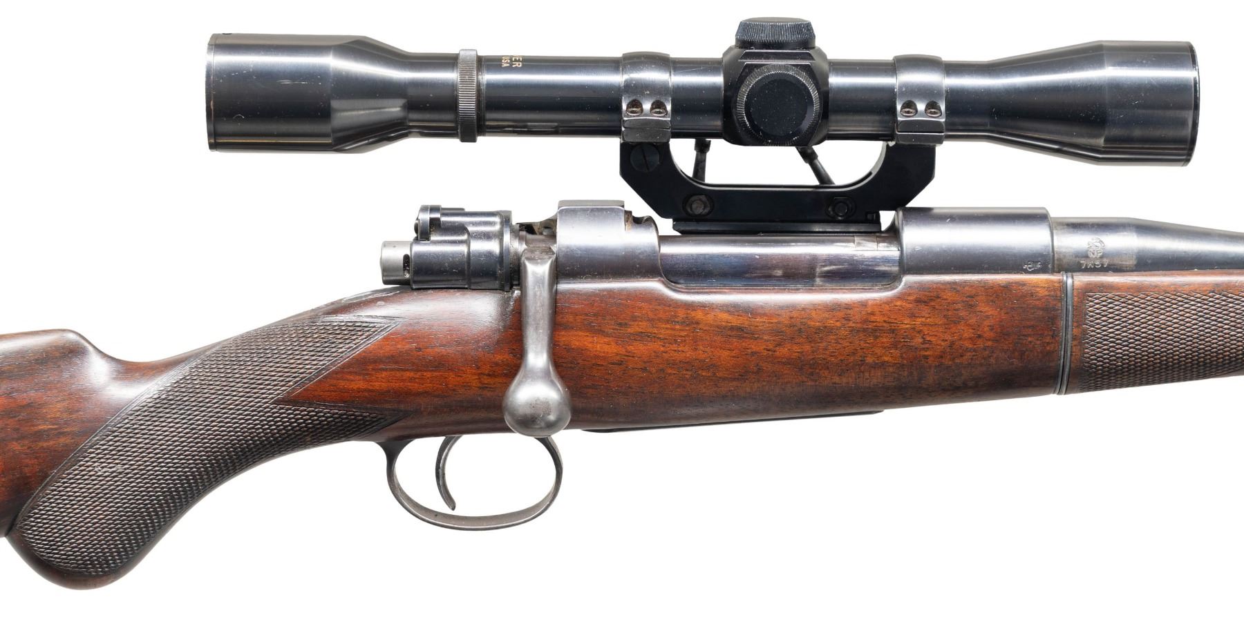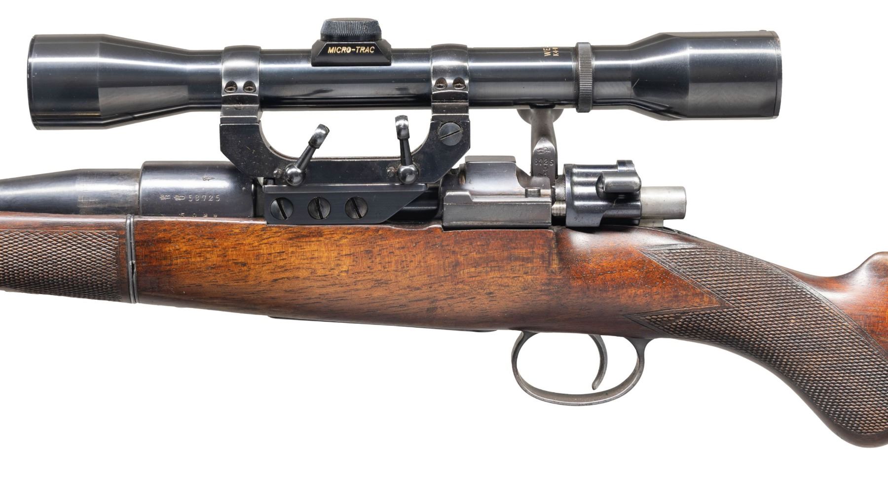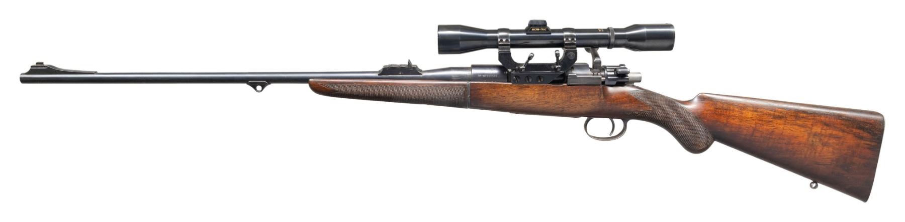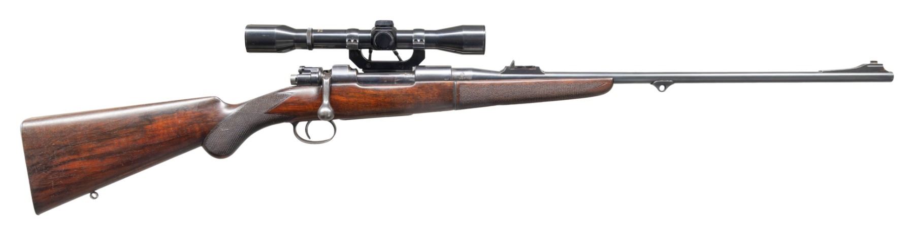 RIFLE WITH SCOPE, CASE AND PAPERWORK. Cal. 7x57 (.275). S# 5029. The 24" lightweight tapered round barrel with London proofs on rear, is fitted with soldered on island base for one standing two folding leaf express rear sight; soldered long ramp front base holding gold bead; and traditionally styled sling eye. Maker's name is not engraved on top. Barrel takes down with Deeley type latch in forend that retracts an indexing pin; barrel can then be unscrewed by hand. Intermediate length large ring commercial Mauser action with square bridge is stamped with original Mauser number "58725" and German proofs on receiver ring along with British "V" proof and Rigby number "5029" (Rigby letter indicates that on September 12th 1924 it was sold to T.P. Dunhill). Sidewall has been fitted with Akah scope base. Bolt is unaltered with proofs and matching Mauser number; flag safety is gold inlaid "SAFE". Original single pull trigger is retained. Bottom metal with standard floorplate has Rigby number on trigger guard bow. Well streaked European walnut round knob pistol grip buttstock measures 14-1/8" over steel buttplate. Point pattern checkering is at grip and forend and a sling eye is on toeline. Rifle is fitted with Weaver K4-W scope with crosshair and post reticle in Akah double lever side mount. UNATTACHED ACCESSORIES: rifle is housed in new light tan leather trunk case lined in gold fur with internal dust cover. Inside of flap has Rigby label. Case contains: the scope, round plated oil bottle, tin of cleaning patches and a small plastic jar of grease; other items are: Rigby authentication certificate, test targets and other paperwork. CONDITION: fine as partially refurbished. Replacement barrel retains nearly all of its original blue. Action retains most of its original blue with most temper blue remaining on extractor, bolt stop and floorplate. Traces of original blue are on buttplate. Stocks retain most of their original oil finish with light marks and a few scratches; checkering lightly worn. Bore is bright and shiny. Mechanically fine. Scope is very fine, as is later mount. Case is relatively new. PROVENANCE: From the Buckstix Collection. (25-6350/MGM). CURIO. $6,000-9,000.