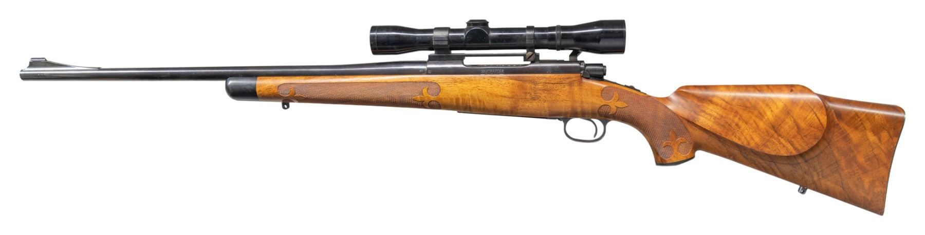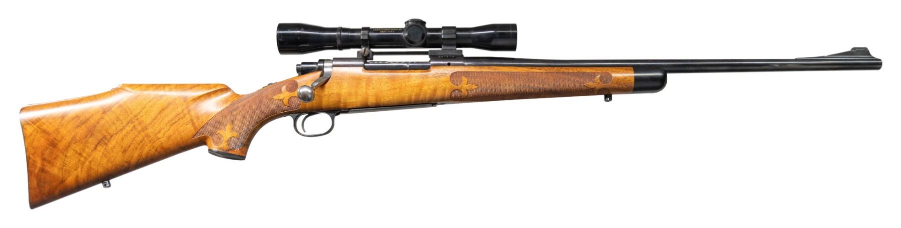 SCOPE. Cal. 30-06. S# 247278. The 20" lightweight barrel has all visible Winchester markings removed except for Winchester proof mark on left rear. A long front sight ramp is soldered on which holds gold bead. Pre-64 model 70 action has had custom tang safety added by Anderson (stamped on transfer bar). Standard bottom metal is retained. Pistol grip stock made of nicely figured French walnut measures 13-1/2" over Neidner steel buttplate and features swept Monte Carlo shadow line cheekpiece, ebony grip cap with gold diamond at center, ebony forend tip and sling eyes. Leonard Mews stamp is in barrel channel and stock is checkered in his very cleanly cut fleur-de-lis pattern. Rifle is mounted with Leupold Mountaineer 4X scope with crosshair reticle with leather lens covers in Redfield rings and one piece base. CONDITION: very fine as custom finished. Metal retaining nearly all its original custom blue. Stock retains essentially all its fine original oil finish with only a very few minor marks and dents; one found on edge of cheekpiece the other found in front of bottom metal. It appears forend is warped downward slightly leaving barrel high. Bore is bright and shiny throughout. Mechanically fine. Scope is also fine with a few exterior marks; optically clear. PROVENANCE: From the Buckstix Collection. (25-6500/MGM). CURIO. $2,500-3,750.