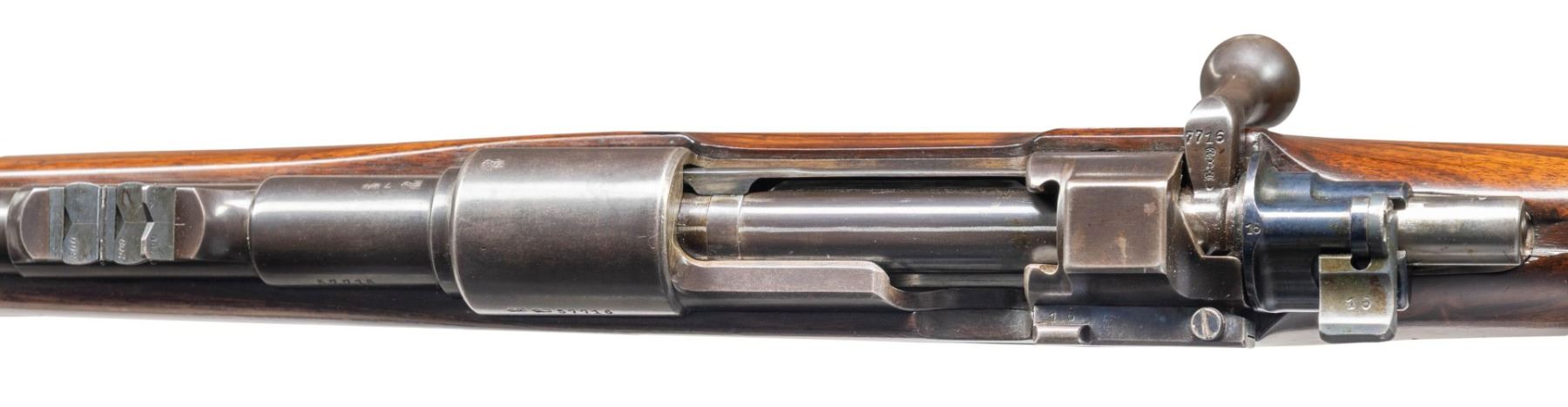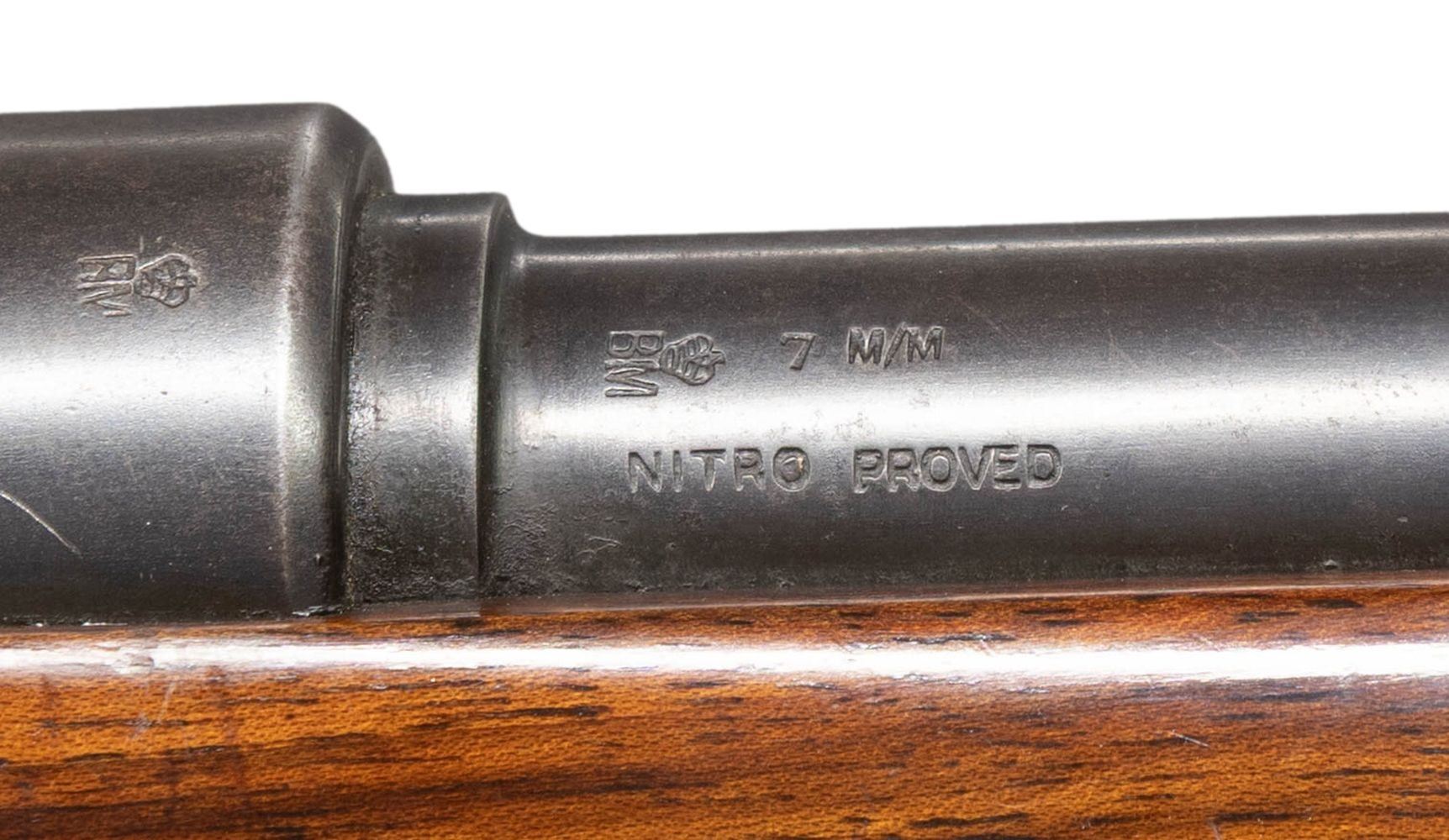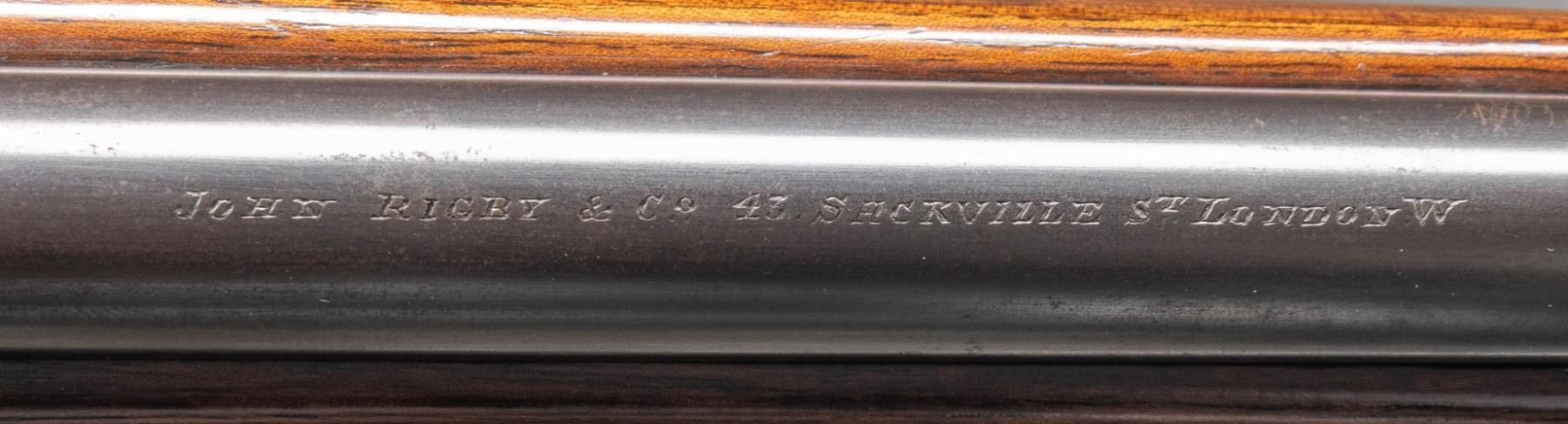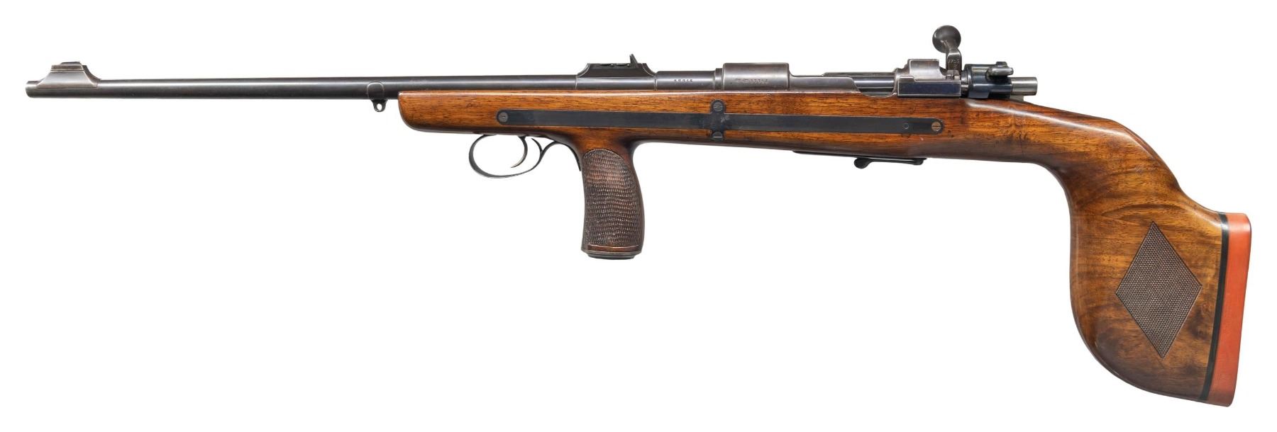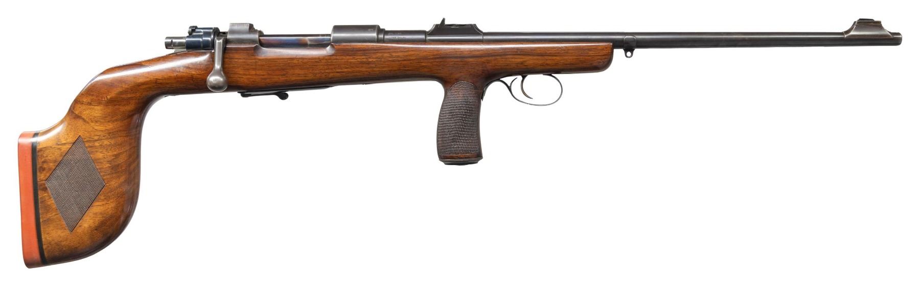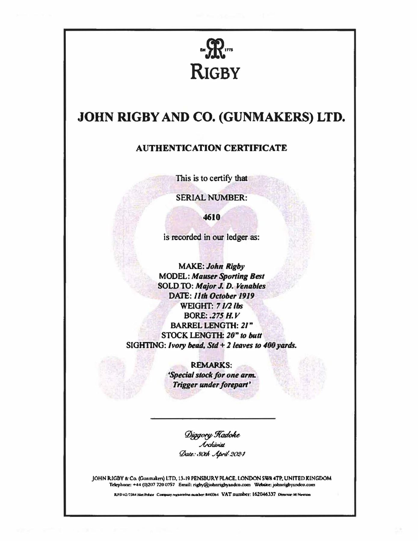 VETERAN. Cal. 7x57. S# 57716 (Mauser). Rigby # 4610 (1919). Rigby factory records indicate this rifle was made on 11 October 1919 for a Maj. J. D. Venables. "Stock for one arm". J.D. Venables was a Major in the First Battalion Royal Welch Fusiliers and earned the DSO. This unit was much blooded during WWI with thousands of casualties in such battles as Zandvoorde, Belle Waarde Ridge and battle of the Somme. Rifle has 21-1/2" barrel with sleeved on base for one standing, two folding leaf express rear sight, partially sleeved on sling eye and silver bead front sight in standard Rigby base. Top of barrel is engraved "John Rigby & Co 43 Sackville St. London. W.". British "BV" proofs, caliber and S# are on rear. Intermediate length square bridge Mauser action with "BU" proofs and S# on left side of large receiver ring has had Mauser info removed from side wall, bolt handle slightly turned down. Bottom metal with hinged floorplate having lever release is altered with removal of trigger guard and trigger hole plugged. Specially made stock exhibits Rigby styling and has butt shaped with deep extension of grip area which is fitted with a Silver pad. A peg type pistol grip is formed under rear sight area and fitted with trap grip cap. A new trigger is installed in this area with long rod held by steel sideplate remotely engaging modified original trigger and sear. A shotgun type trigger guard is installed with bow marked with Rigby S# 4610 (Rigby #4571 is stamped on action seen out of wood). Diamond shaped panels of checkering are on each side of butt area; front grip is also checkered. This rifle can be used with either arm by placing muzzle on ones foot. Rifle could be stopped from rotating with knee contact to operate bolt and then raised into position for firing. CONDITION: very fine. Metal retaining about 85% original blue. Trigger guard with possible period of use re-blue has Rigby number very light. Stock has nearly all its original finish. Bore is bright and shiny. Mechanically fine. PROVENANCE: From the Buckstix Collection. (25-6447/MGM). CURIO. $4,000-6,000.
