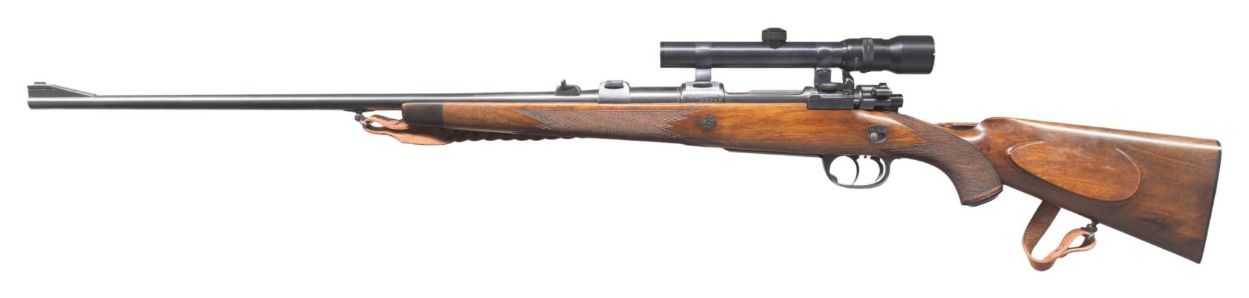 ACTION SPORTING RIFLE WITH ACCESSORIES. Cal. 6.5x68S. S# 8742. Bbl. 26". Mauser 98 pattern action bolt action sporting rifle mfg. by the firm Christoph Friedrich Triebel in 1941. The top of the rnd. tapered bbl. is engraved with the retailer marking "WILHELM EBLEN. STUTTGART.", followed by "PATRONE/ 6,5 x 68S", which is engraved horizontally towards the breech. Left side of the bbl. is engraved "ROCHLING SONDERSTAHL R7L", which is repeated below the wood line, followed by the S#, an Eagle/N commercial nitro proof (repeated on left side of chamber and on the top of the bolt root), "Suhl", an unidentified shielded logo, and the date code "141" (January, 1941). The receiver features light decorative border engraving (which extends to the breech end of the bbl.), with some small highlights of scrollwork. Trigger guard features wavy line engraving along the edges, which terminates in a geometric pattern at the rear, with a small scroll motif engraved at the center of the bow. Floorplate exhibits matching pattern engraving, with "CHR.FRIEDR.TRIEBEL" engraved towards the center between 2 scroll motifs. Stock crossbar is engraved with a foliate motif on either side. Metal components exhibit a professionally reapplied blue finish overall, save for on the bolt body and extractor which are polished in-the-white. Lightly sanded and refinished 1-piece horn tipped wood pistol grip stock features a wrap around checkered panel on the forearm, checkered panels on either side of the wrist, a Greener safety, oblong dark horn pistol grip cap, left handed cheekpiece, as well as a grooved dark horn buttplate. Toeline of stock features a sling swivel, with the bbl. featuring an integral swivel on the underside. 1-piece trigger guard with hinged floorplate, interior floorplate release lever, as well as adj. double set triggers. Bolt knob features a circular knurled panel on the top, with a flat grooved panel present on the underside. Blade front sight on a finely knurled ramp, with a finely knurled dovetailed fixed blade front sight on an integral island base. Bbl. features a single dual claw scope mount, with the receiver featuring 2 dual claw scope mounts that are currently fitted with K. Kahles Helia-Super 1.5-4.5 scope. All serialized parts are matching, with the receiver and bbl. (below wood line) matching via the full S#, and with the trigger guard and bolt matching via "42". UNATTACHED ACCESSORIES: generic soft case containing a K. Kahles Helia-Super+ 8S2 8x56 fixed power scope. Rifle is also accompanied by 4 loose rds. of RWS 6.5x68mm ammunition. CONDITION: fine, with metal components retaining virtually all of their professionally reapplied blue finish, exhibiting some light superficial handling marks and some small spots of light surface oxidation overall. Sides of bbl. exhibit spots / streaks of light to mild surface oxidation and pitting along the edges of the wood line. Bore is bright, exhibiting scattered spots and patches of mild to moderate pitting, while retaining strong rifling throughout. Rifle is currently unsafe to fire due to slippage of either the cocking piece or sear, resulting in the firing pin being struck upon closing of the bolt or (if not tripped on closing of bolt) firing pin is struck when downward pressure is applied to the bolt. Otherwise, double set triggers function appropriately. Stock is excellent, as lightly sanded and refinished, exhibiting a 3/8" crack on the top of the wrist stemming from the receiver tang, with a small crack on the right side stemming from the rear trigger guard tang. Scopes both retain clear and sharp optics. PROVENANCE: From the Buckstix Collection. (25-6370/MLW). CURIO. $3,000-5,000.