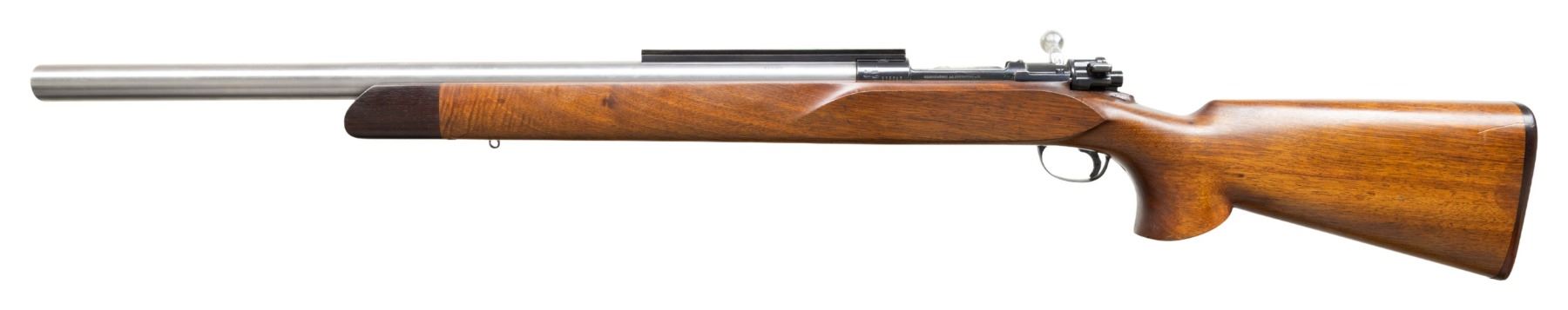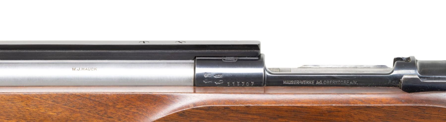 SHOT BENCHREST RIFLE. Cal. 219 Donaldson Wasp. S# 113707. Bbl. 27 1/2". Originally mfg. as a Wehrmanngewehr target rifle by Mauser, this example was later customized and converted into a single shot benchrest rifle by Wilbur J. Hauck of Arlington, Vermont. Left side of the custom heavy stainless steel bbl. is stamped "W.J.HAUCK". Receiver is marked with the Mauser banner logo over the top of the chamber, with German crown over "B", "U", "G", and "N" commercial proofs, followed by the S# marked on the left. Left receiver wall is marked "MAUSER-WERKE A.G. OBERNDORF A/N.". Receiver, bolt shroud, cocking piece, and trigger guard exhibit a blue finish, with the bolt body, extractor, handle, and knob being polished in-the-white. Massive 1-piece custom wood benchrest stock features a dark wood forearm tip, 2 brass vibration stablizing screws, flared pistol grip, as well as a dark wood buttplate. Underside of forearm is fitted with a sling swivel stud. Top of stock features a cut to allow for operation of the bolt stop housing. Bbl. is drilled and tapped with 3 sets of plug screws, the 2 rearmost sets currently fitted with a blued steel dovetail optic rail. Adj. Canjar single set trigger with grooved trigger shoe. All serialized parts are matching and include the receiver, bolt stop housing, bolt body, shroud, safety lever, and cocking piece. CONDITION: metal components retain the vast majority of their blue finish, exhibiting some light edge wear overall. Bolt stop housing retains the majority of its nitre blue finish, exhibiting light to mild edge wear. Bolt retains a mostly bright appearance, with scattered spots of age related discoloration. Mirror bore, retaining well defined rifling throughout. Proper manual mechanics. Stock exhibits scattered marks and impressions from handling and storage, but otherwise presents nicely. Wood buttplate exhibits a crack that runs through the upper buttplate screw, but otherwise appears sound. PROVENANCE: From the Buckstix Collection. (25-6476/MLW). MODERN. $1,200-1,800.