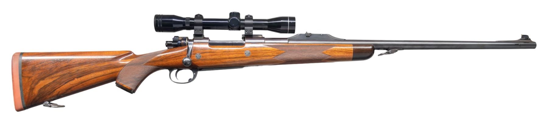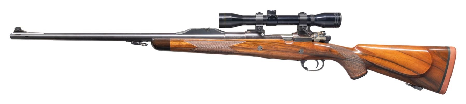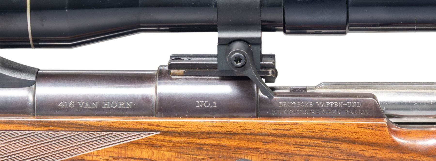 BOLT ACTION RIFLE WITH SCOPE. Cal. 416 Van Horn. S# 1. The 416 Van Horn appears to be the 460 Weatherby magnum shortened and necked down. Walter Abe was a very well-known custom rifle maker who originally worked for Roy Weatherby in the 50's & 60's. This well made rifle has 24" medium weight barrel fitted with custom elevation and windage adjustable express rear sight set into a custom island base. Gold bead front sight is in Williams ramp. Muzzle is ported, a sling eye is soldered to bottom, top of barrel is engraved "WALTER ABE - RIFLEMAKER - L.A. CALIF. - 1977". Caliber is engraved on left rear. Mauser model 98 standard length action by DWM appears to be sourced from a model 1909 Argentine rifle. Left side of receiver ring is engraved "NO. 1". Bolt stop has been altered with finger piece checkered, bolt has been lowered for scope use, bolt shroud is case hardened and fitted with Buehler safety. Scope bases are fitted, a commercial trigger is installed, bottom metal has been nicely reshaped and polished. Pistol grip stock of attractively marbled thin shell walnut is finished in a style seen on other rifles by Abe and measures 13 5/8" over "Old English" pad and features swept shadow line right hand cheek piece, rosewood forend tip and grip cap, two case hardened recoil bolts and sling eye on toeline. Borderless point pattern checkering at grip and around forend is very well done. Rifle is fitted with Japanese 2.5 X scope with duplex reticle in QD rings. CONDITION: very fine, retaining over 90% custom finishes on wood and metal, wood showing a fair number of scratches and marks. Bore is bright and shiny, mechanically smooth. Scope is good, optically clear. A very nicely appointed rifle. PROVENANCE: From the Buckstix Collection. (25-6375/MGM). MODERN. $3,000-5,000.