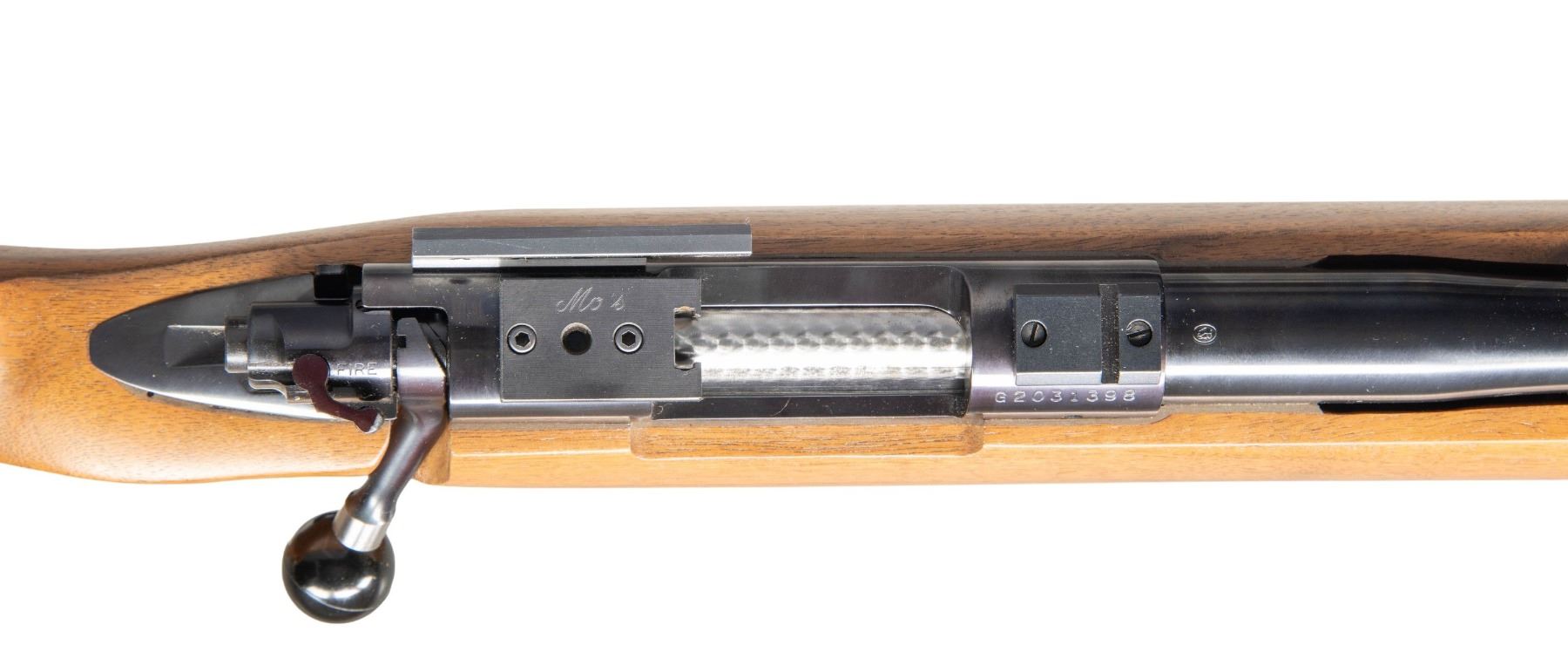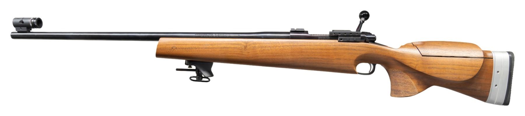 ACTION RIFLE. Cal. 223 Rem. S# G2031398. Bbl. 26" heavy tapered having .700" muzzle with recessed crown; marked "SPORTER VARMINT". Mfg. 1991 being drilled and tapped for front sight base on barrel and scope mounts on receiver. Fitted with front sight base having RPA globe sight with iris polarizer. Front bridge of its short action receiver has steel Weaver style base plus Mo's stripper clip charger on rear bridge. Multi position target sight base on left rear of receiver. Bolt knob machined round to accept its large black knob. Fitted with Jewel stainless 2 stage trigger. Factory trigger guard used without floorplate. Match target stock with front rail having rotational hand stop and swivel. Deep magazine section similar to Palma style. Microbedded action and first portion of barrel; has aluminum action pillars. Pistol grip area has RH palm swell and stippling of Anschutz style. Butt has adjustable comb and adjustable aluminum buttplate with Pachmayr basket weave pad. Utilizes blind magazine box assembly from original rifle. CONDITION: an occasional light handling mark, but overall near excellent to include bore. (25-3702/NW). MODERN. $650-900.