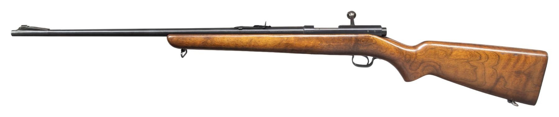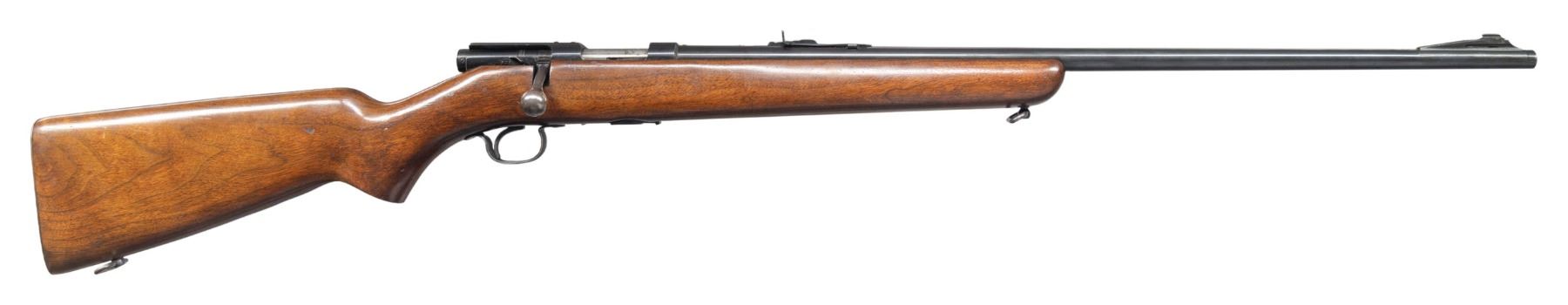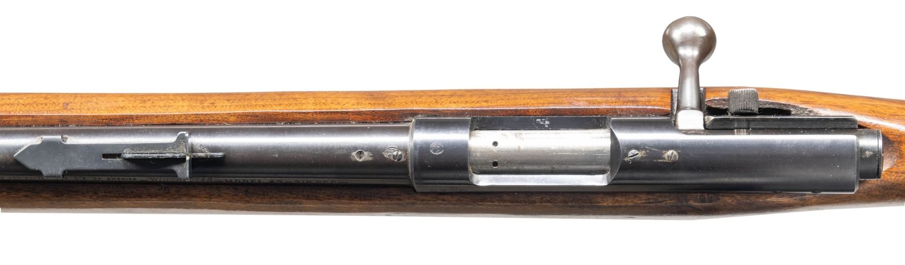 RIFLE. Cal. 218 Bee. S# 4256. Bbl. 24 1/2". Model 43 bolt action rifle chambered in .218 Bee mfg. by Winchester circa. 1949-1957. Left side of the bbl. is marked with Winchester's mfg. information, followed by the Winchester trademark logo, as well as the model and cal. designations. Left side of the receiver is marked with the S# "4256". Metal components exhibit a blue finish overall, save for on the bolt body, which is polished in-the-white. 1-piece plain wood pistol grip stock with checkered steel buttplate. Toeline of butt and underside of forearm feature sling swivels. Ramped aluminum beaded blade front sight and dovetailed U-notch rear sight. Top of receiver (to rear of ejection port) and bbl. (towards breech) are each drilled and tapped with 2 holes and plug screws. Bolt matches the receiver via the full S#, which is electro-penciled on the underside of the bolt body. MAGS: 1 unmarked blued steel 4-rd. mag. CONDITION: metal components retain the vast majority of their original factory blue finish, exhibiting some superficial handling marks overall. Sides of bbl. at muzzle exhibit some areas of light to mild thinning. Bolt knob has faded to a gray patina, exhibiting some spots of dark surface oxidation, with wear fading to gray patina present on the rear of the bolt assembly. Trigger guard exhibits light to mild wear (primarily on edges), scattered handling marks, and scattered spots of light surface oxidation. Mirror bore, retaining well defined rifling throughout. Proper manual mechanics. Wood furniture shows scattered superficial marks and minor impressions from handling and storage, but otherwise remains sound. PROVENANCE: From the Buckstix Collection. (25-6462/MLW). CURIO. $800-1,200.