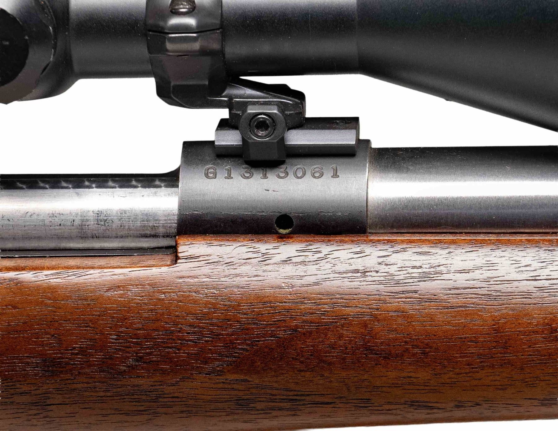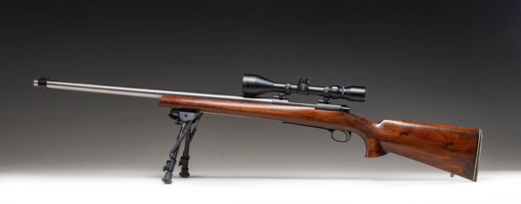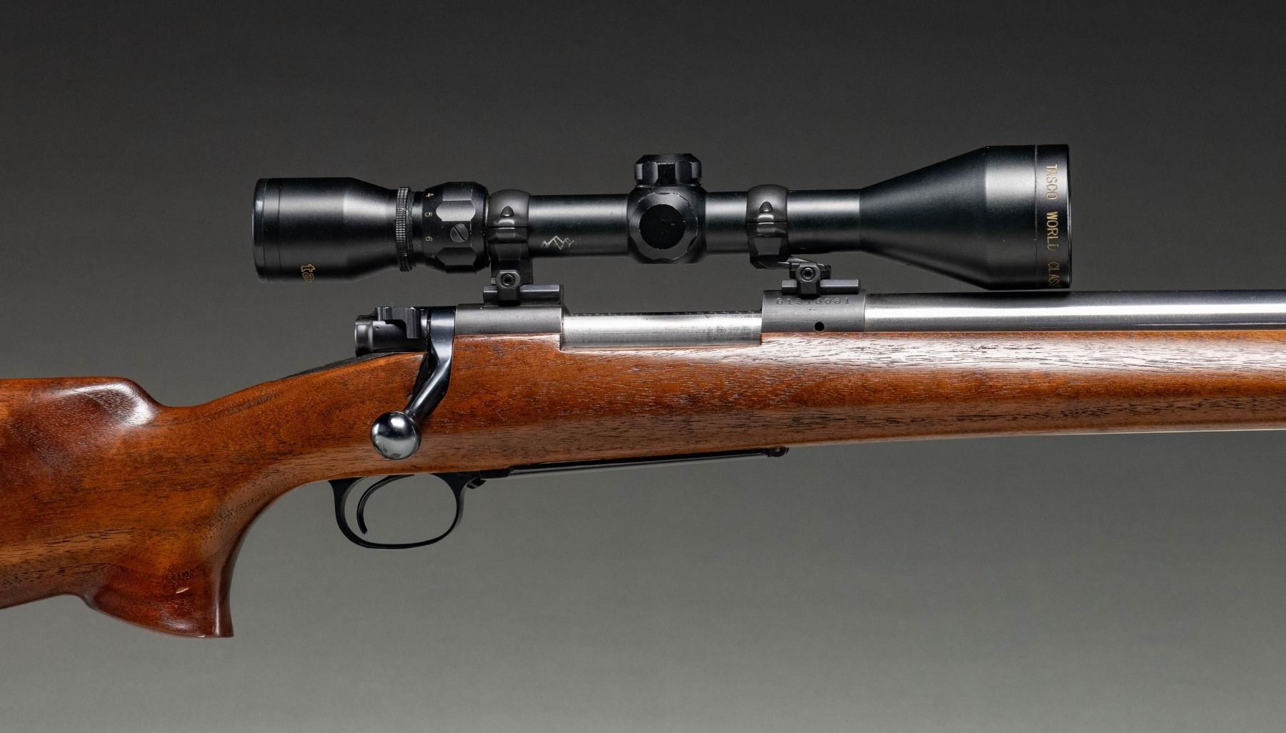 ACTION TARGET RIFLE. Cal. 308 Win. S# G1313061. Bbl. 26 7/8". Model 70 bolt action rifle mfg. by Winchester in 1977 and subsequently customized into a target/competition configuration. The underside of the heavy tapered stainless steel Obermeyer bbl. is marked "1588 308 11/ 7-78 111", followed by "BJQ/ RTD". Receiver exhibits standard factory markings, with an apparent "HALPLAIT" or "HALPLATT" lightly etched on the underside. Receiver exhibits a matte blue finish, with the bolt handle, bolt shroud, trigger guard, and floorplate exhibiting a polished blue finish. Bolt body is jeweled and polished in-the-white. 1-piece plain wood pistol grip stock features an aluminum hand stop rail on the underside of the forearm (currently fitted with a Harris 1A2 Ultralight bipod), a flare at the bottom of the pistol grip, as well as a Mershon Company "White Line" Sure Grip grooved black rubber recoil pad. Bbl. features a removable black anodized aluminum dovetail mount. Receiver is drilled and tapped with 2 dovetail rails and 2 scope rings, featuring a TASCO World Class 3-9x50mm scope. CONDITION: metal components retain the vast majority of their factory finishes, exhibiting some superficial handling marks overall. Brilliant mirror bore, exhibiting sharp and well defined rifling throughout. Proper manual mechanics. Stock shows a few scattered superficial marks and small impressions, but otherwise remains very good to excellent overall. Scope retains a clear and sharp optic. PROVENANCE: From the Buckstix Collection. (25-6491/MLW). MODERN. $1,800-2,700.