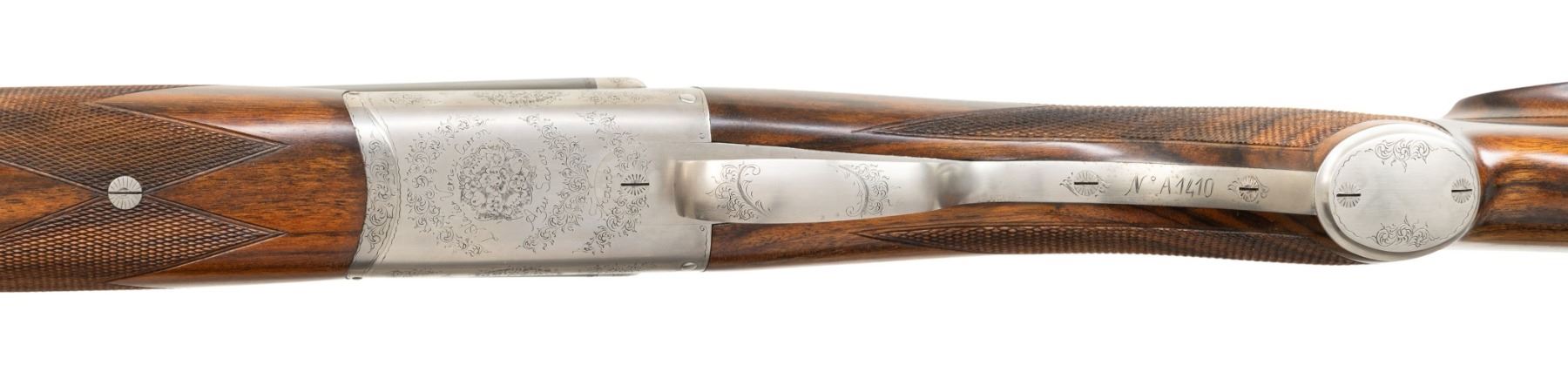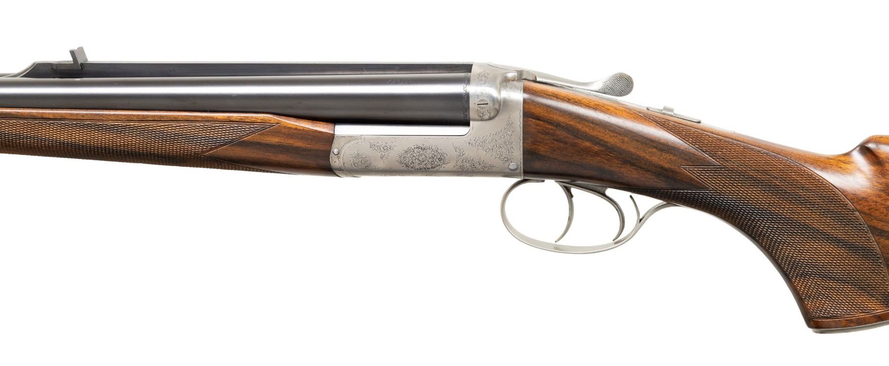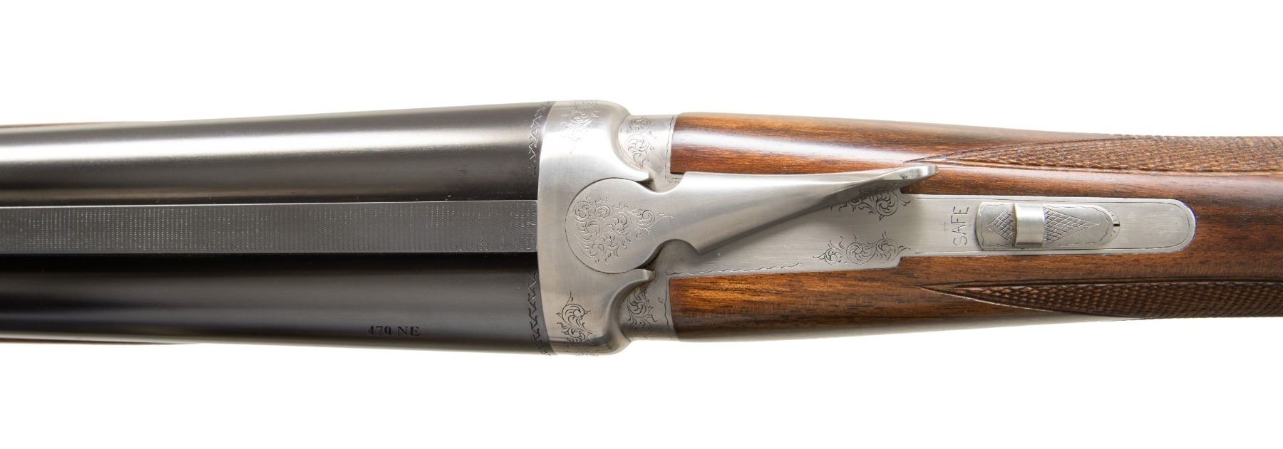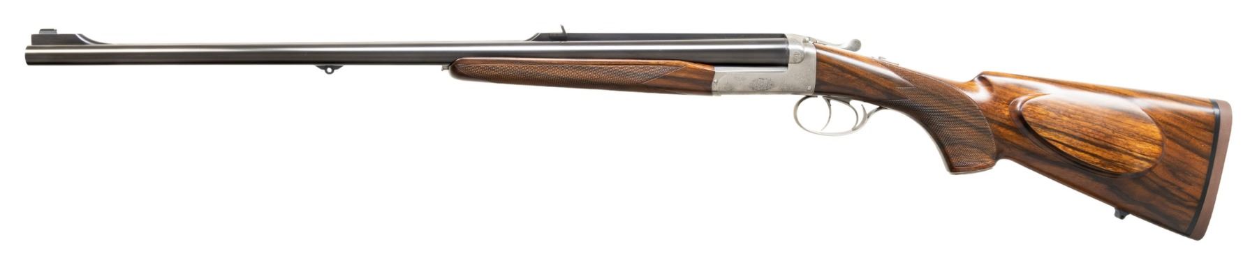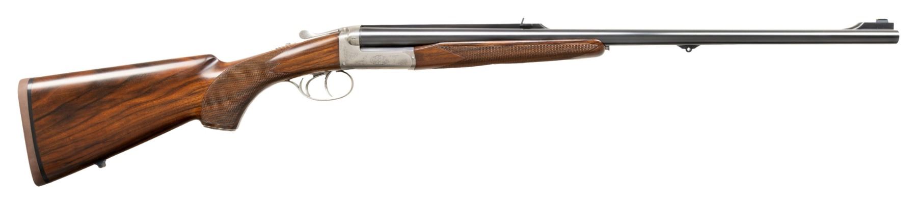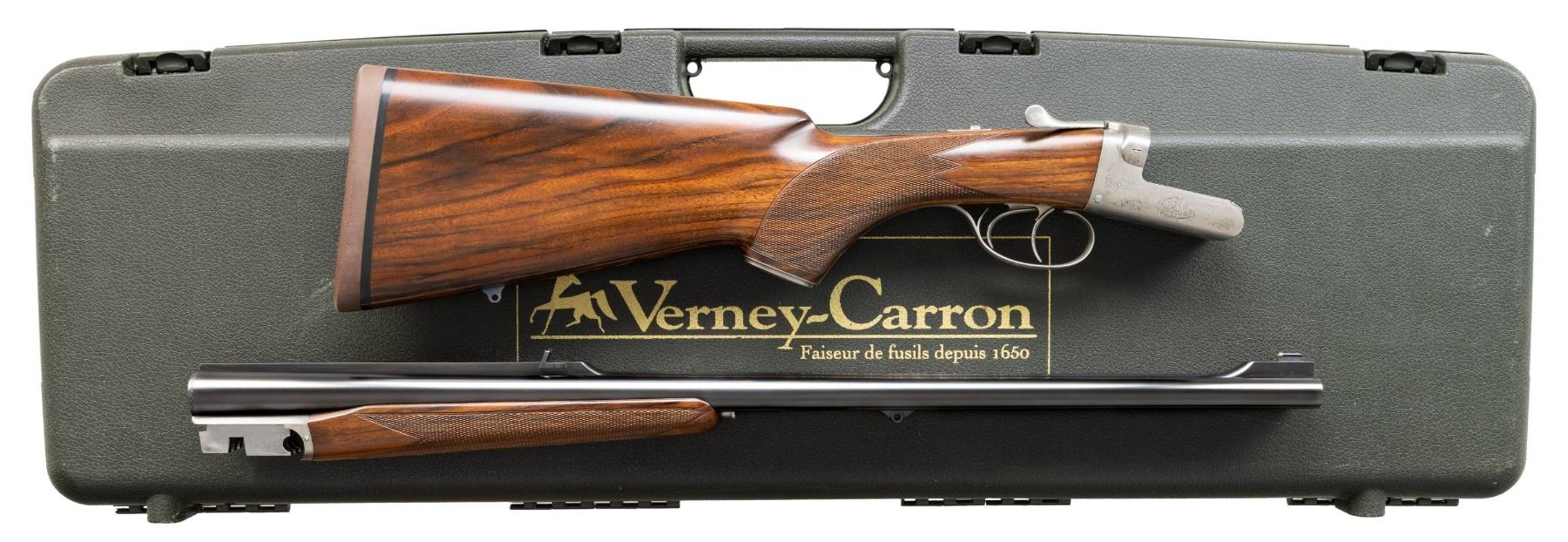 DANGEROUS GAME DOUBLE RIFLE. Cal. 470 NE. S# A1410. The 24" shoe lump barrels are fitted with matted quarter rib holding one standing express rear sight. Matching front ramp holds silver bead. Mid-rib is engraved "Custom made for John Koegler, North Fork Bullets". Barrel flats and bottoms of barrels are stamped with caliber, French proofs and importer info (Kebco LLC). Coin finished boxlock type action with three bearing points on hinge pin features non-automatic safety, bushed strikers and double triggers. Action is engraved with about 60% coverage rose and scroll; bottom with "L' Atelier Verney -Carron" "Azur Safari" "France". Steel trigger guard has S# on tang that extends to engraved steel grip cap. Pistol grip buttstock of very attractively veined dark European walnut measures 14-3/4" over brown Decelerator pad and features shadow line right hand cheekpiece and point pattern grip checkering. Sling eyes are on toeline and bottom of barrels. Matching beavertail ejector forend has Anson release. UNATTACHED ACCESSORIES: rifle is housed in original black "ABS" foam lined case that contains; snap caps, some cleaning equipment and bags for action and barrel. CONDITION: very fine, close to "as new" with only a few minor handling and assembly marks in all factory finishes. Bores are bright and shiny. Mechanically crisp. Case is fine. A well balanced fine handling rifle. PROVENANCE: From the Buckstix Collection. (25-6348/MGM). MODERN. $8,500-12,500.