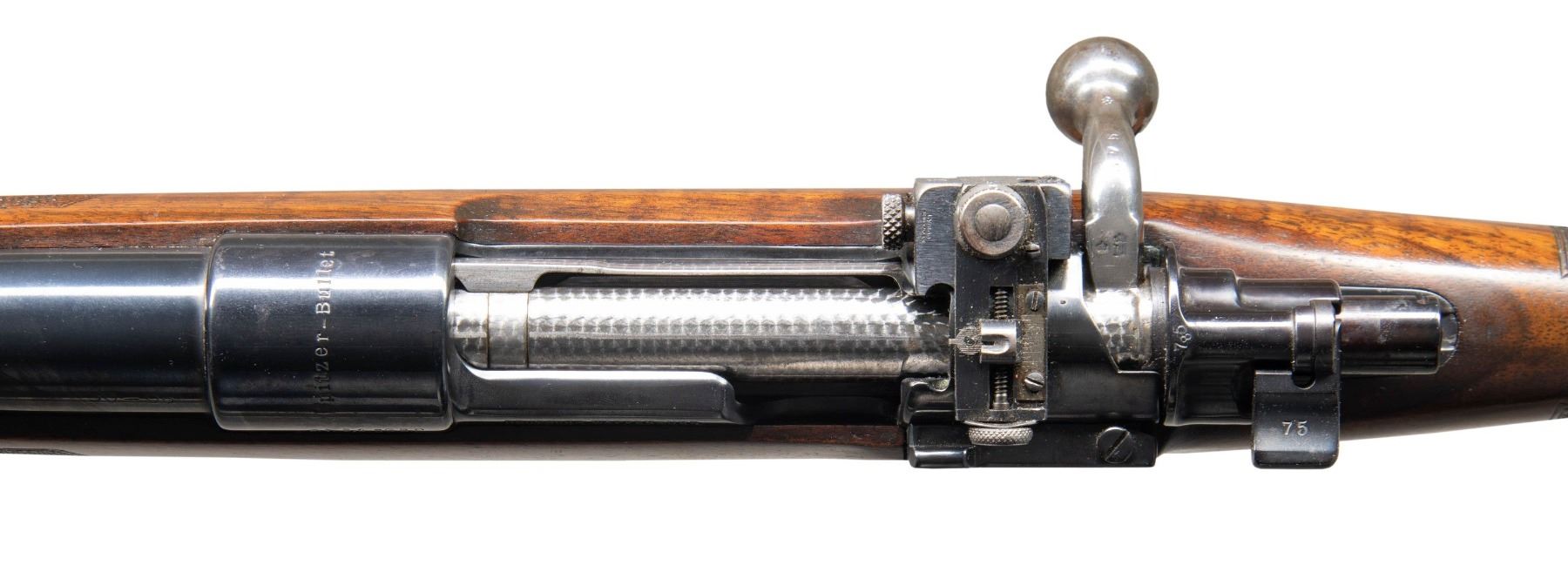 BOLT ACTION RIFLE. Cal. 30-06. S# 375. Bbl. 24" sporter barrel marked "Pfeifer Rifle Co. Roscoe, Calif." ("375" on bottom at rear) having Dahl banded ramped brass bead sight plus Lyman 48 receiver sight on action. Mfg. in the early 1900's as an action and created into a sporter in the middle of the 20th century with typical popular features of the period. Commercial Model 98 action with matching numbers on entire bolt assembly. Top of receiver ring marked "Sptizer-Bullet" having "375" serial number on the right side; left side has pre 1912 black powder proofs along with Crown N proof. Bolt body is jeweled as is the extractor and follower. Military K-98 style bolt and safety. Hinged commercial (no lock screws) trigger guard assembly as seen on Model 1909 Argentine actions (released by using a bullet tip) proofed on front with 3 tangent rings and internally numbered "318". All metal is gloss blued. Military style 2 stage trigger. Stock is "California" style with roll over Monte Carlo cheek piece, checkered Neidner style blued steel buttplate, detachable sling swivel bases plus Cocobolo forend tip and grip cap on its teardrop shaped grip. Checkering is skip line in grip area (made popular by Weatherby) plus 2 conventional panels on forend. Joe Pfeifer was a renowned rifle maker and arguably the best barrel maker of his time. CONDITION: very good overall appearance with near excellent blued finish. Wood to metal fit is of the highest quality with a barrel pressure point near tip of forend. Classic lines at ejection port area and around bolt release. Nice skip line grip checking having fine execution; forend checking is not of the same quality and may have been done at a later date; possibly uncheckered initially. Finish has appearance of Lin-Speed oil finish with some handling marks and traces of porosity. It appears it would be significantly benefited by buffing and the addition of more hand rubbed finish. Near excellent bright bore. PROVENANCE: From the Buckstix Collection. (25-6391/NW). CURIO. $800-1,200.
