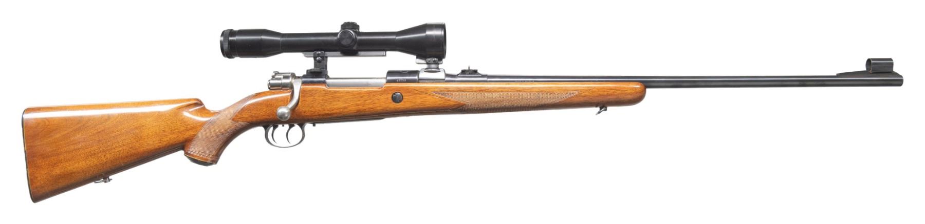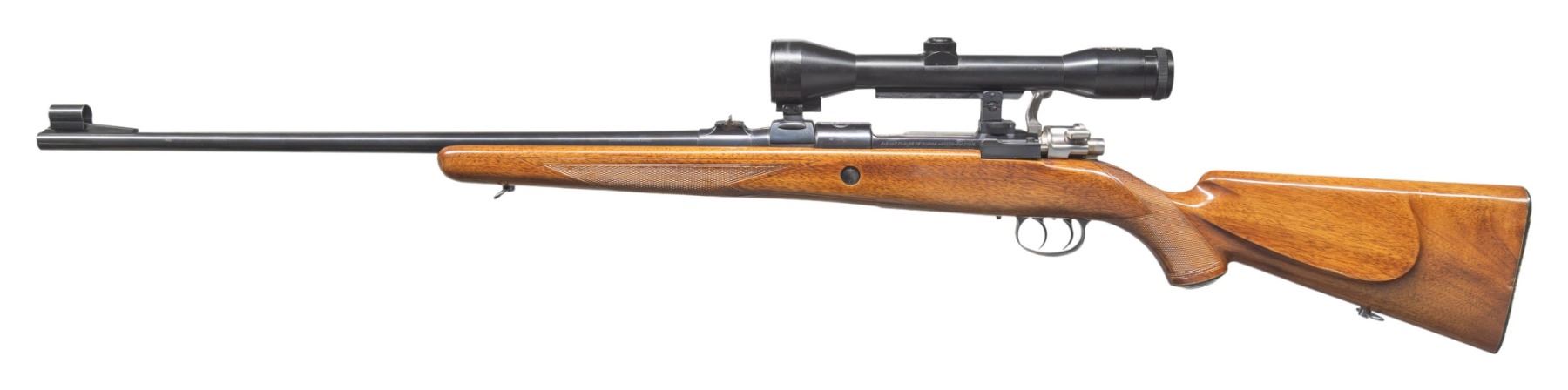 Cal. 8X60MM S. S# 45738. Bbl. 24" sporter with hooded dovetailed brass bead on base with serrated face; rear sight on island base with 2 folding leafs marked "200" and "300" along with fixed leaf marked "100". Mfg. 1947-1963 as new production rather than a converted military action. Top of front action bridge has FN logo plus it is drilled and tapped for a scope base (plug screws installed). Action of Commercial Model 98 style with matching numbered bolt and barrel. In the white bolt has swept back handle, claw extractor and Model 98 military style flag safety. Checkered European walnut stock has single stock reinforcement bolt, 1 1/4" sling swivels, straight comb. raised cheek piece, rounded forend, grip cap and "FN" marked serrated buttplate. Triggerguard assembly fitted with double set triggers and push button release on floorplate. Fitted with German Mayoscope 6X42 scope having German #4 reticle and rail mounting system. CONDITION: very good general appearance with light handling marks on stock plus a couple of faint oxidation spots on metal by front sight bead and around front scope base. All other aspects are near excellent including bore and scope set. PROVENANCE: From the Buckstix Collection. (25-6433/NW). CURIO. $1,000-1,500.