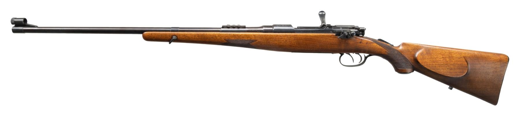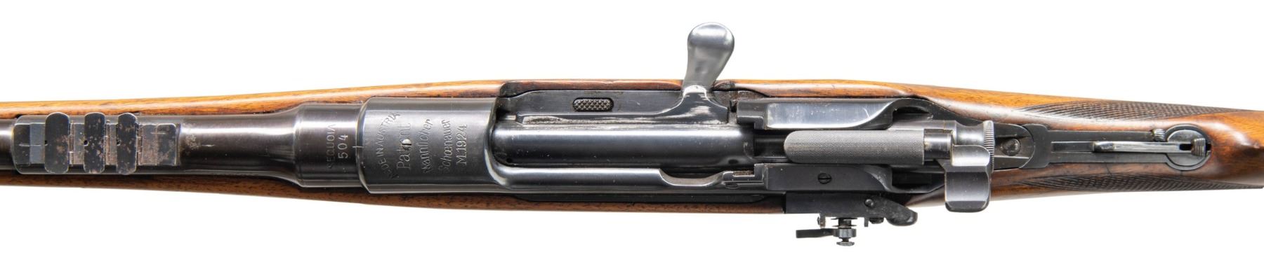 SPORTING RIFLE. Cal. 8x60 mm. S#. 1101. Bbl. 24" tapered round. Ramp mounted bead front sight is equipped with an over size modern hood. The original rear sights consist of a 3 folding leaf express sight on the barrel with a peep sight that folds in the top tang. Left side of receiver is equipped with the base only for an added receiver sight. The front ring and left side of the receiver have several added holes with plug screws for scope mount attachment. Half length cheekpiece walnut stock features a horn grip cap, steel trapdoor buttplate, sling swivel bases and hand checkering. The breech end of the bbl. is stamped "SEQUOIA / 504" referring to Sequoia Importing Co. of San Francisco. The model 1924 was originally chambered only in .30-06. After 1933 it was chambered for 6 cartridges including the 8x60mm. The rifle with additional chamberings was known in Europe as the model 1925. CONDITION: metal surfaces retain the majority of their reblued finish. Refinished stock shows a few marks and slightly weakened checkering. Darkened bore retains strong rifling. (25-5043/DS). CURIO. $1,000-1,500.