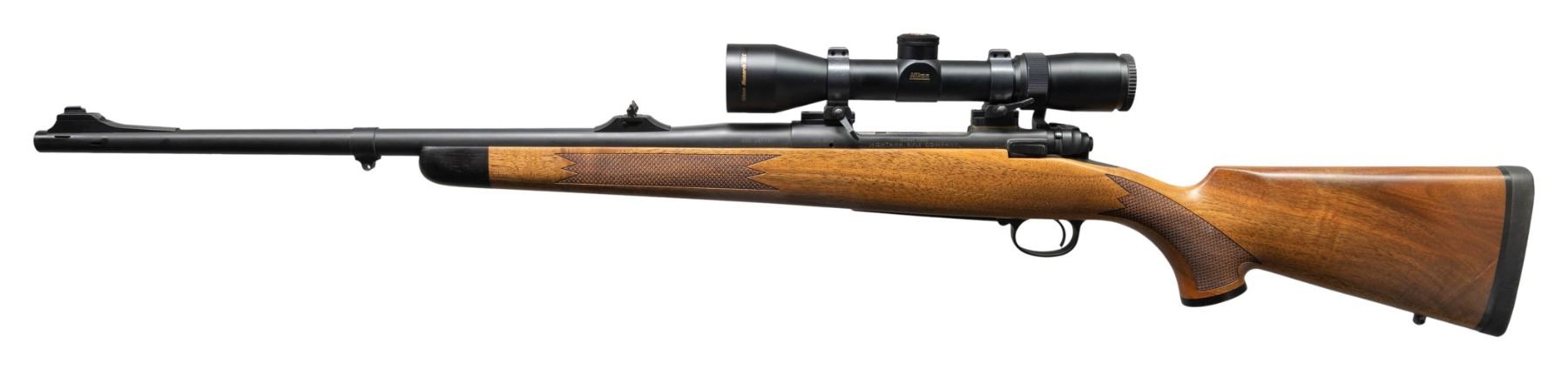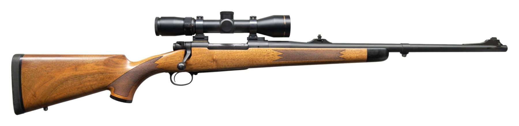 ACTION RIFLE. Cal. 404 Jeffery. S# C05-0052. Mfg. 2005. Magna-ported 22" bbl. NECG Ramp mounted white bead front sight & island mounted fixed rear sight. Nikon Monarch Gold UCC 1.5-6x 42 fast focus, duplex scope on Talley QD rings & bases. Control-feed action is a hybrid of Model 70 & Model 98 w/ claw extractor & 3 position safety. Walnut stock w/ fish scale checkering, ebony forearm tip, ebony grip cap & Decelerator black pad. CONDITION: very good to near excellent metal finish with a spot of finish loss on right side front sight ramp & flaking finish right side rear receiver bridge. Near excellent wood finish with scattered dings in stock. Near excellent rifling. Scope has near excellent finish with serviceable optics. PROVENANCE: From the Buckstix Collection. (25-6470/MD). MODERN. $2,500-3,500.