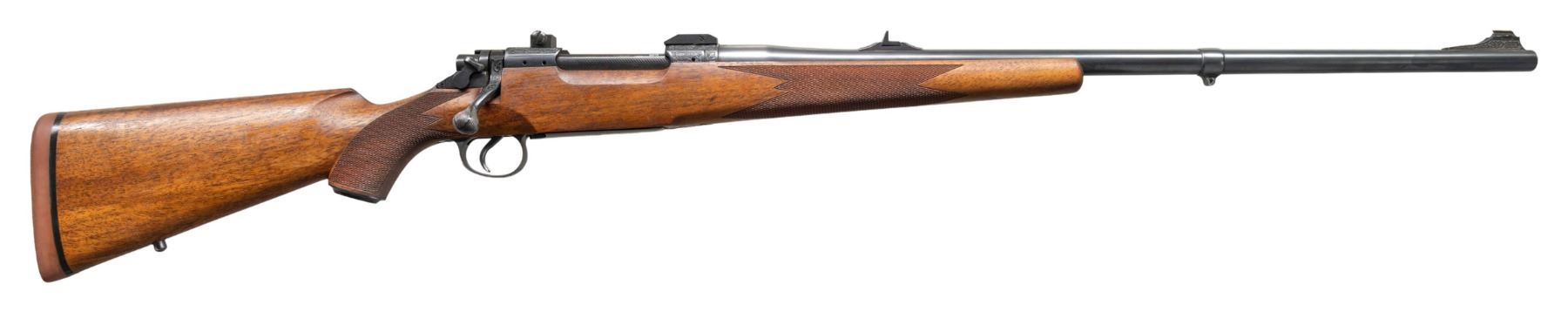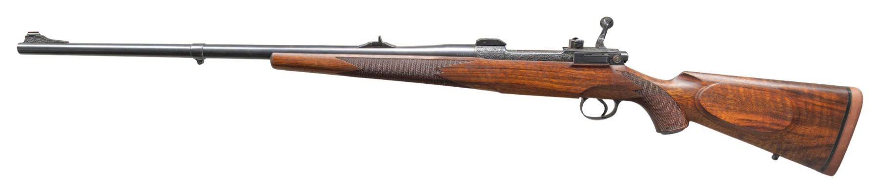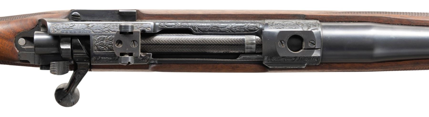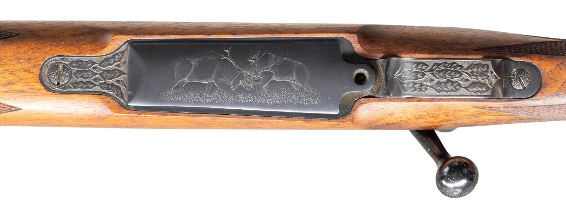 RIFLE CONSIGNOR STATES BY ROY VAIL. Cal. 8x68 S. S# 156 (on action race way). The 26" medium weight round barrel is fitted with island base holding standing leaf rear sight; sleeved on sling eye and short front ramp holding gold bead. Ramp and rear base are engraved with oak leaves; caliber is on left side rear. 1917 action has had rear sight ears removed, magazine straighted, bolt handle reshaped and checkered with three panels. Scope bases are also fitted. Bolt still remains "cock on closing". Action and bottom metal are engraved with near full coverage semi-relief oak leaves and acorns. Left side top of bridge is engraved "MADE IN U.S.A." and monogram "GHP" is in relief on left behind bolt stop. Floorplate is engraved with well done scene of battling caribou. A squirrel is on steel grip cap. No engraver's signature is found, except for possible monogram. Traditionally styled pistol grip stock made of lightly figured American walnut measures 14" over brown "Old English" pad. Stock features shadow line right hand cheekpiece, point pattern checkering and sling eye on toeline. CONDITION: very fine retaining essentially all custom finishes on all wood and metal. Bore is bright, sharp and shiny. Mechanically fine. (25-5045/MGM). CURIO. $1,500-2,250.