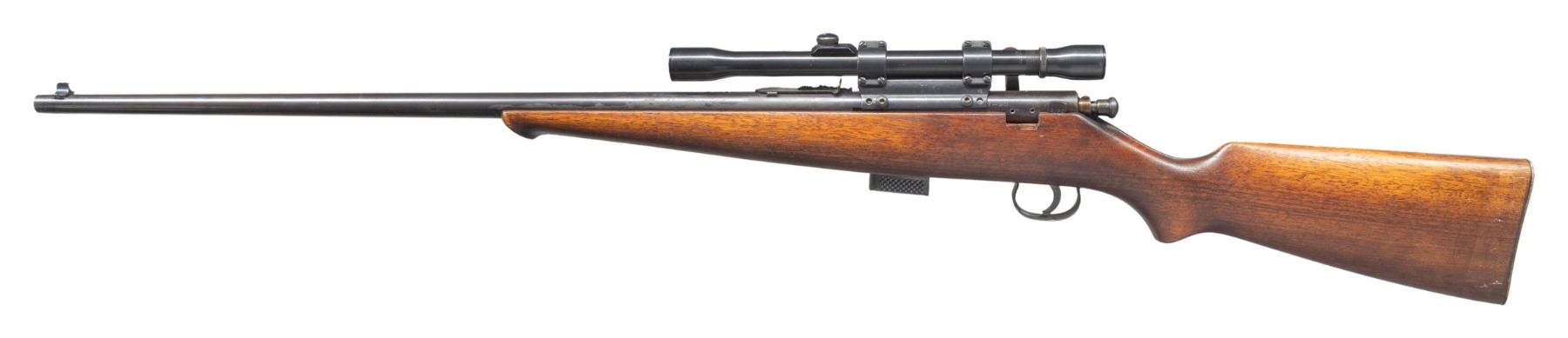 Cal. 25-20. NSN. Bbl. 24 3/4". Gold bead front sight. Adjustable rear sight. Receiver mounted Weaver J4 scope. Scope has fine crosshair reticle & optics that have slight green tint. Bbl. has two added holes behind address & left rear of receiver has two vacant holes for sight mounting. Blued finish. Walnut pistol grip stock. MAGS: 1-5 rd. CONDITION: stock shows a 1" crack at right of forend tip, some staining & handling marks. Metal retains 50% blue with overall fading, scattered oxidation,oil staining & handling marks. Action functions properly when hand cycled. Bore is mostly bright with a light ring about 1/3 down & strong rifling. PROVENANCE: From the Buckstix Collection. (25-6422/MJC). CURIO. $300-500.