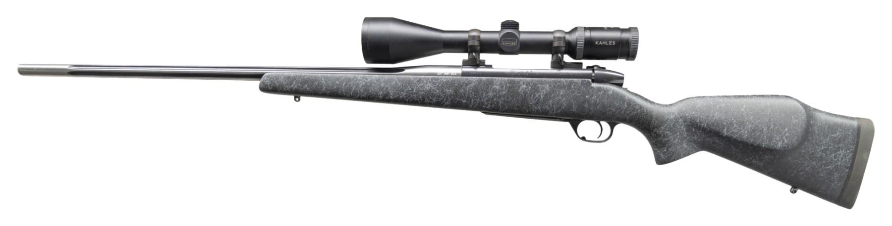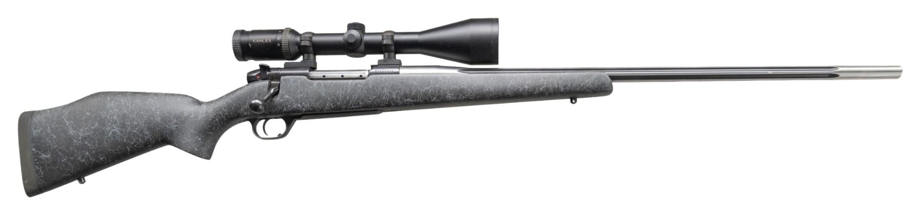 KAHLES SCOPE. Cal. 257 Wby Mag. S# BW004538. Bbl. spun stainless fluted 26" with recessed target crown. Lightweight barrel contour having Graphite Black Cerakote finish in flutes and on receiver; matte alloy triggerguard assembly having gold "W" on bottom of guard bow. Mfg. in USA from 1994-2004 as indicated by "BW" serial prefix. Short lift action with 9 locking lugs. Leupold matte finished QR bases and corresponding 30MM scope rings. Kahles matte finished Helia C 3-12X56 scope with German duplex reticle (4 square topped posts plus center crosswire). Uncheckered charcoal colored hand laid fiberglass stock with light grey spider web paint finish over matte gel coat plus detachable sling swivel bases and black Decelerator recoil pad. Great long range hunting rifle that is light weight having top quality scope set plus pad to reduce felt recoil. 257 Weatherby Magnum caliber is known for its superior accuracy and touted by Weatherby as their most accurate offering. CONDITION: all aspects near excellent including bore and scope set. (25-4788/NW). MODERN. $1,000-1,500.