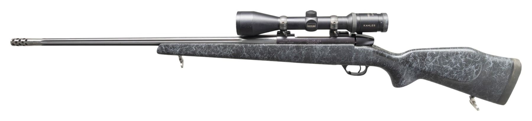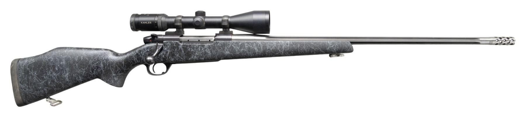 KAHLES SCOPE. Cal. 340 Wby Mag. S# SB045818. Bbl. spun stainless fluted 26" to include 1 1/8" of Gentry style muzzle brake. Lightweight barrel contour with Graphite Black Cerakote finish in flutes and on receiver; matte alloy triggerguard assembly having gold "W" on bottom of guard bow. Mfg. in USA from 1994-2004 as indicated by "SB" serial prefix. Short lift action with 9 locking lugs. Leupold matte finished QR bases and corresponding 30MM scope rings. Kahles matte finished Helia C 2.5-10X50 scope with German duplex reticle (4 square topped posts plus center crosswire). Uncheckered charcoal colored hand laid fiberglass stock with light grey spider web paint finish over matte gel coat plus detachable sling swivel set and black Decelerator recoil pad. Great big game hunting rifle that is light weight having top quality scope set plus brake and pad to reduce felt recoil. CONDITION: marks on triggerguard assembly and light staining on barrel near muzzle; all other aspects are near excellent to include bore and scope set. (25-4782/NW). MODERN. $1,000-1,500.