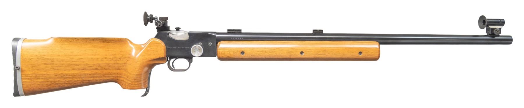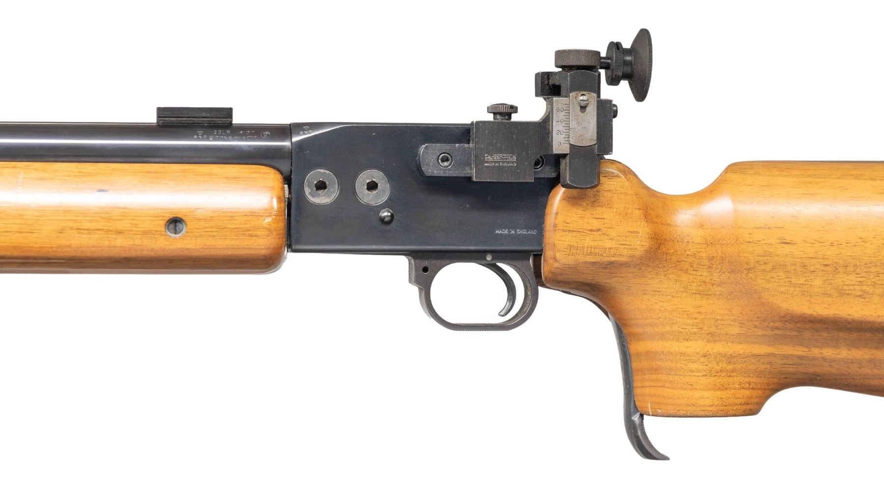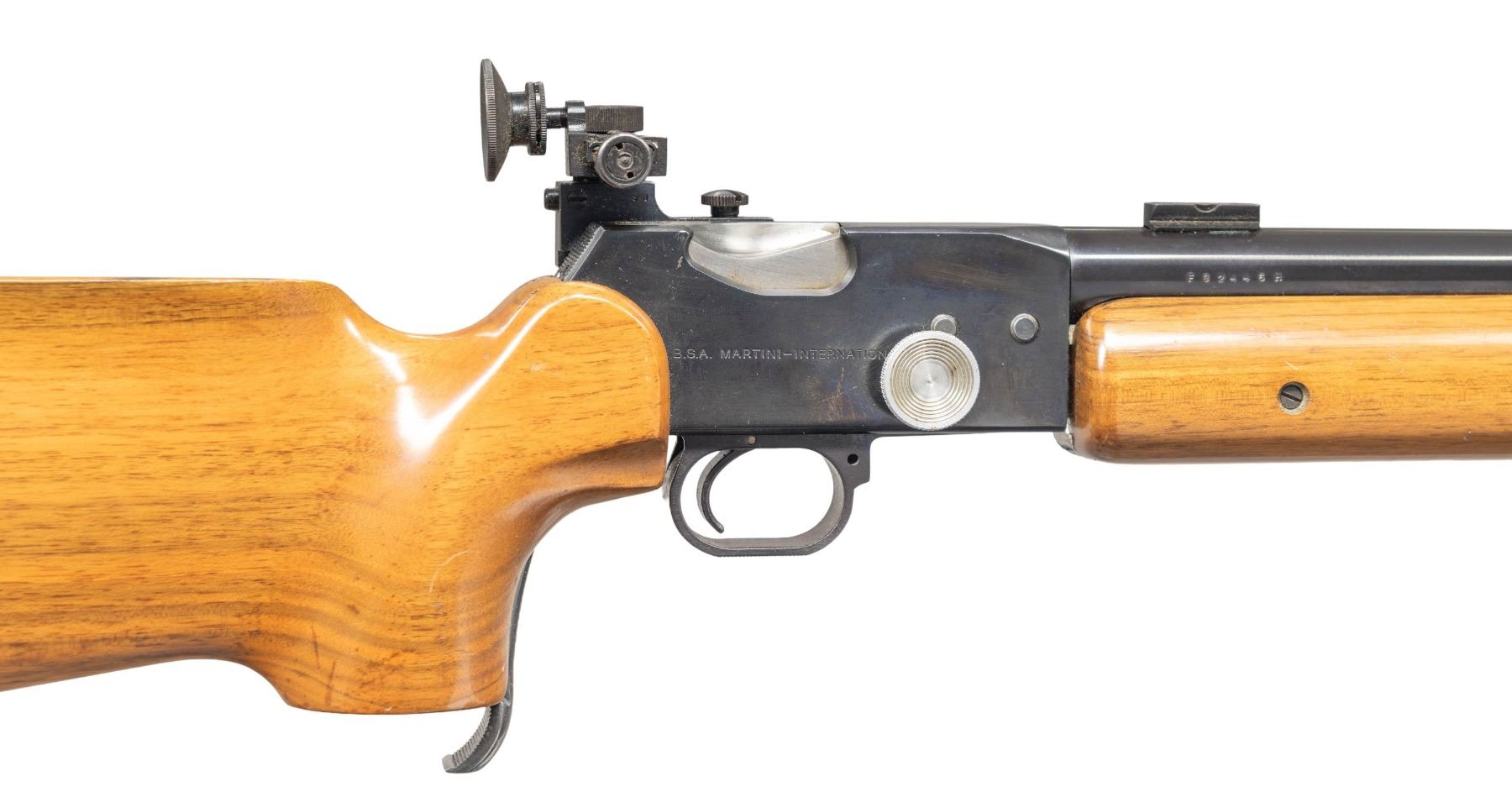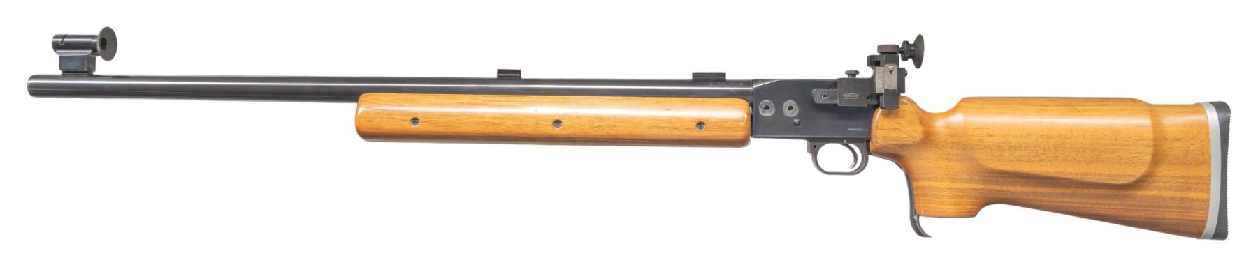 TARGET RIFLE. Cal. 22 LR. S# FG2446H. Bbl. 28" heavy target with recessed crown, unmarked Unertl style target blocks and Parker-Hale sight set consisting of globe front sight and Receiver sight mounted to a base on left side of receiver. First offered in 1976 as an evolution of the earlier Martini actioned rifles with many modern improvements. Forend is 2 piece with a full aluminum rail attached to the barrel having wood on either side. Buttstock has slight roll over Monte Carlo cheek piece, slight palm swell on its RH pistol grip and adjustable aluminum buttplate with grooved BSA rubber pad. "FG" in serial number indicates right handed model; "FH" is left handed. The "H" suffix of the serial number indicates heavy barrel; "L" was for light pattern. "Secret Code" of "DB" over "3" in a circle on the barrel is the 4th variation stamping indicating made 1979. CONDITION: careful scrutiny may find a small mark on its finish plus it has an elliptical (not repaired) crack in the buttstock at top front just behind the receiver; generally near excellent in all other respects to include the bore. PROVENANCE: From the Buckstix Collection. (25-6457/NW). MODERN. $1,000-1,500.