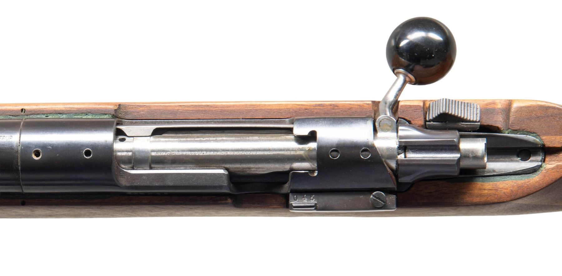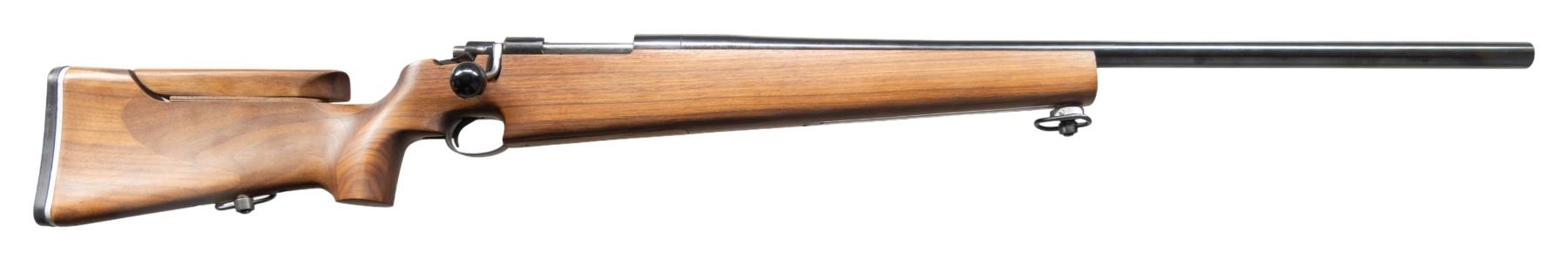 RIFLE. Cal. 308 Win. S# 432045. Bbl. full floating 27 5/8" target with beveled target crown; drilled and tapped (6-48) for target blocks at muzzle and at rear. Mfg. 1960's to 1970's by S&L using surplus military actions; usually Model 98's, but this is from a Model 96. Actions had military markings removed by S&L with new numbers applied; matching numbered bolt and release retaining charging slots plus thumb slot. Latest example by S&L with altered bolt handle for its screw on large black target knob. Bolt shroud altered to remove military safety as the adjustable Parker Hale trigger incorporates a sliding thumb safety. Most Model 69's were in 6.5X55 Swedish Mauser caliber; references list other caliber as 7.62X51 NATO, yet barrel marked "308 WIN.". Stocks made by Otterup had pronounced pistol grips, rubber buttpads and wide, flat bottomed forends with rail like this one that also has an adjustable comb. Uniquely shaped stock to have slight concave shape to right side of butt and extra depth at magazine area with an ingenious removable decorative walnut cover secured with a simple leaf spring. Receiver bridges drilled and tapped (6-48 front and 8-40 rear) for bases allowing for proper 7.2" spaced target scope blocks. Barrel markings indicate Norma of Springfield, MO as the importer, S&L Otterup marks and 86 date. Stock is satin oil finished and glass bedded in action area. CONDITION: an occasional very faint handling mark, but overall close to excellent with near excellent bore. (25-3319/NW). MODERN. $650-900.
